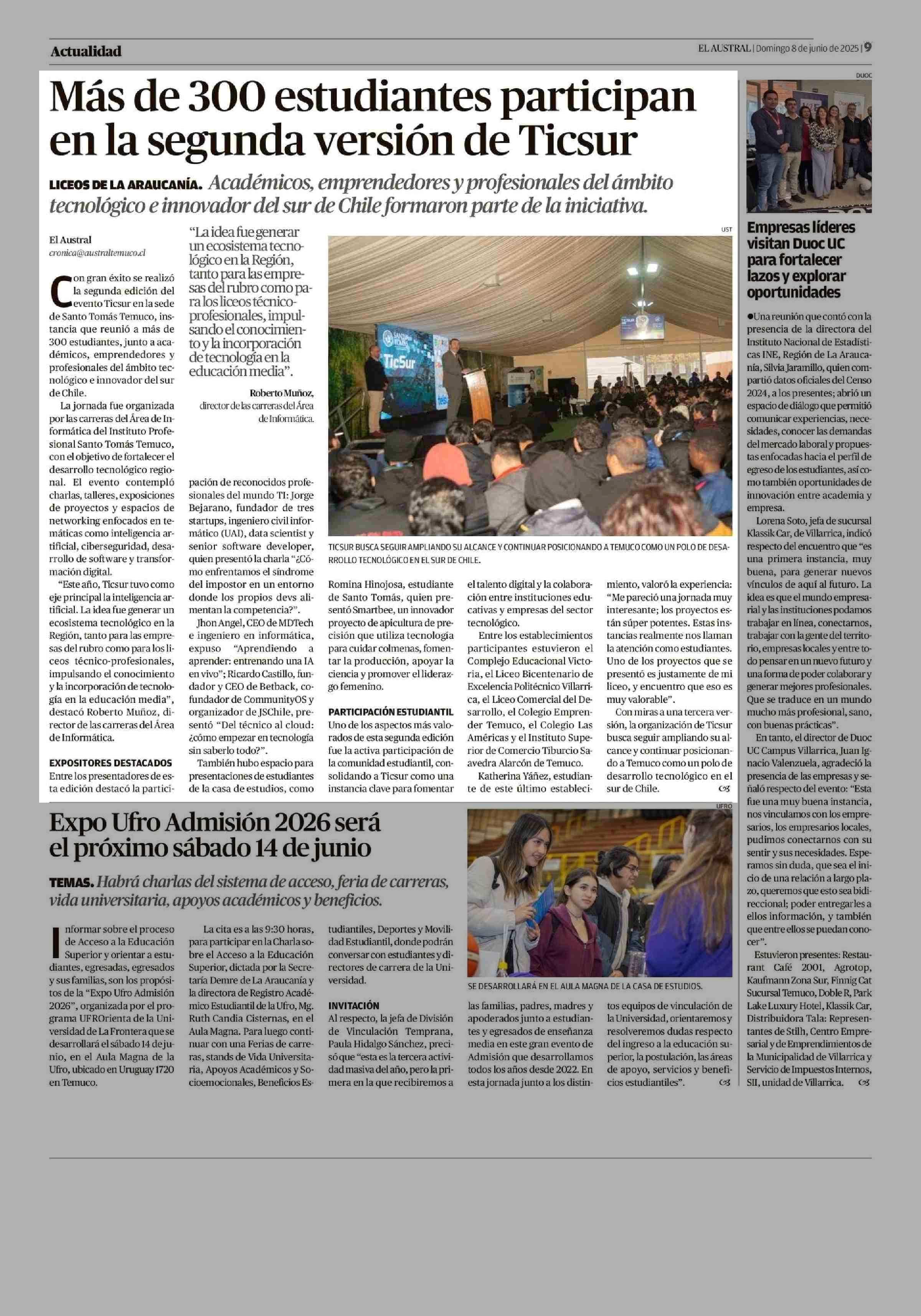 Más de 300 estudiantes participan en la segunda versión de Ticsur 08-06-2025 El Austral de la Araucanía |