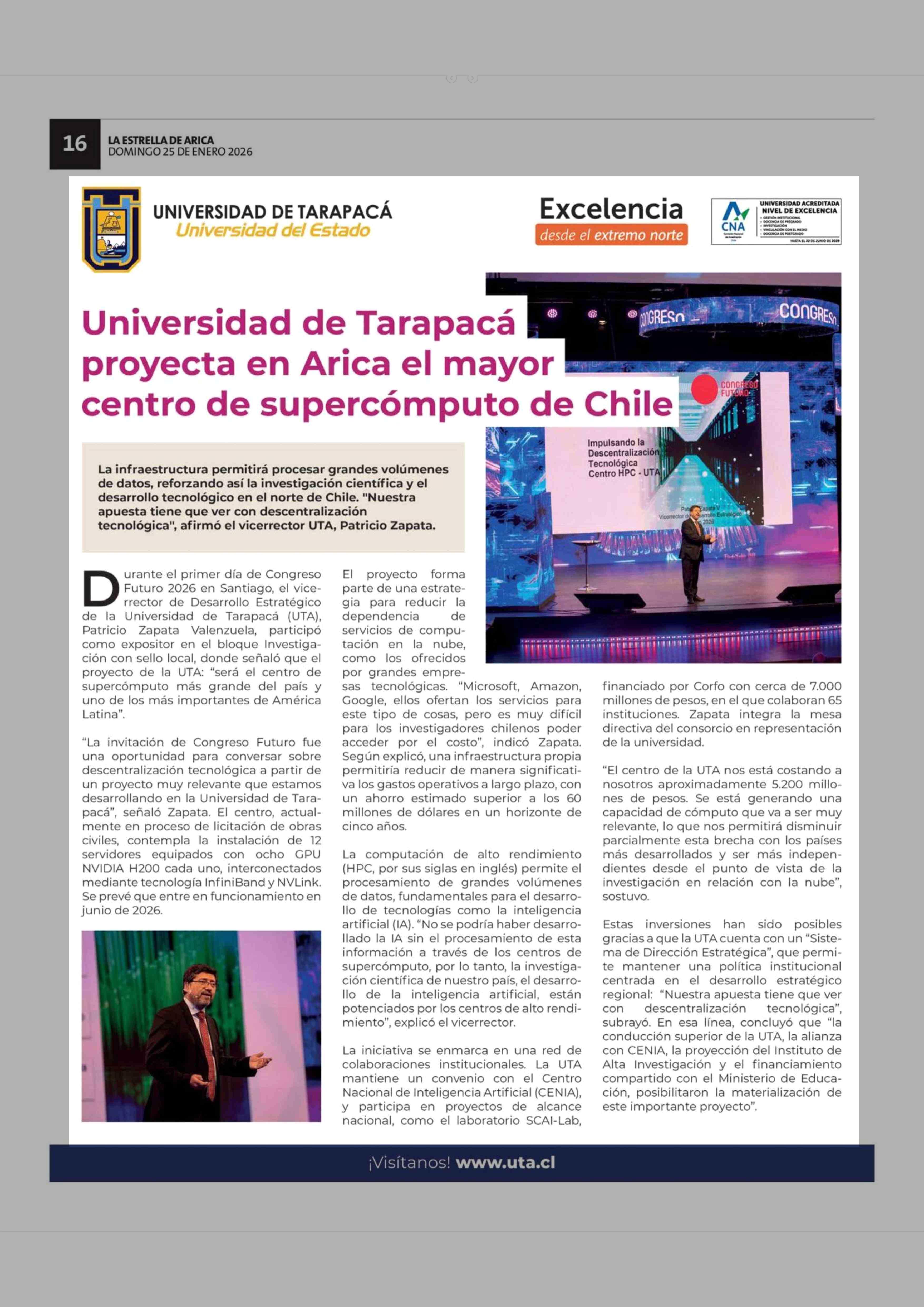 Universidad de Tarapacá proyecta en Arica el mayor centro de supercómputo de Chile 25-01-2026 La Estrella de Arica |