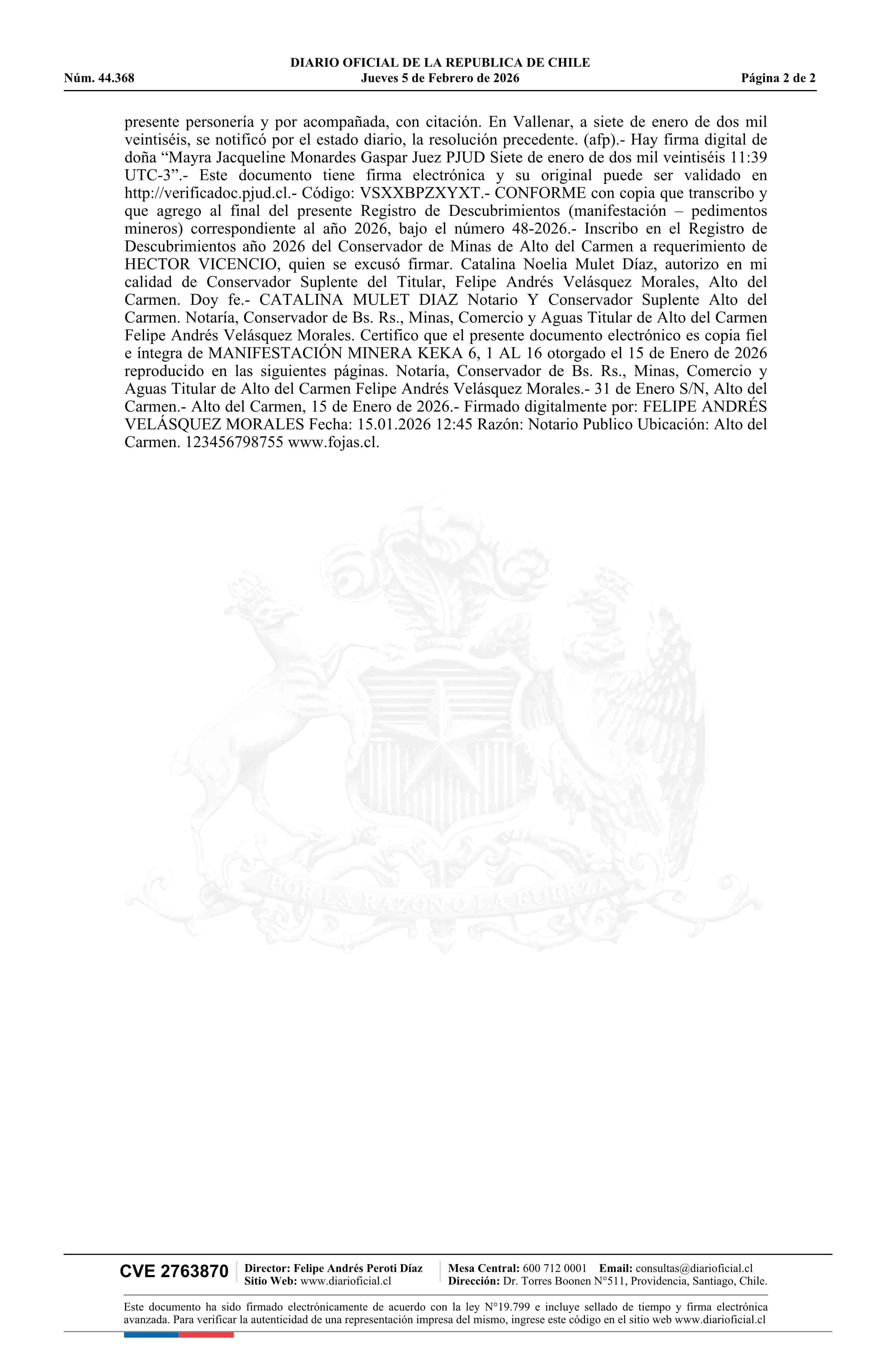 KEKA 6, 1 AL 16 / Compañía Minera Nevada SpA 05-02-2026 DIARIO OFICIAL CHILE - BOLETÍN OFICIAL DE MINERÍA |