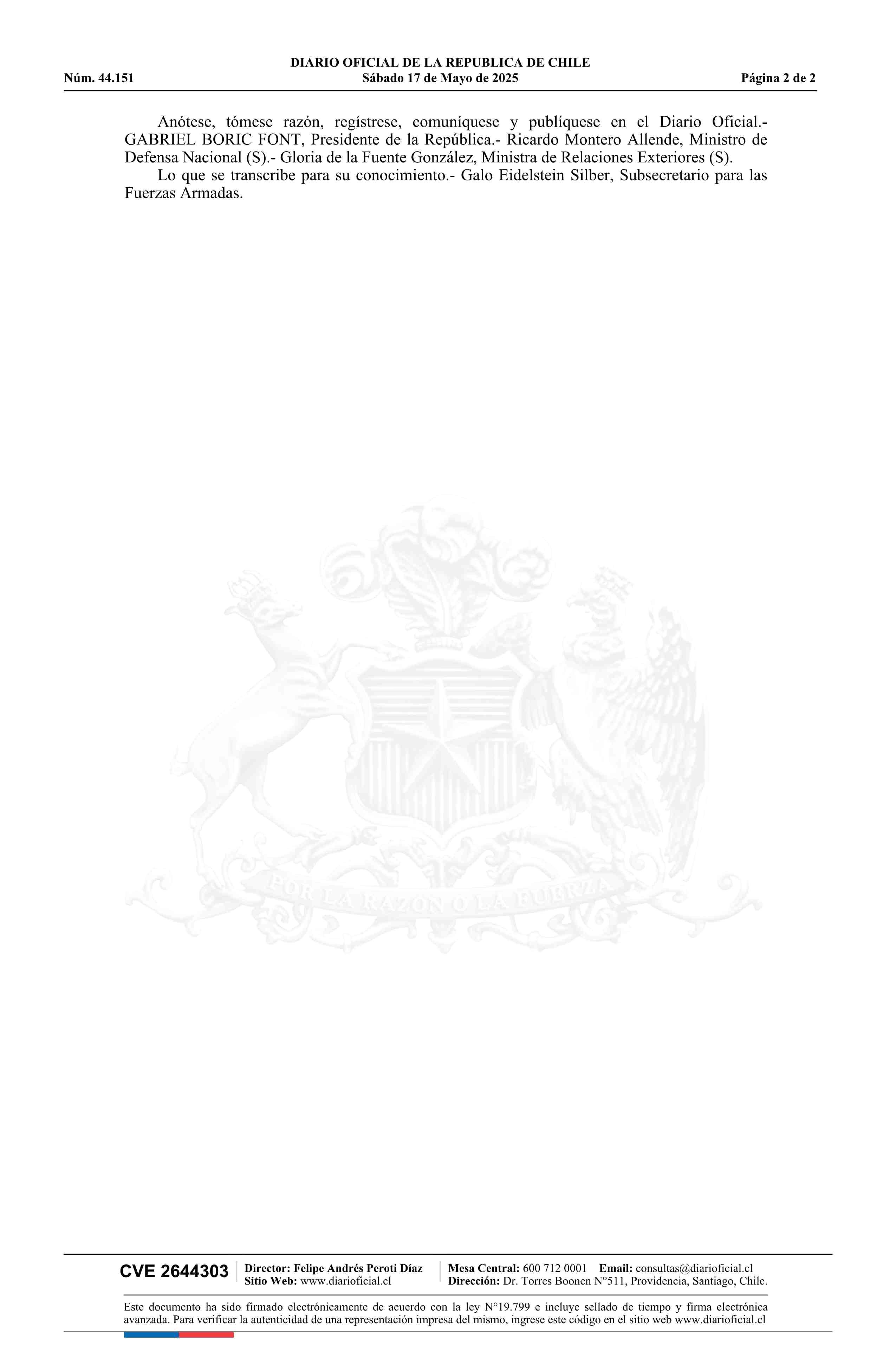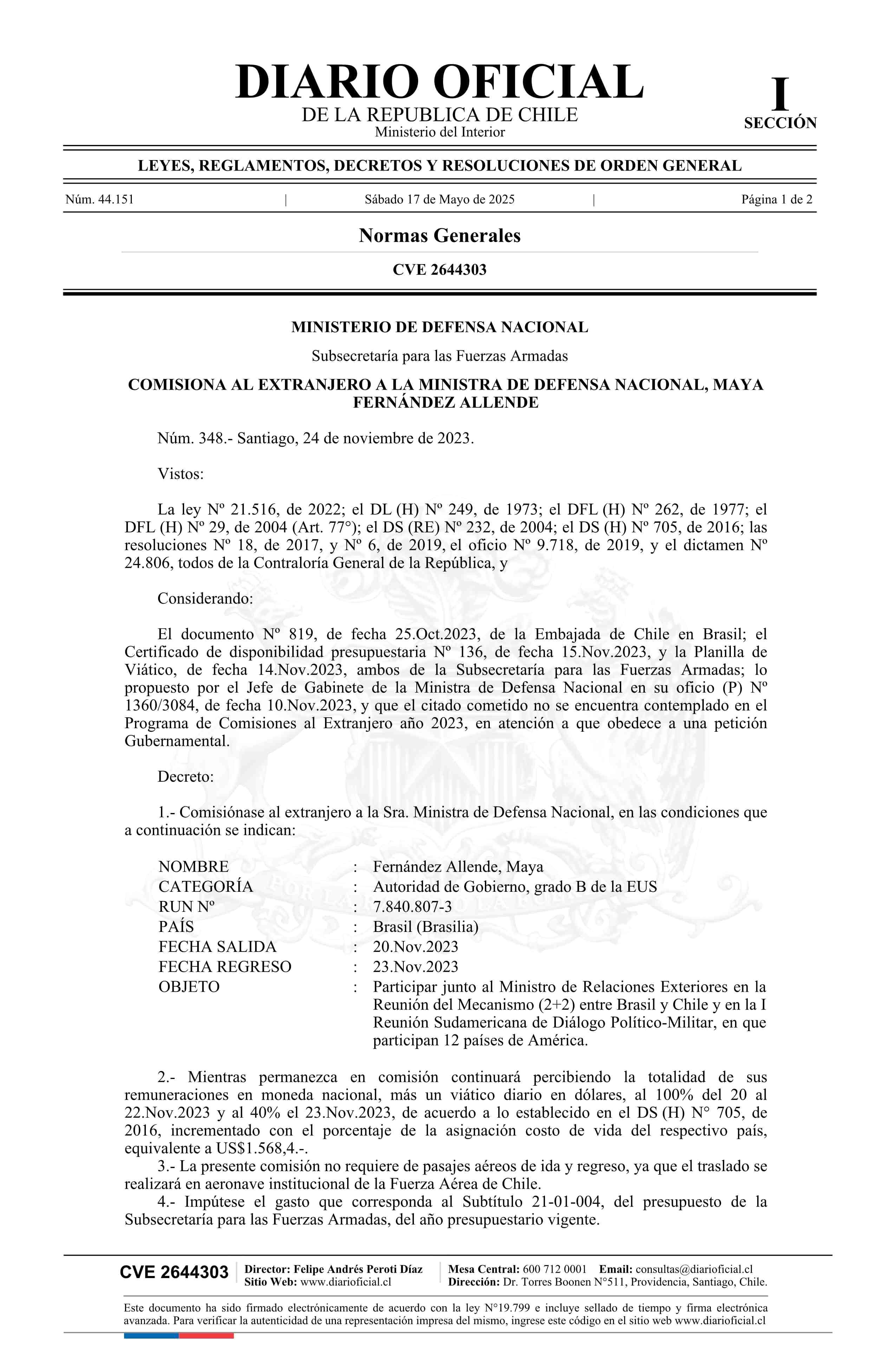 Decreto número 348, de 2023.- Comisiona a doña Maya Fernández Allende, Ministra de Defensa Nacional, a la ciudad de Brasilia, Brasil 17-05-2025 Diario Oficial Edición Electrónica |