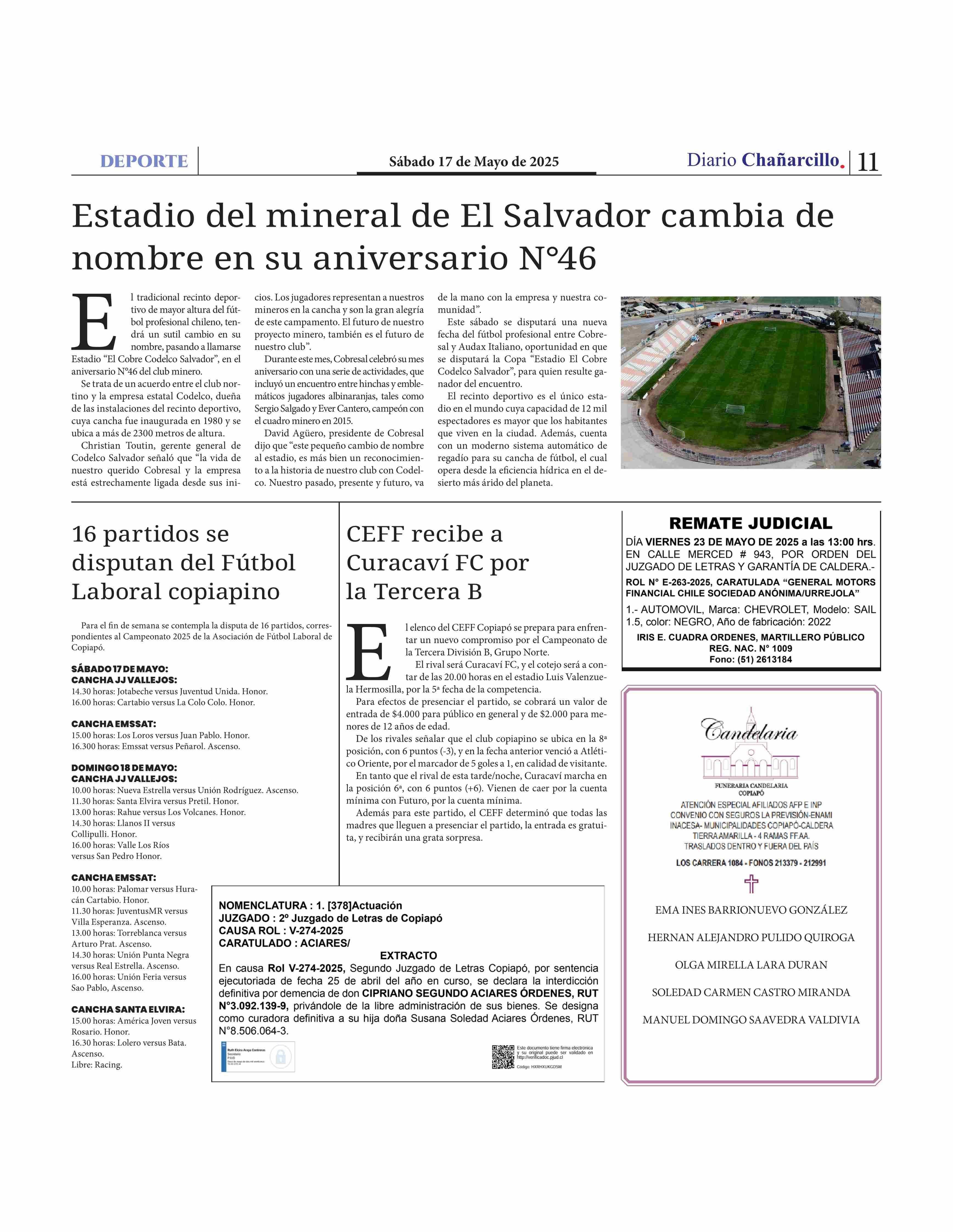 Estadio del mineral de El Salvador cambia de nombre en su aniversario N“46 17-05-2025 Diario Chañarcillo |