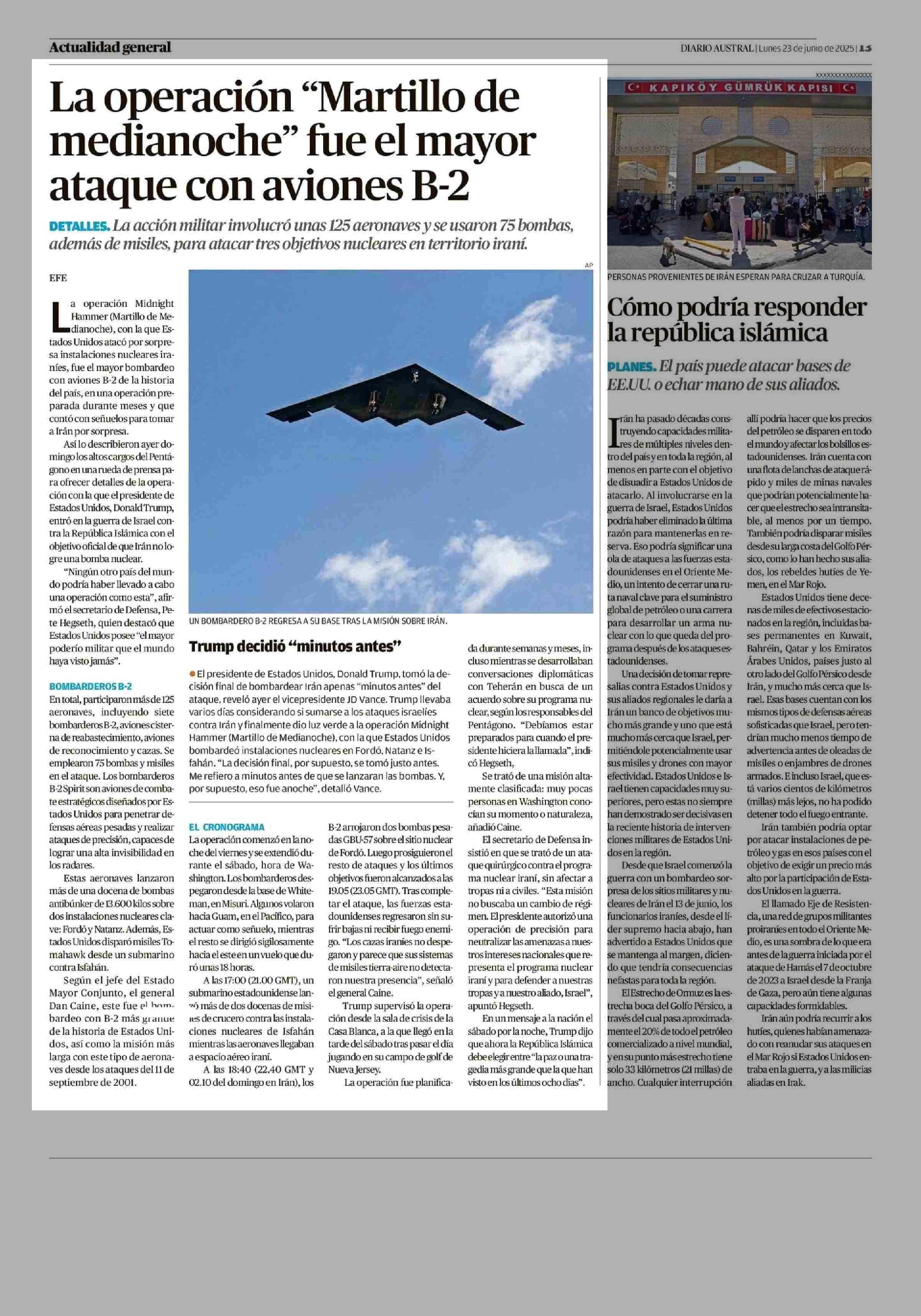 La operación "Martillo de medianoche" fue el mayor ataque con aviones B-2 23-06-2025 Diario Austral Región de Los Ríos |