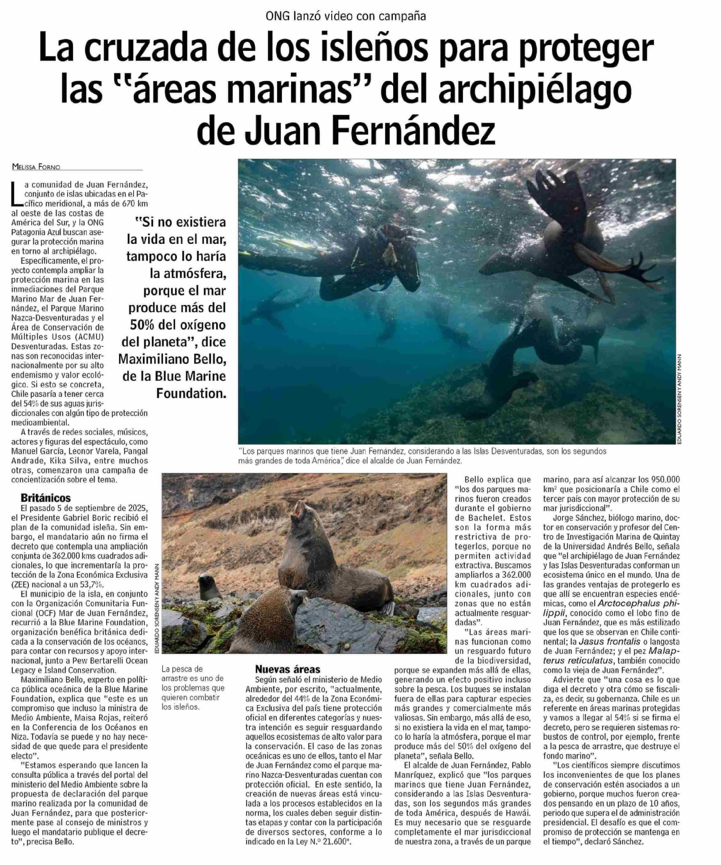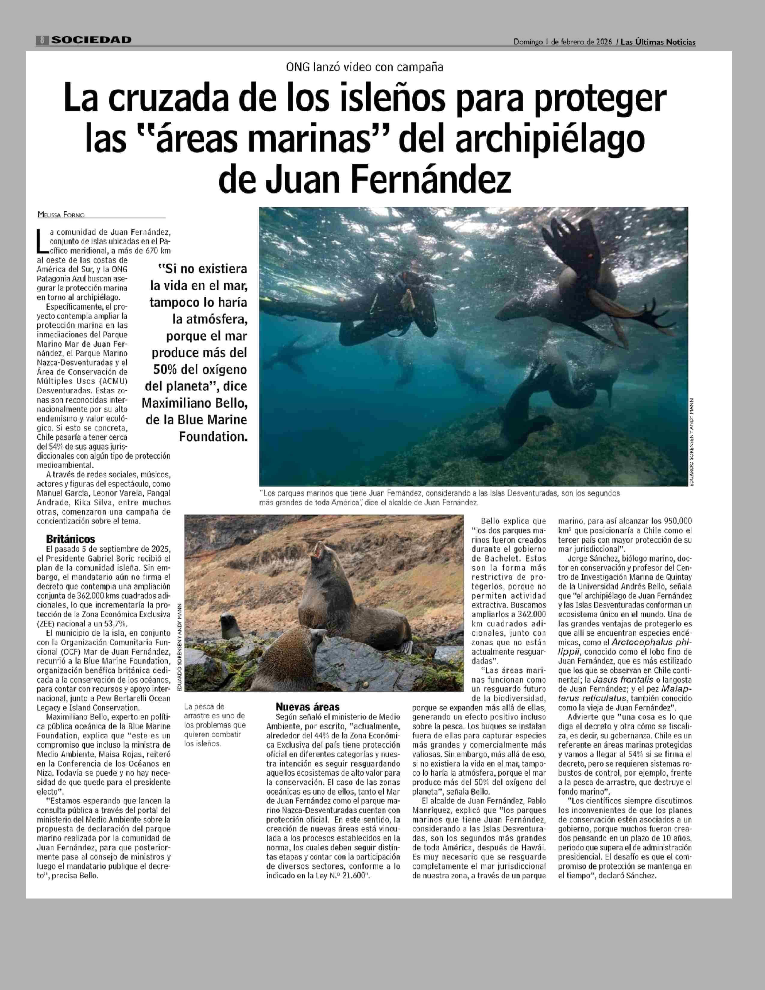 La cruzada de los isleños para proteger las “áreas marinas” del archipiélago de Juan Fernández 01-02-2026 Las Últimas Noticias |
