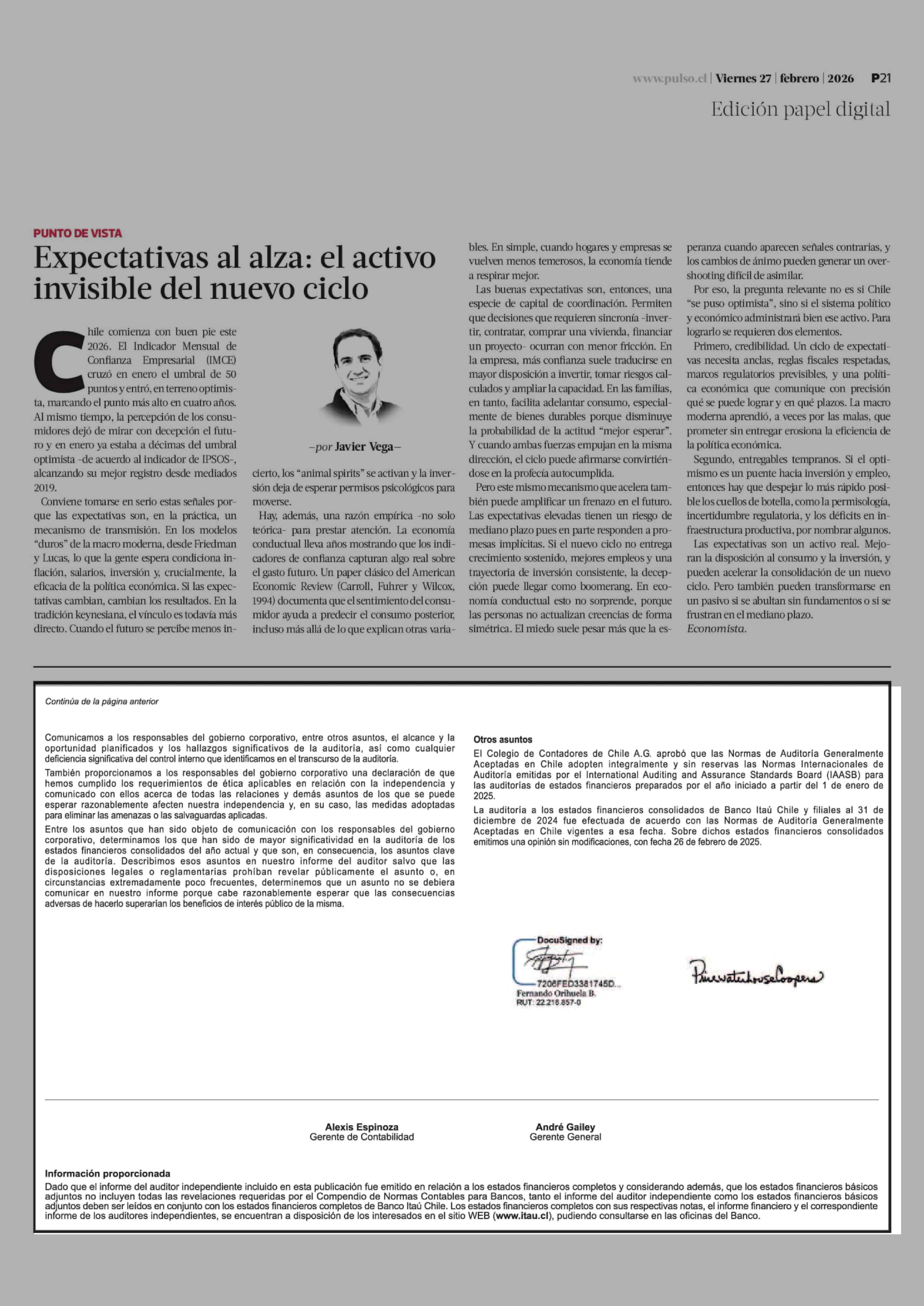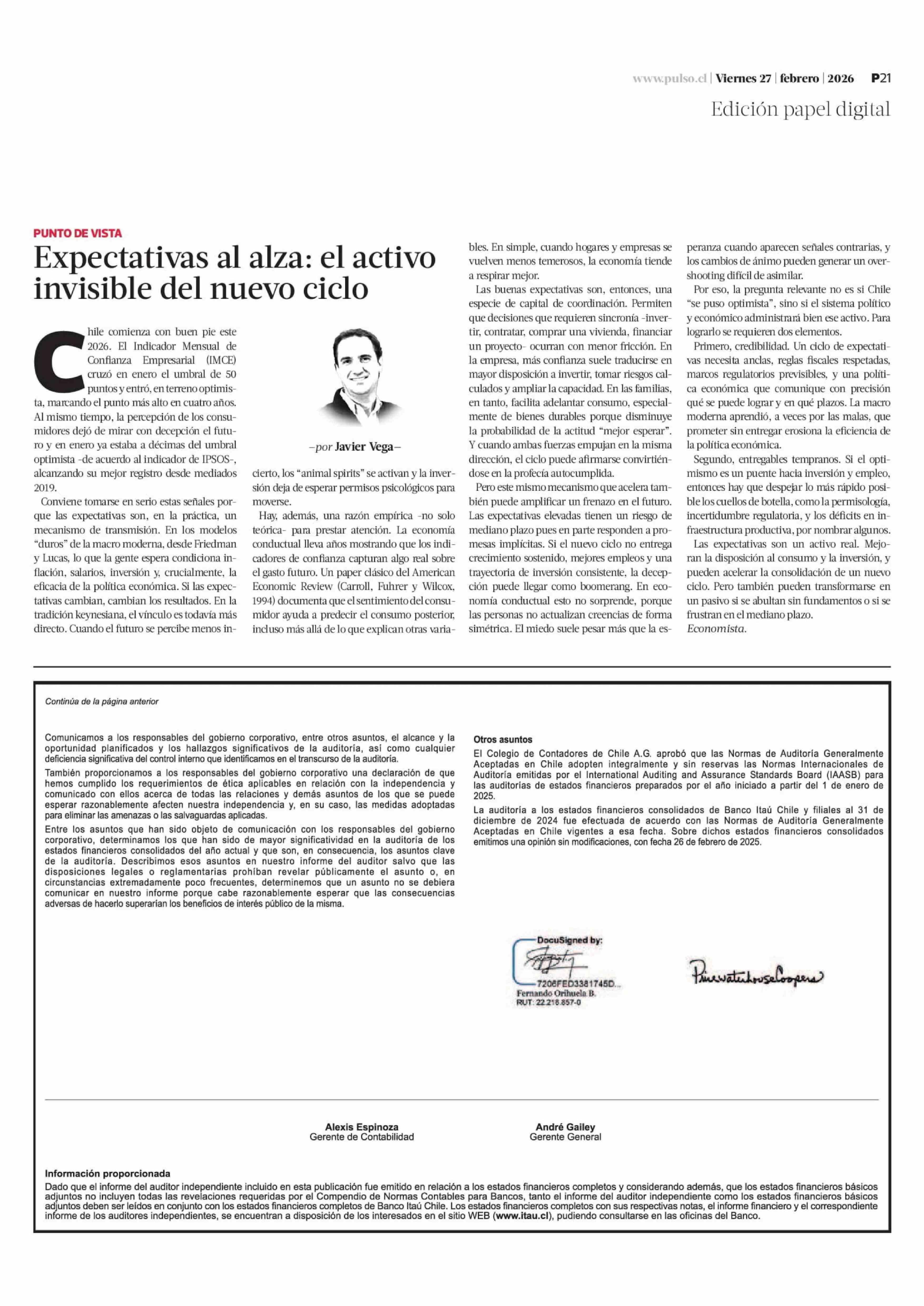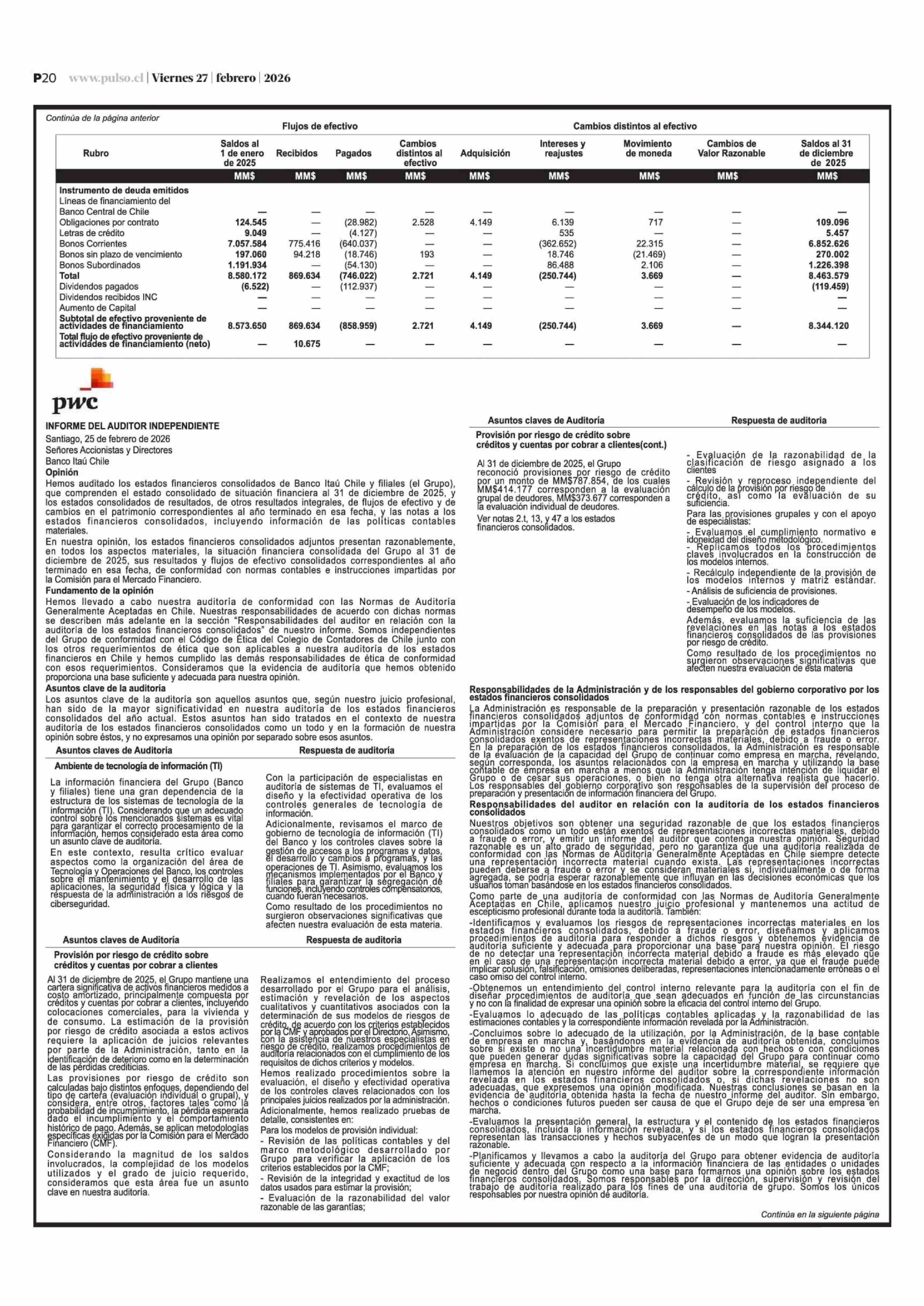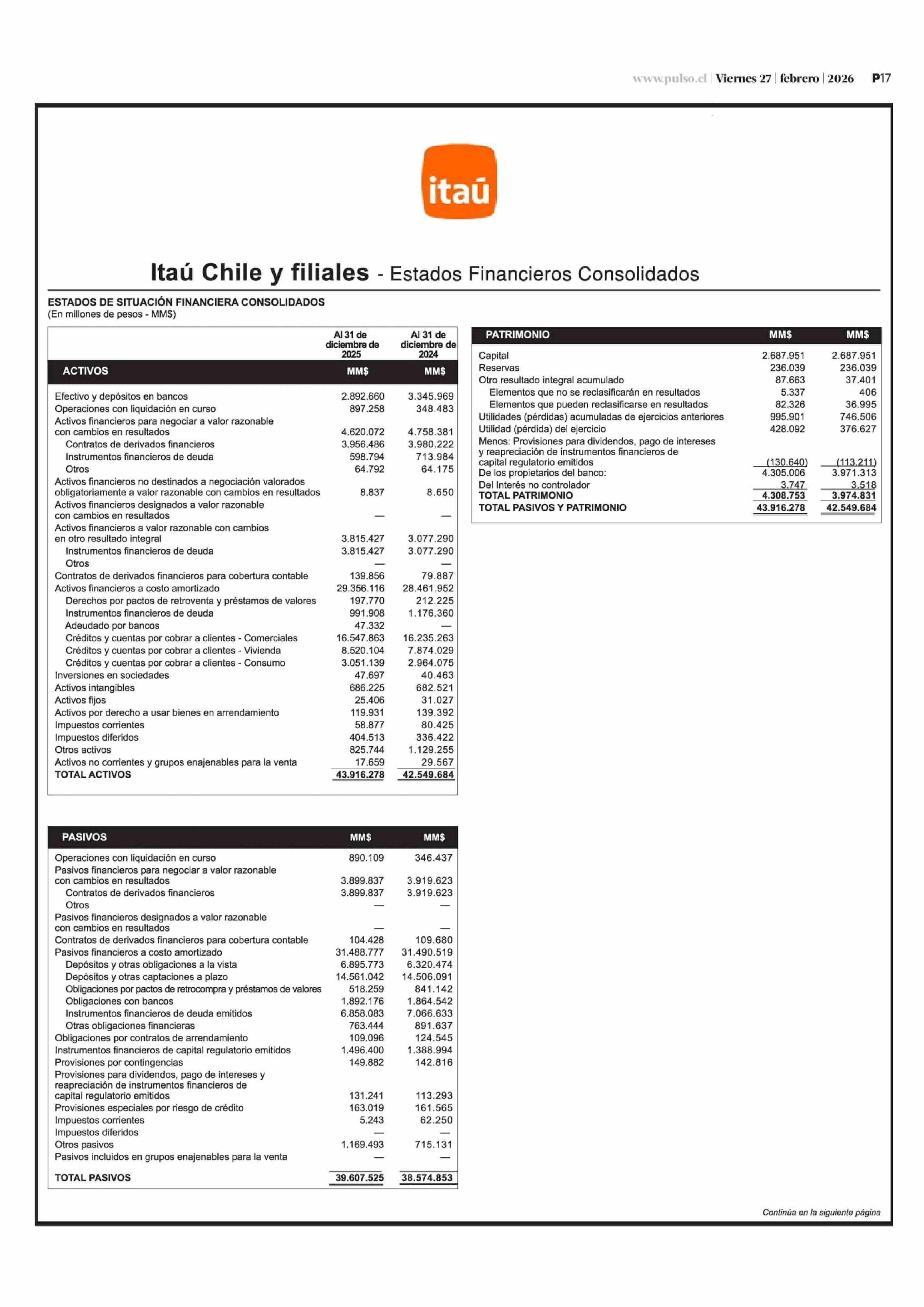 Extractos: Itaú Chile y filiales - Estados Financieros Consolidados 27-02-2026 La Tercera |