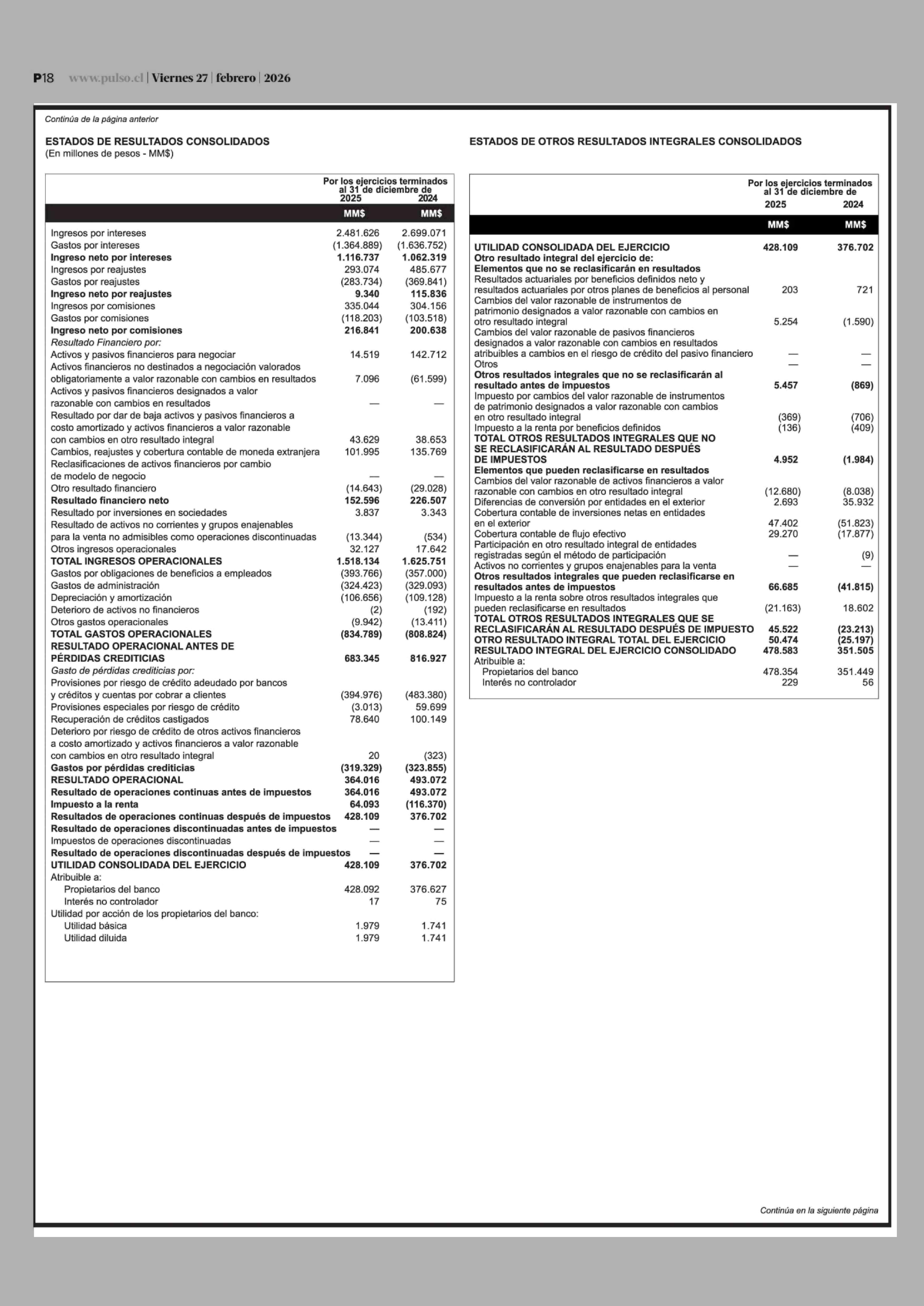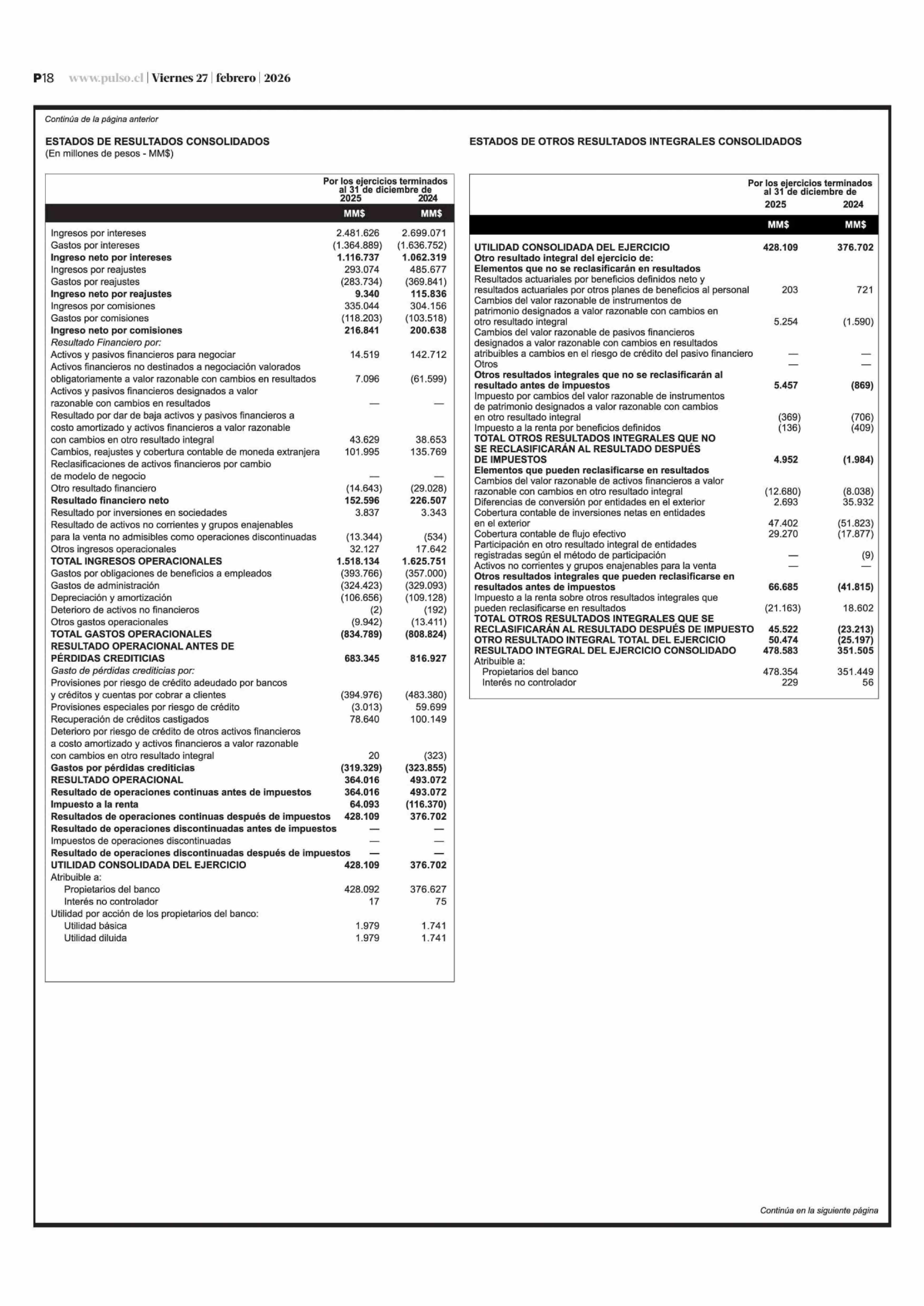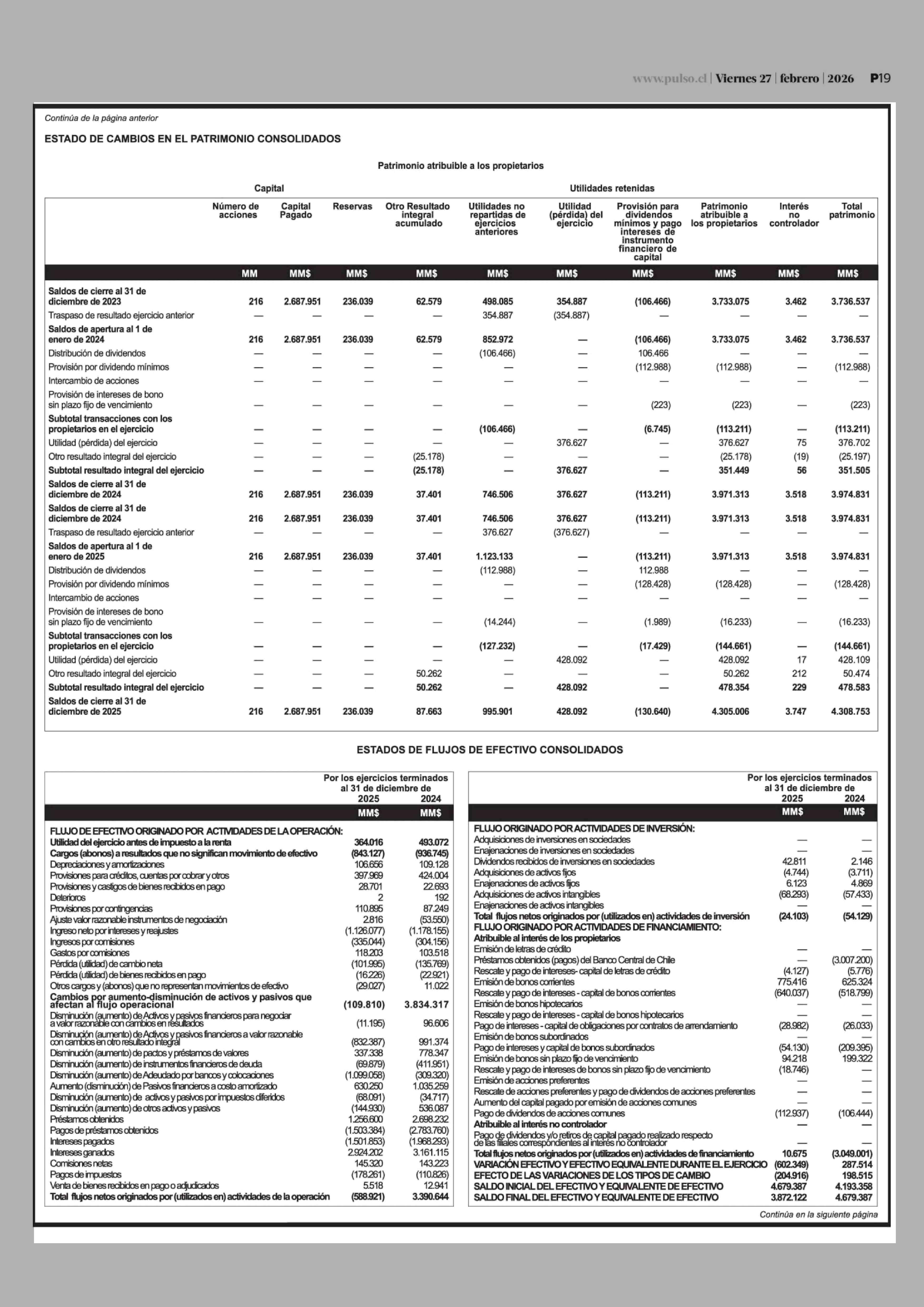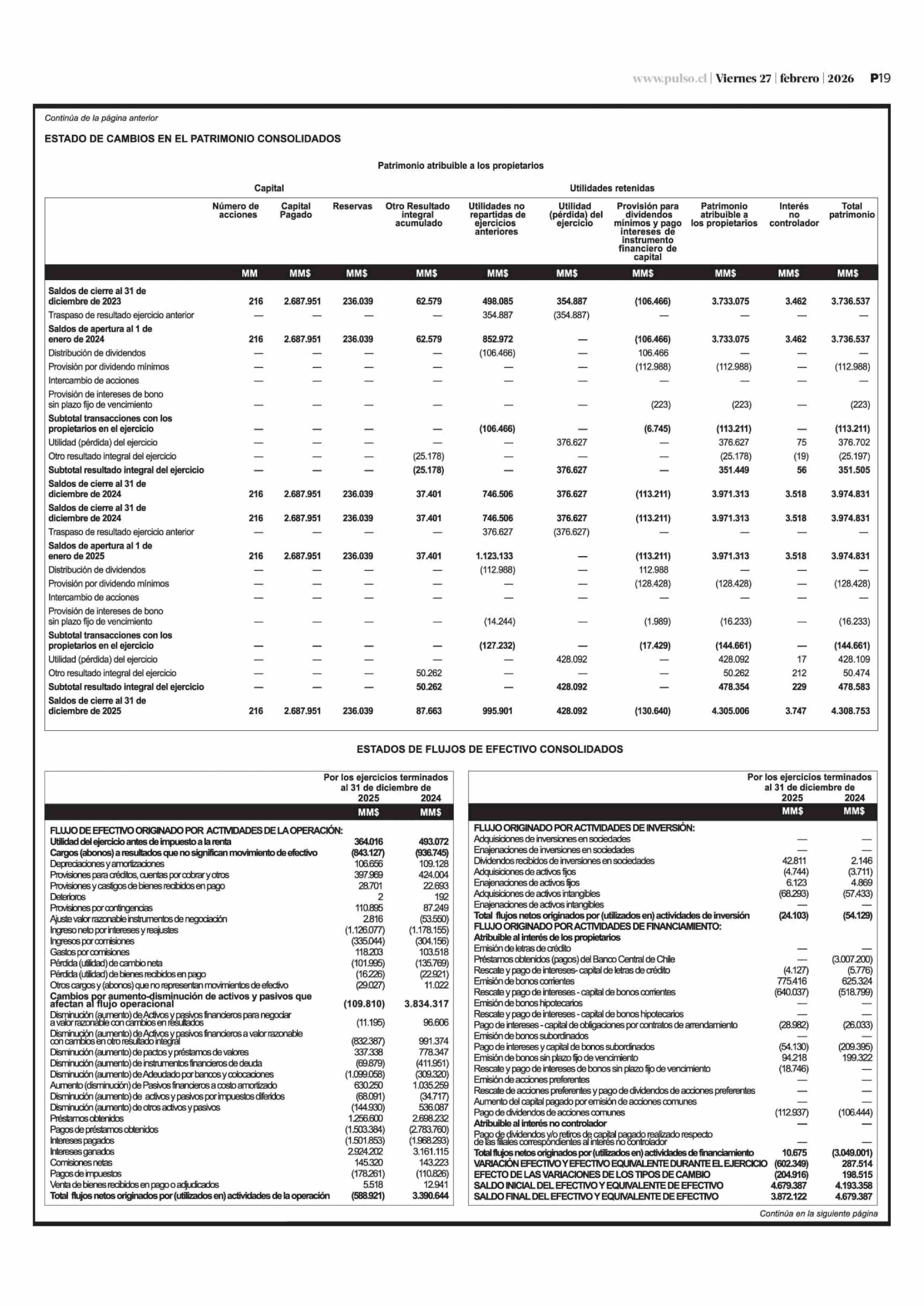Extractos: Itaú Chile y filiales - Estados Financieros Consolidados 27-02-2026 La Tercera |