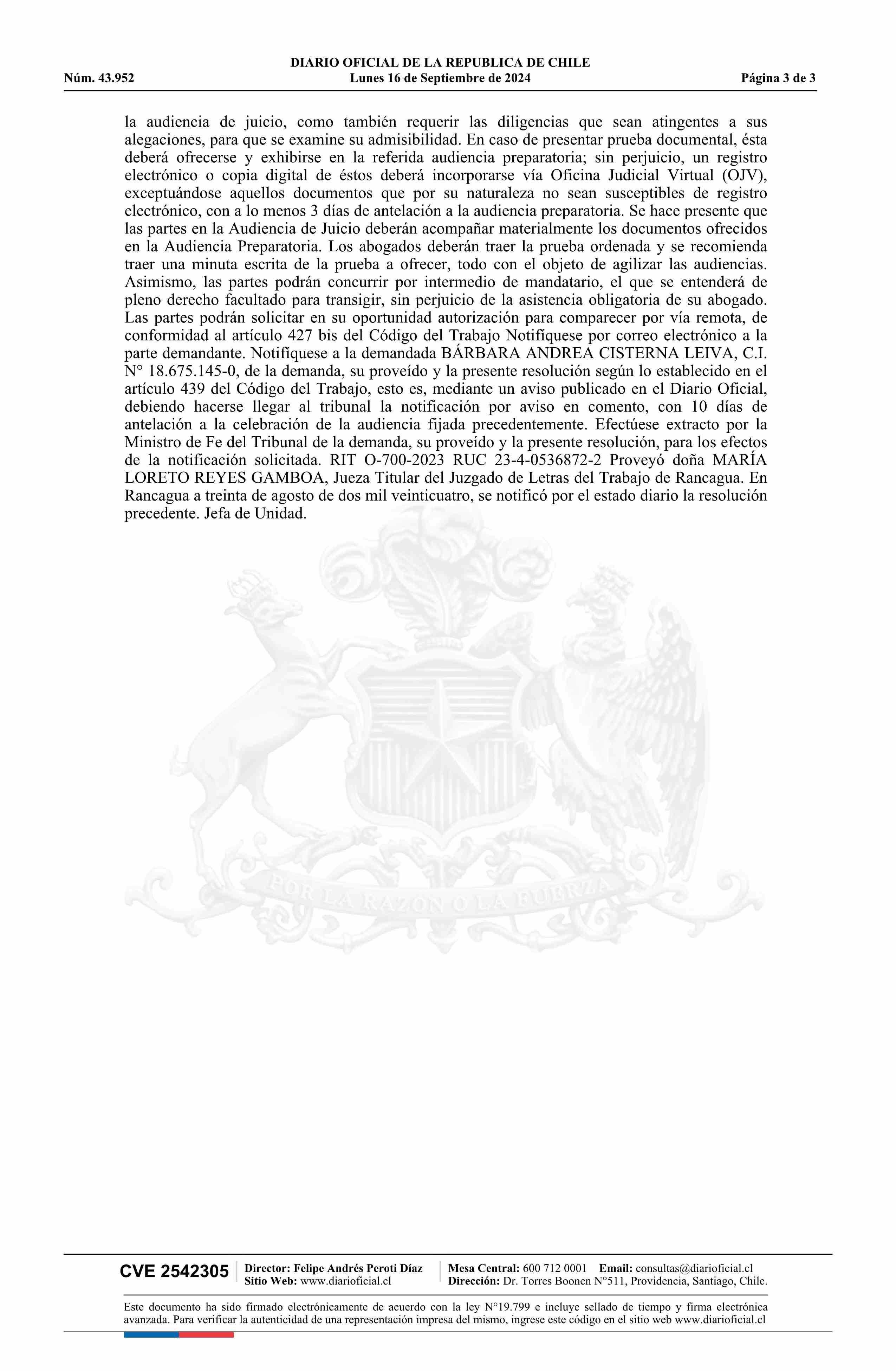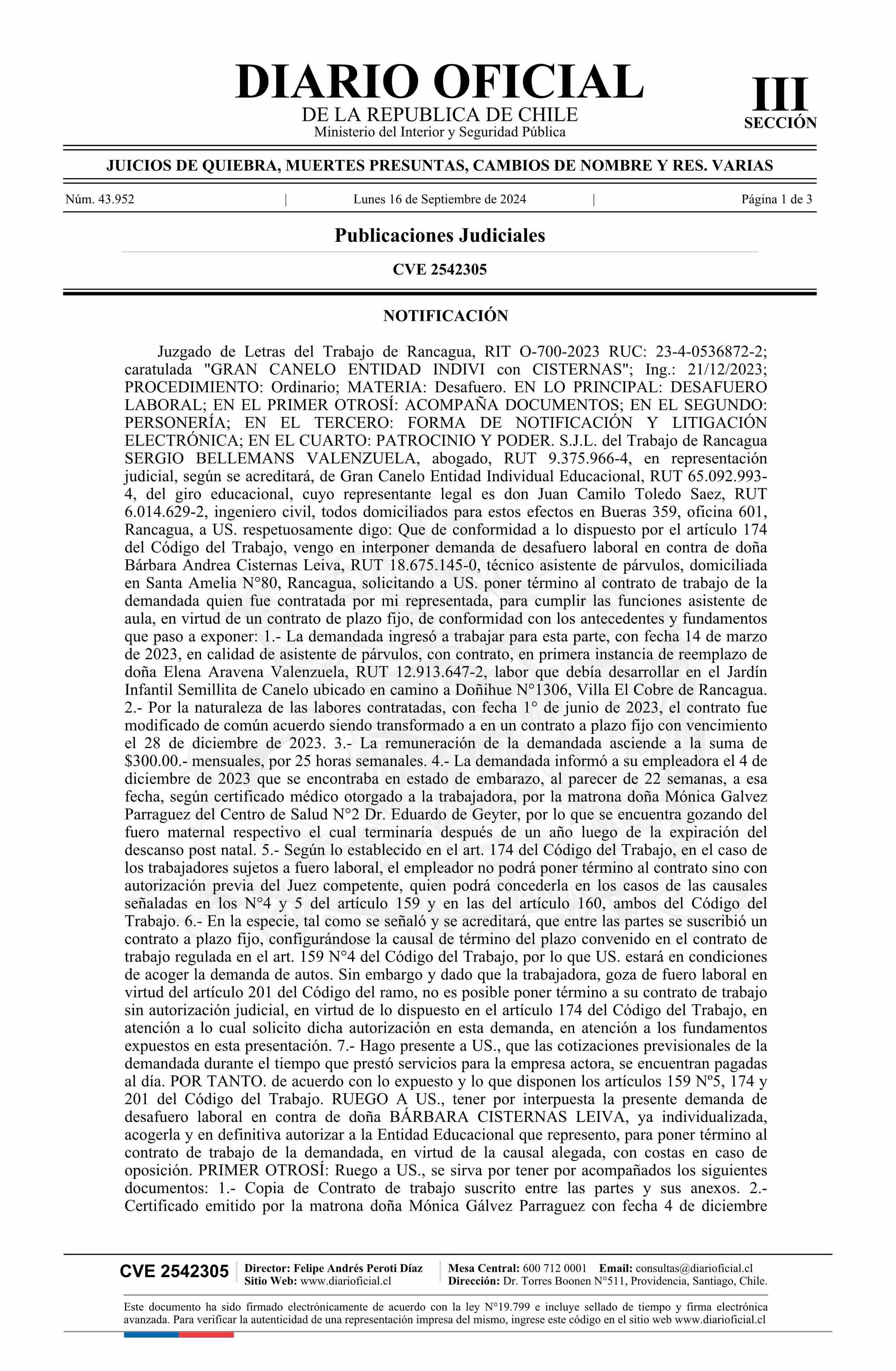 Gran Canelo Entidad Individual - Cisternas 16-09-2024 Diario Oficial Edición Electrónica |