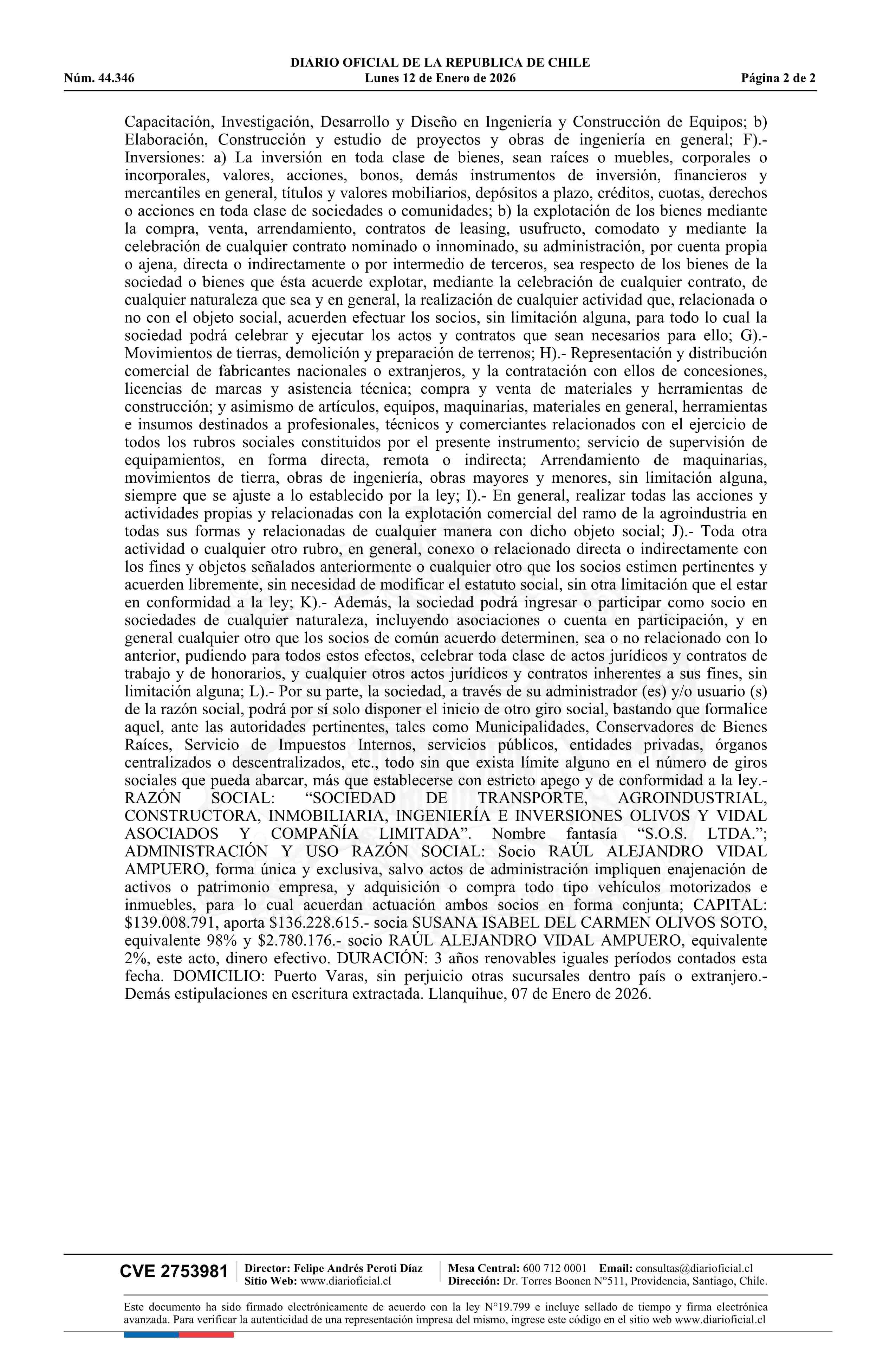 Título: SOCIEDAD DE TRANSPORTE, AGROINDUSTRIAL, CONSTRUCTORA, INMOBILIARIA, INGENIERÍA E INVERSIONES OLIVOS Y VIDAL ASOCIADOS Y COMPAÑÍA LIMITADA