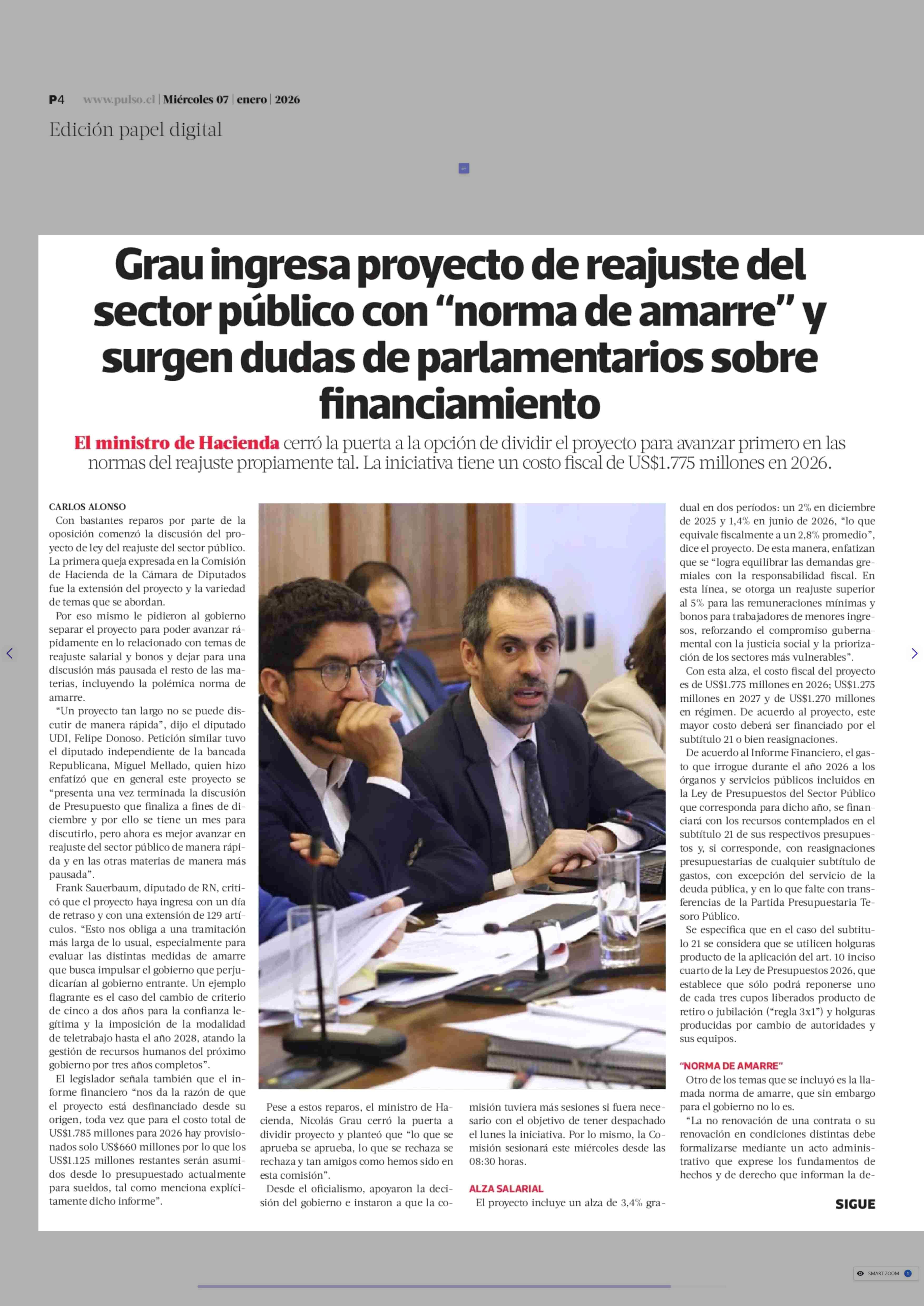 Título: Grau ingresa proyecto de reajuste del sector público con "norma de amarre" y surgen dudas de parlamentarios sobre financiamiento