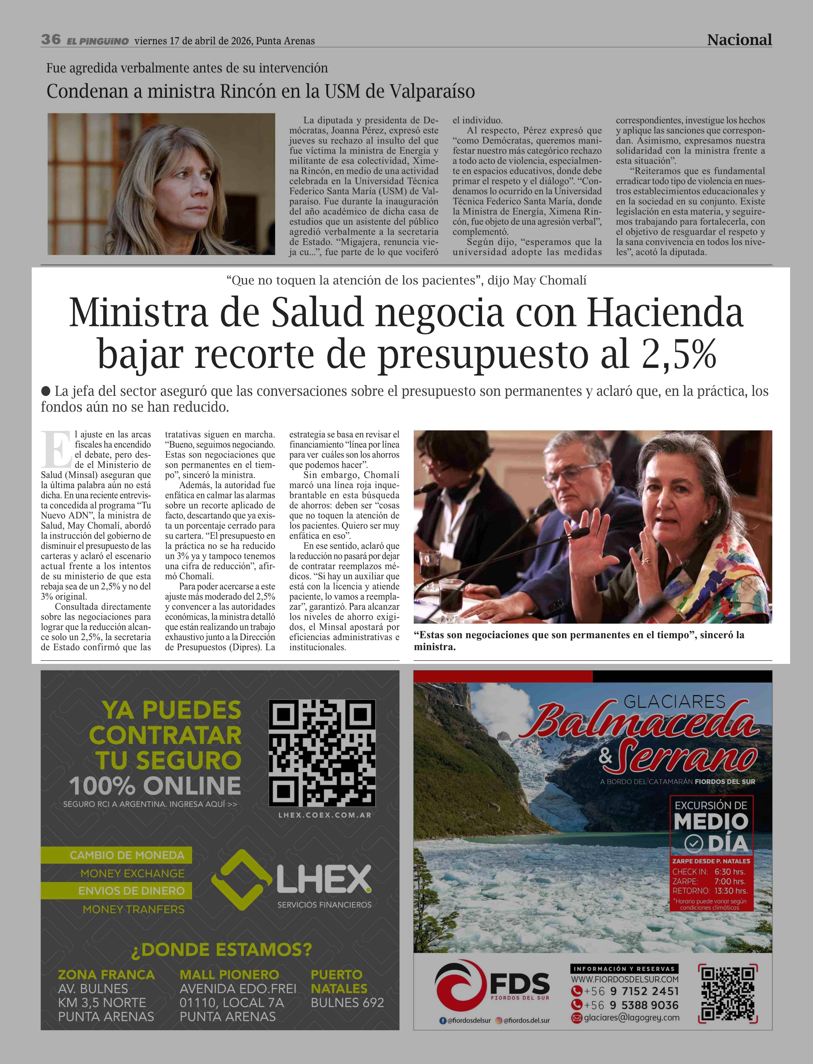 Ministra de Salud negocia con Hacienda bajar recorte de presupuesto al 2,5% 17-04-2026 El Pingüino |