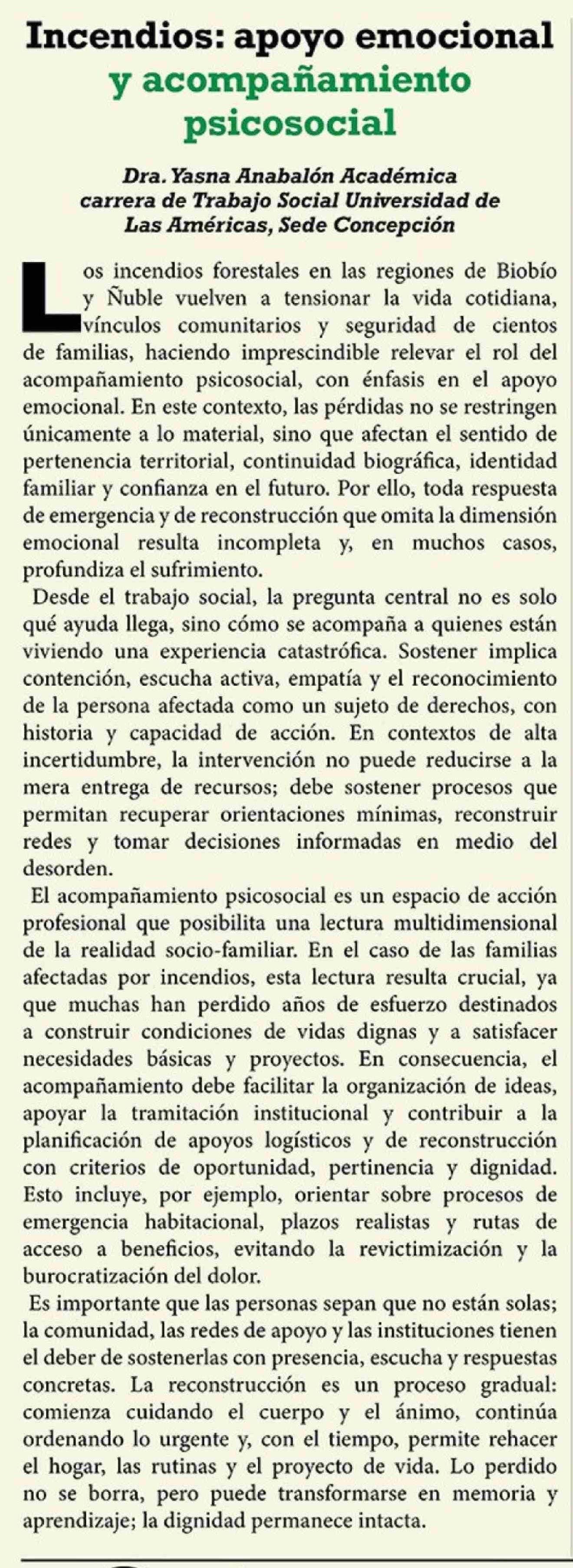 | Título: | Columnas de Opinión: Incendios: apoyo emocional y acompañamiento psicosocial |