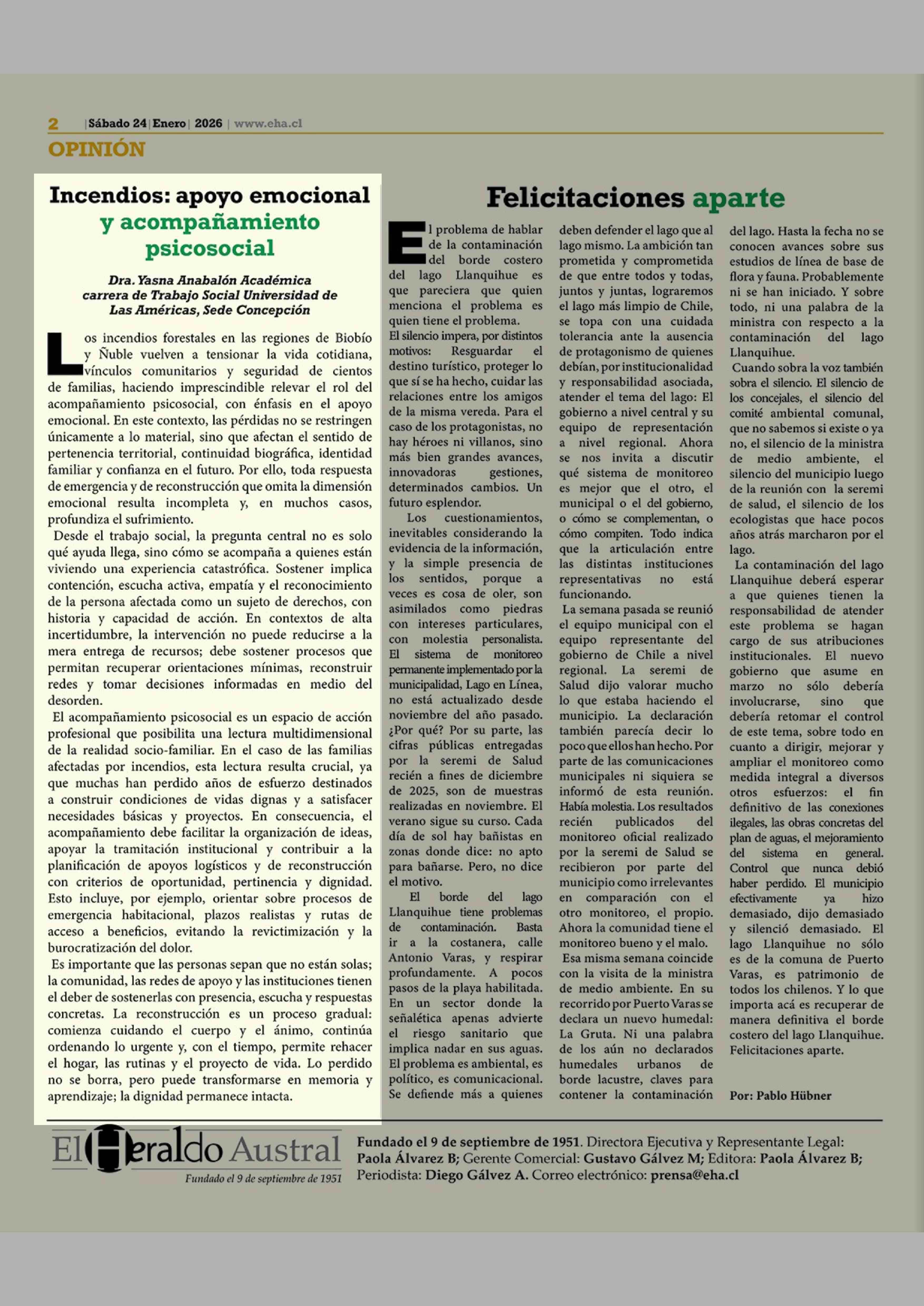 Columnas de Opinión: Incendios: apoyo emocional y acompañamiento psicosocial 24-01-2026 El Heraldo Austral |