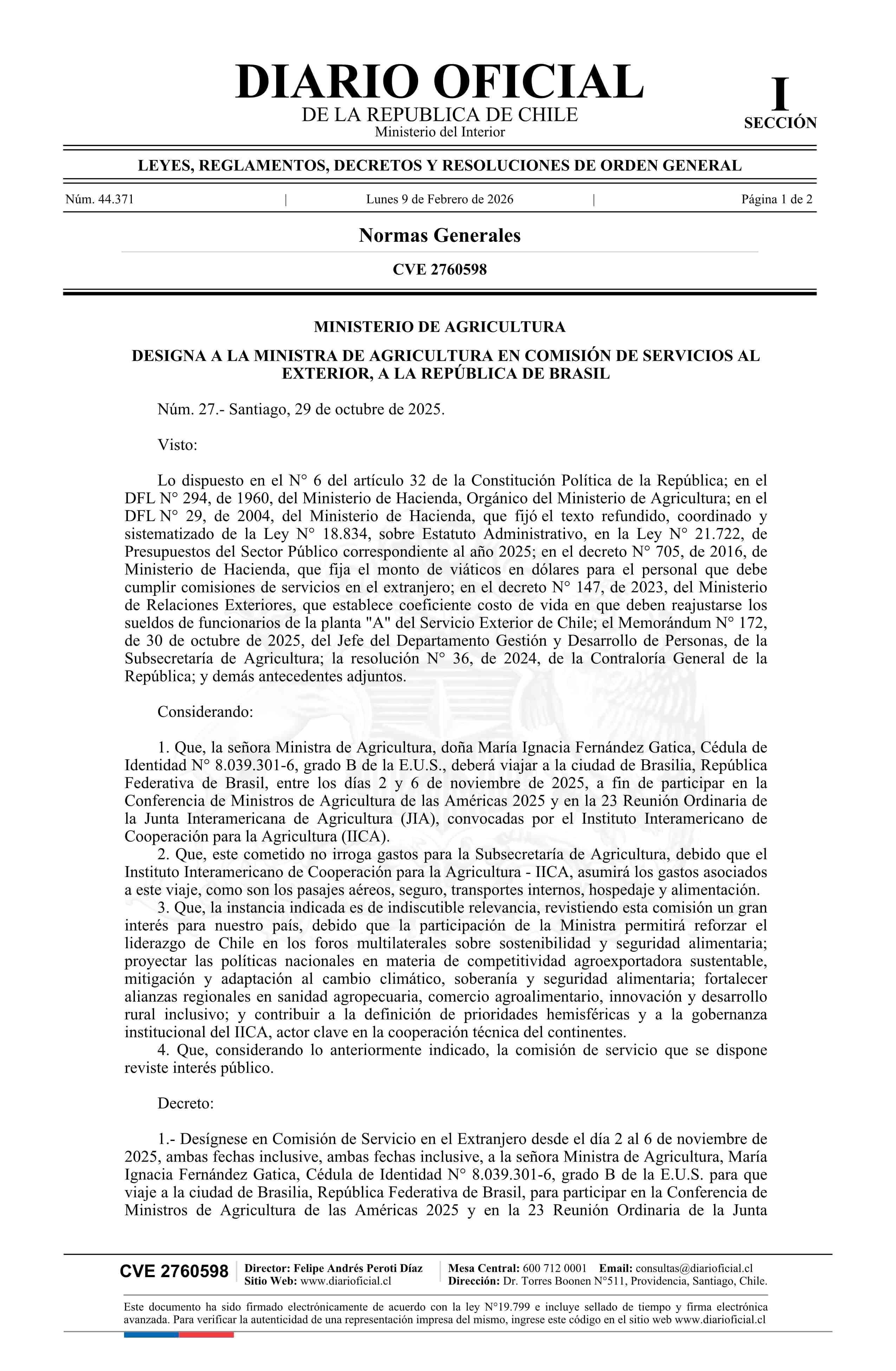 Decreto número 27, de 2025.- Designa a doña María Ignacia Fernández Gatica, Ministra de Agricultura, en Comisión de Servicios al Exterior, a la República de Brasil 09-02-2026 Diario Oficial Edición Electrónica |