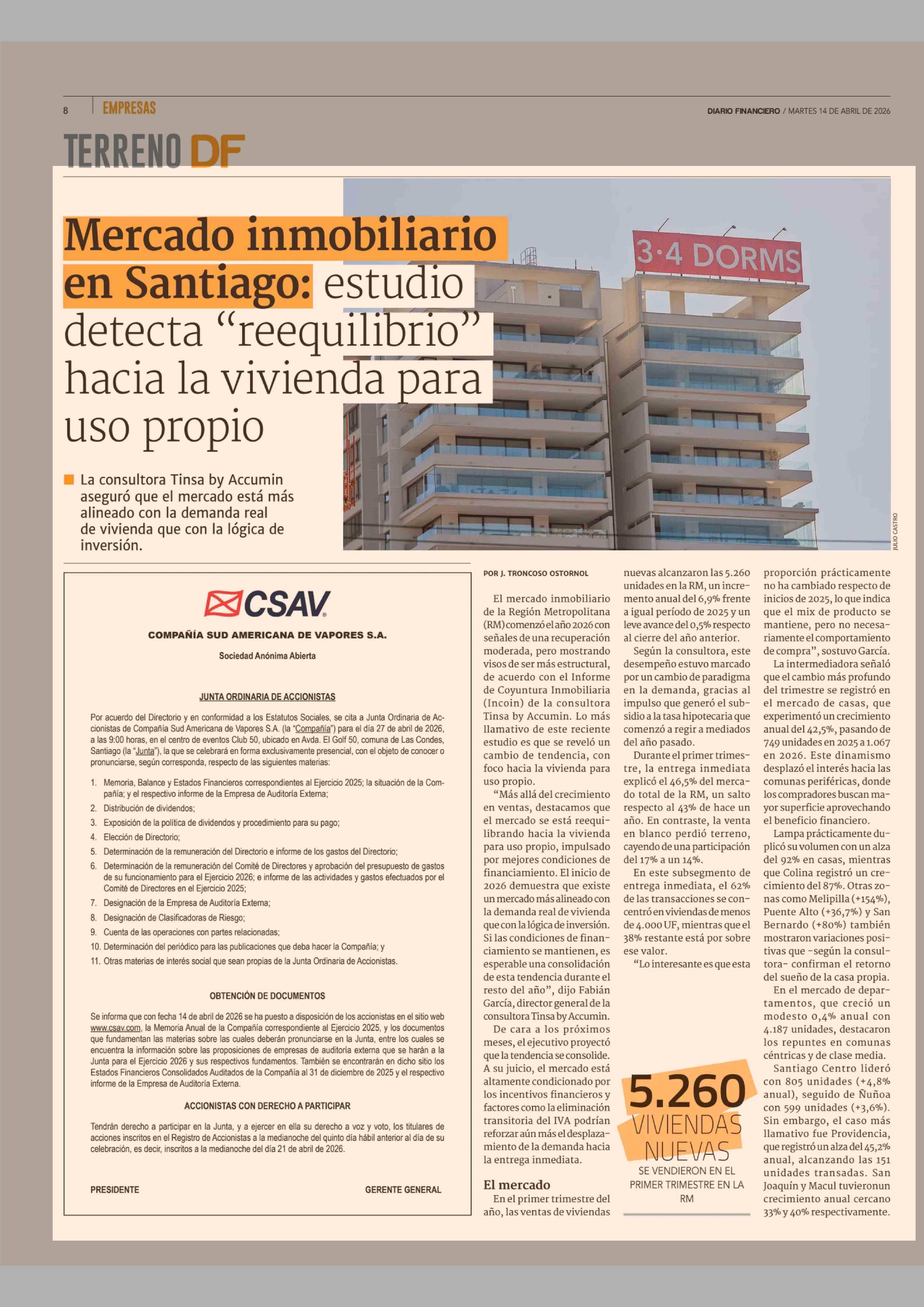 Mercado inmobiliario en Santiago: estudio detecta "reequilibrio' hacia la vivienda para uso propio 14-04-2026 Diario Financiero |