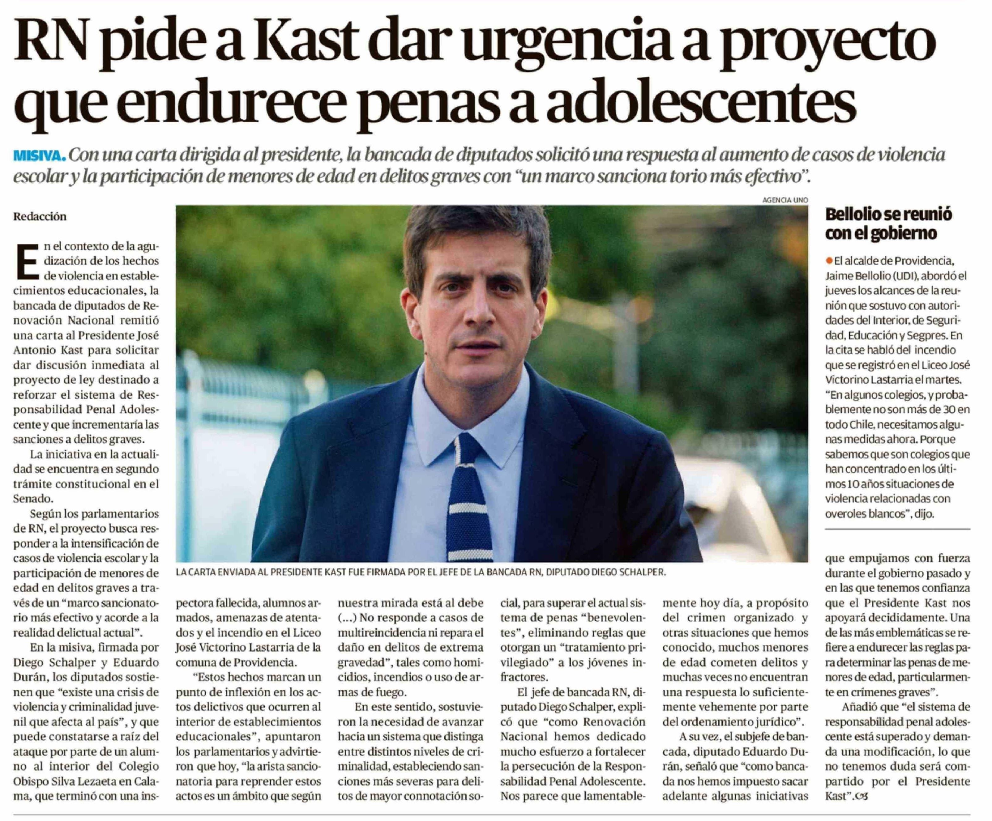 | Título: | RN pide a Kast dar urgencia a proyecto que endurece penas a adolescentes |