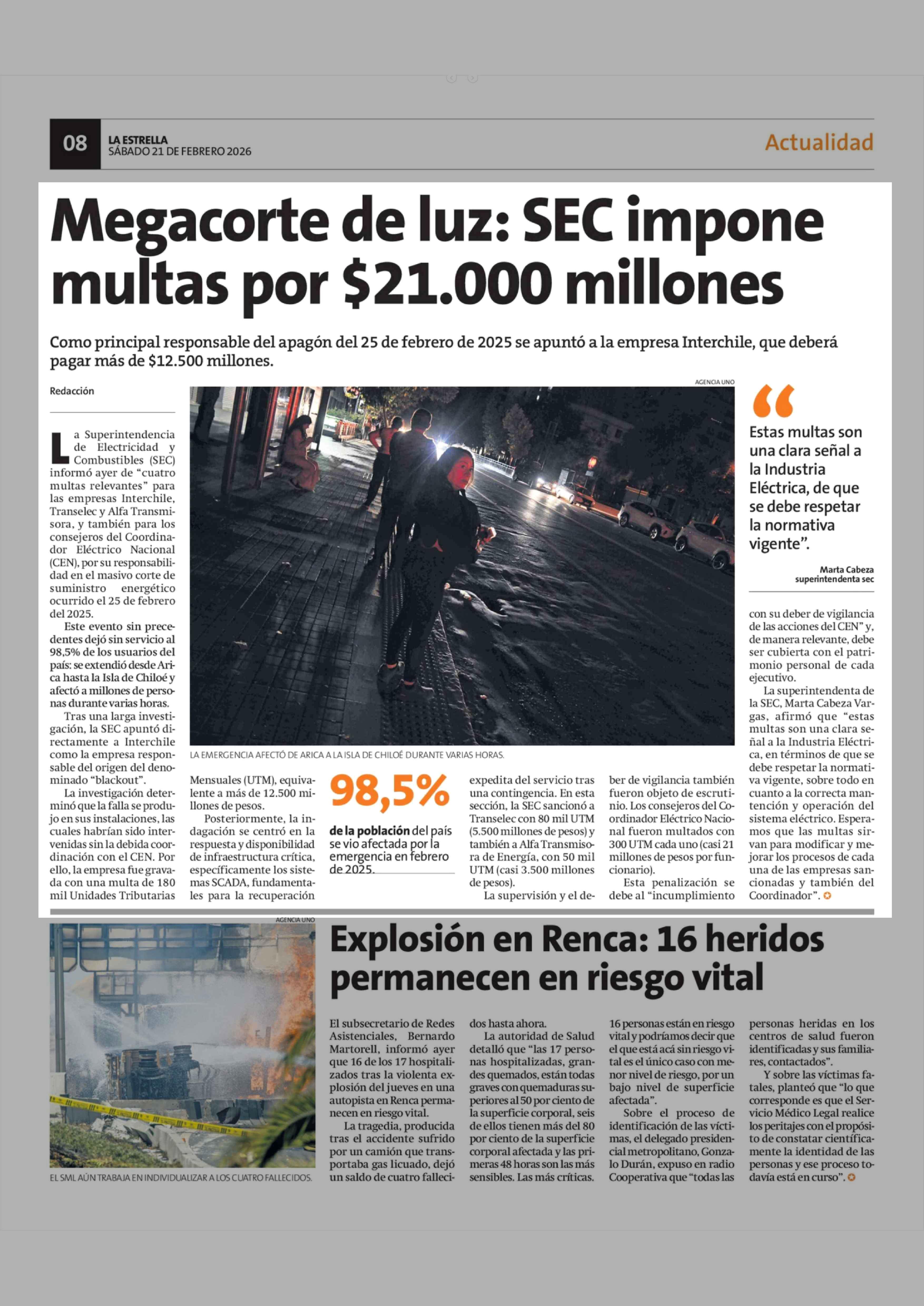 Megacorte de luz: SEC impone multas por $21.000 millones 21-02-2026 La Estrella de Concepción |