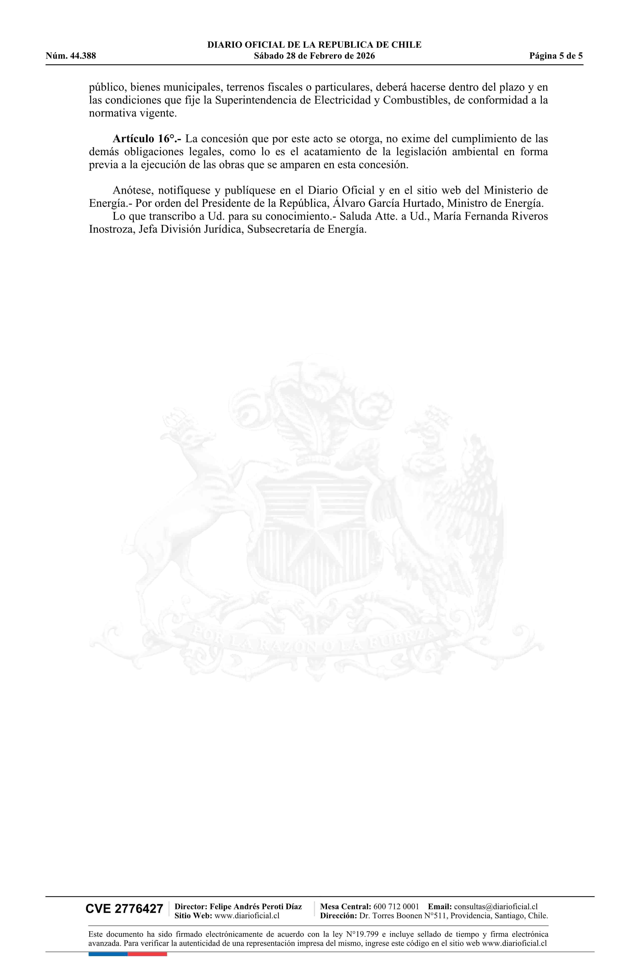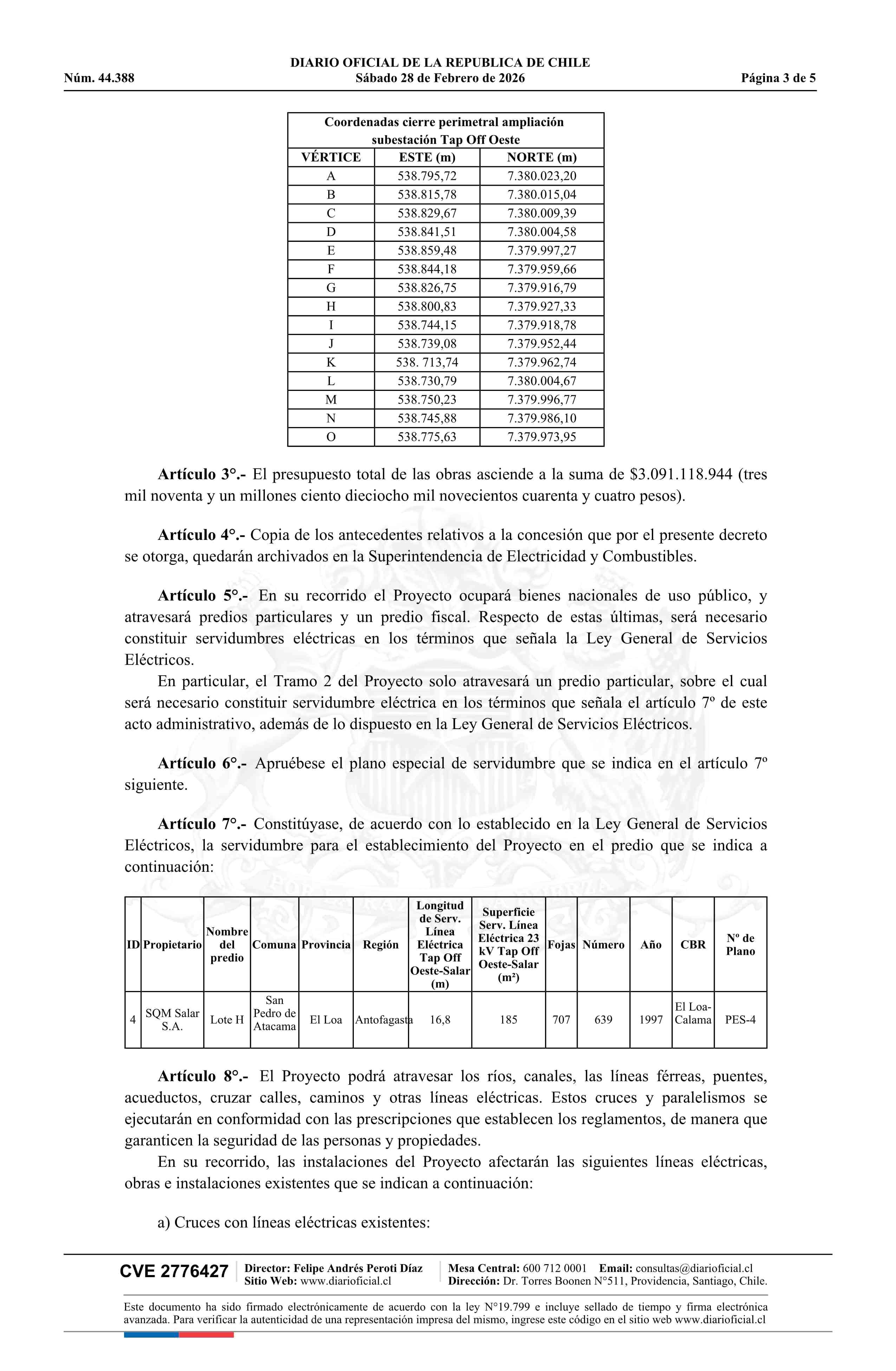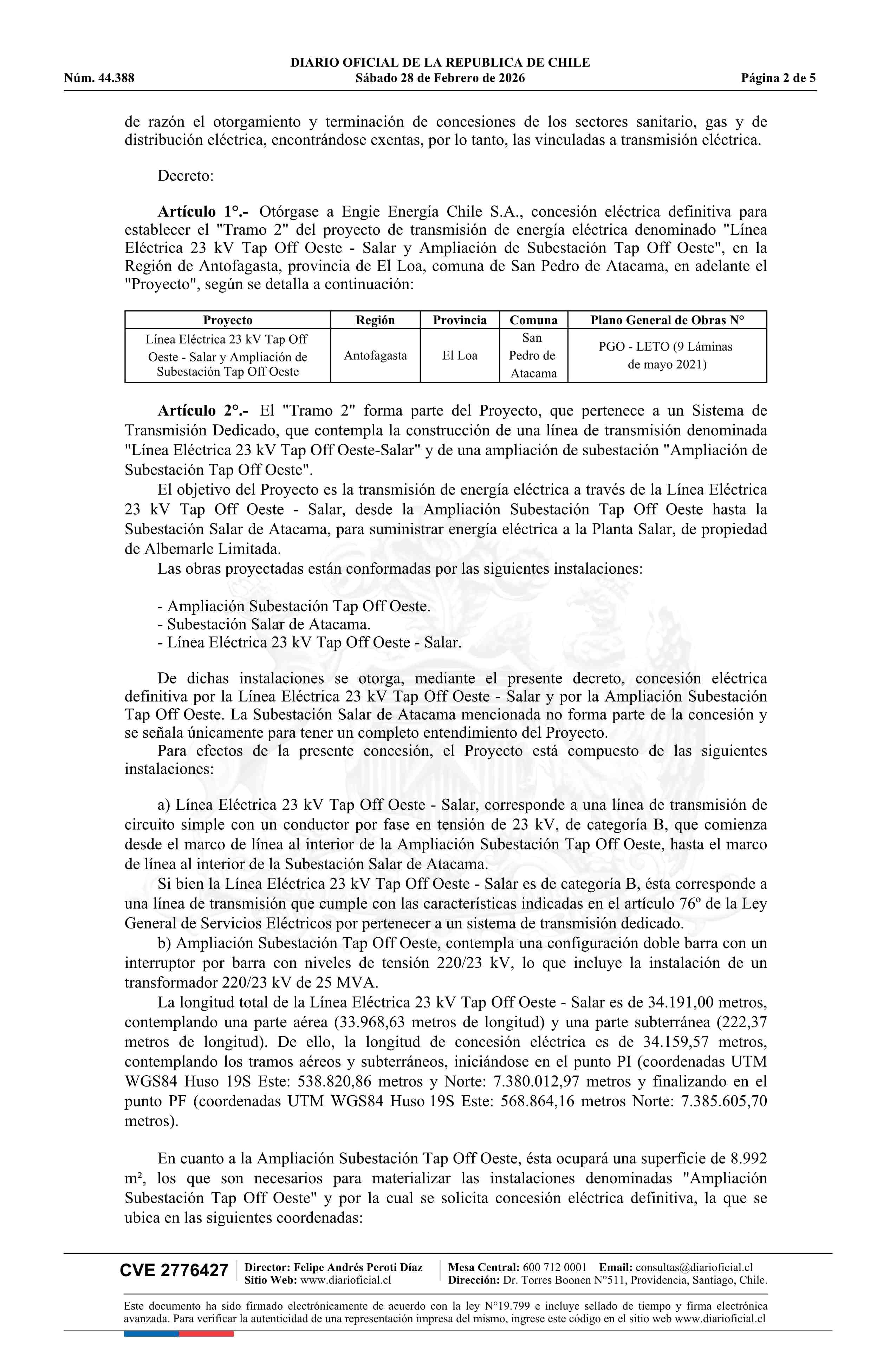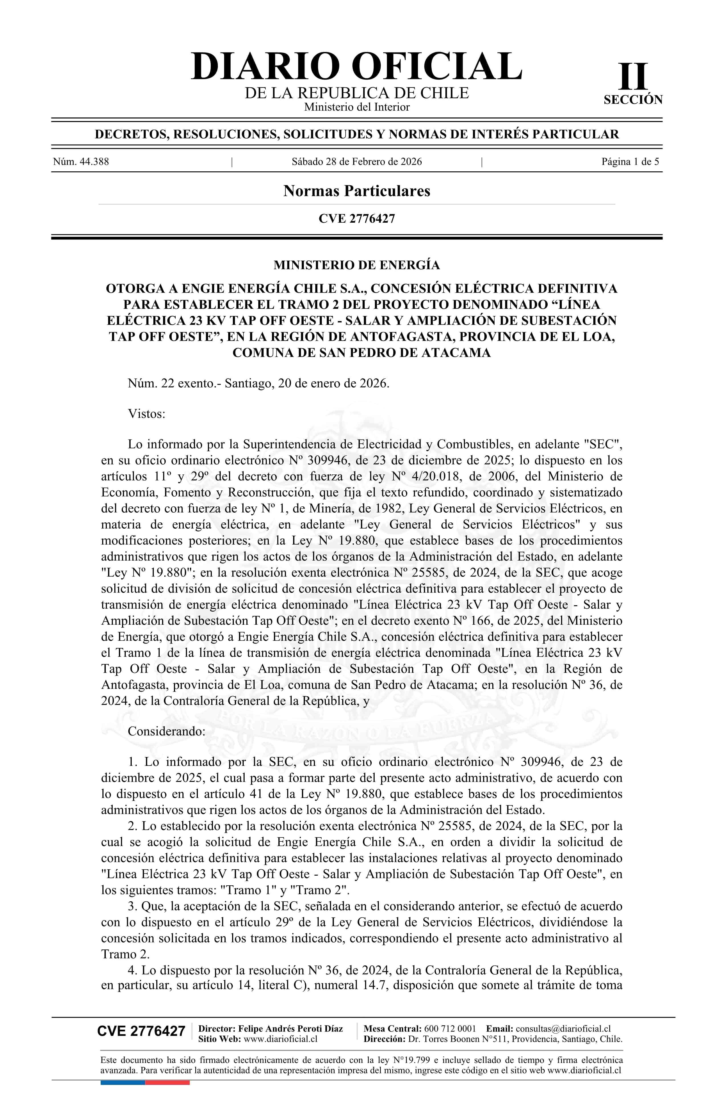Título: Decreto exento número 22, de 2026.- Otorga a Engie Energía Chile S.A. concesión eléctrica definitiva para establecer el tramo 2 del proyecto denominado Línea Eléctrica 23 kV Tap Off Oeste - Salar y Ampliación de Subestación Tap Off Oeste, en la Región de Antofagasta, provincia de El Loa, comuna de S