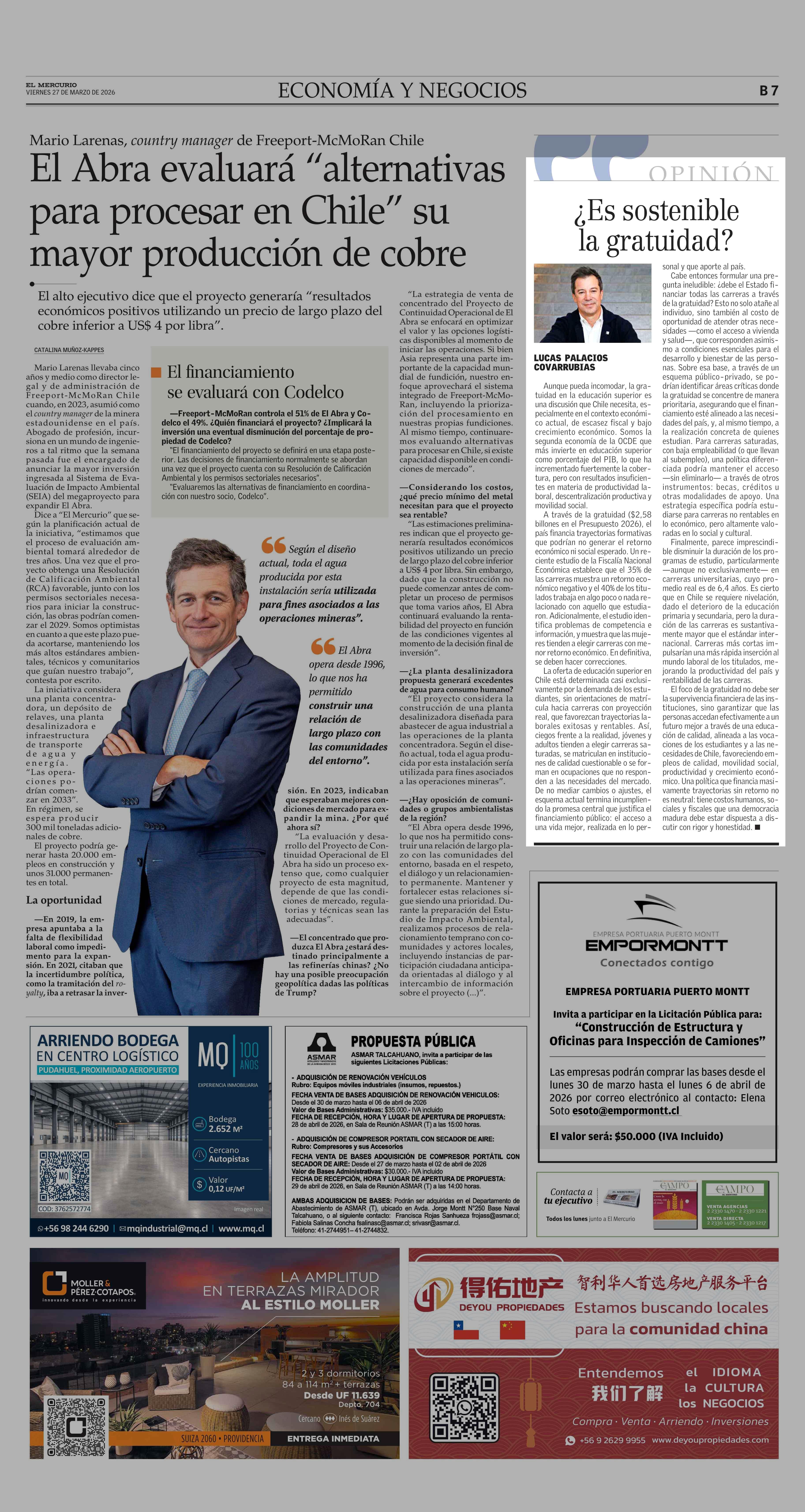 Columnas de Opinión: ¿Es sostenible la gratuidad? 27-03-2026 El Mercurio |