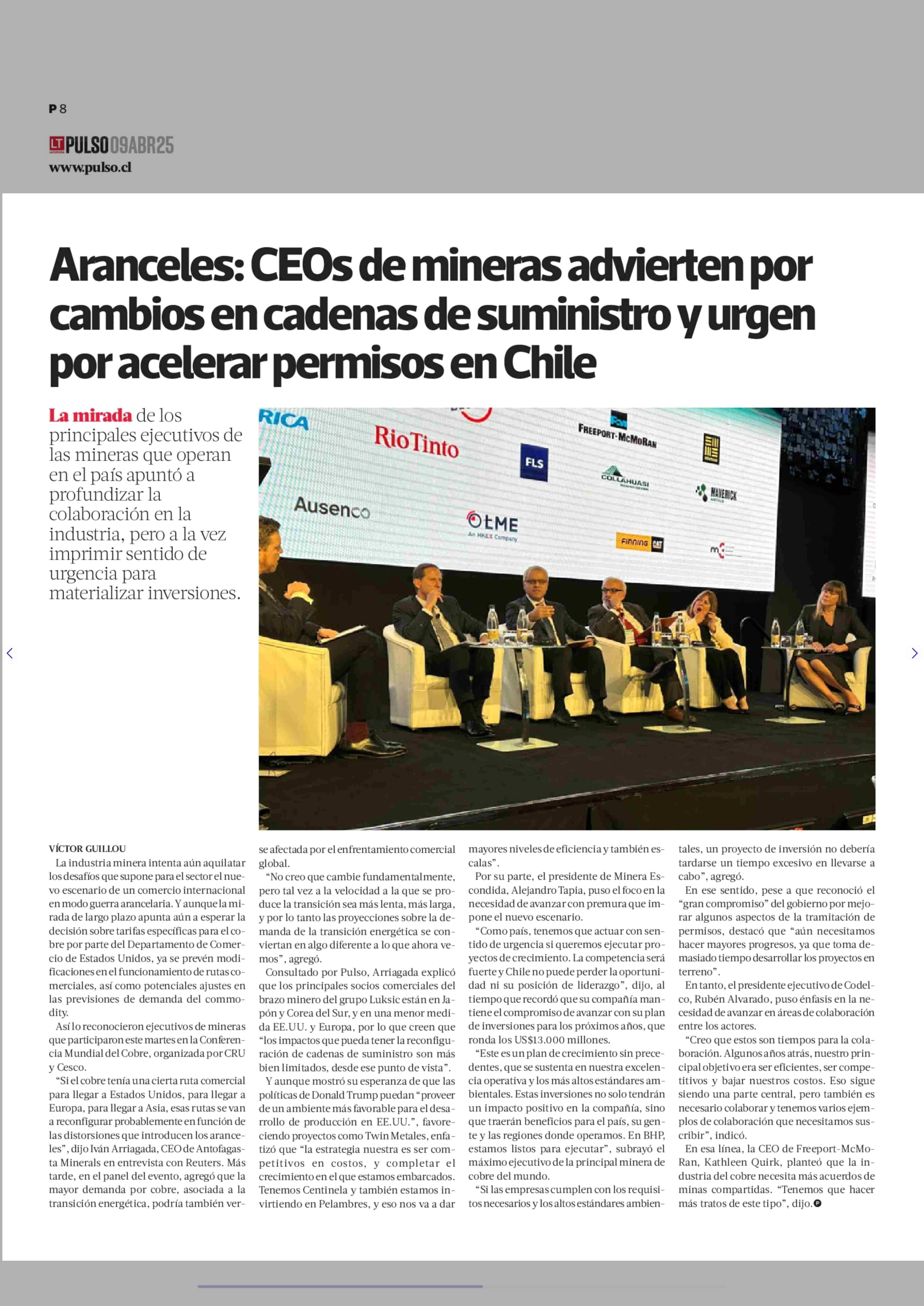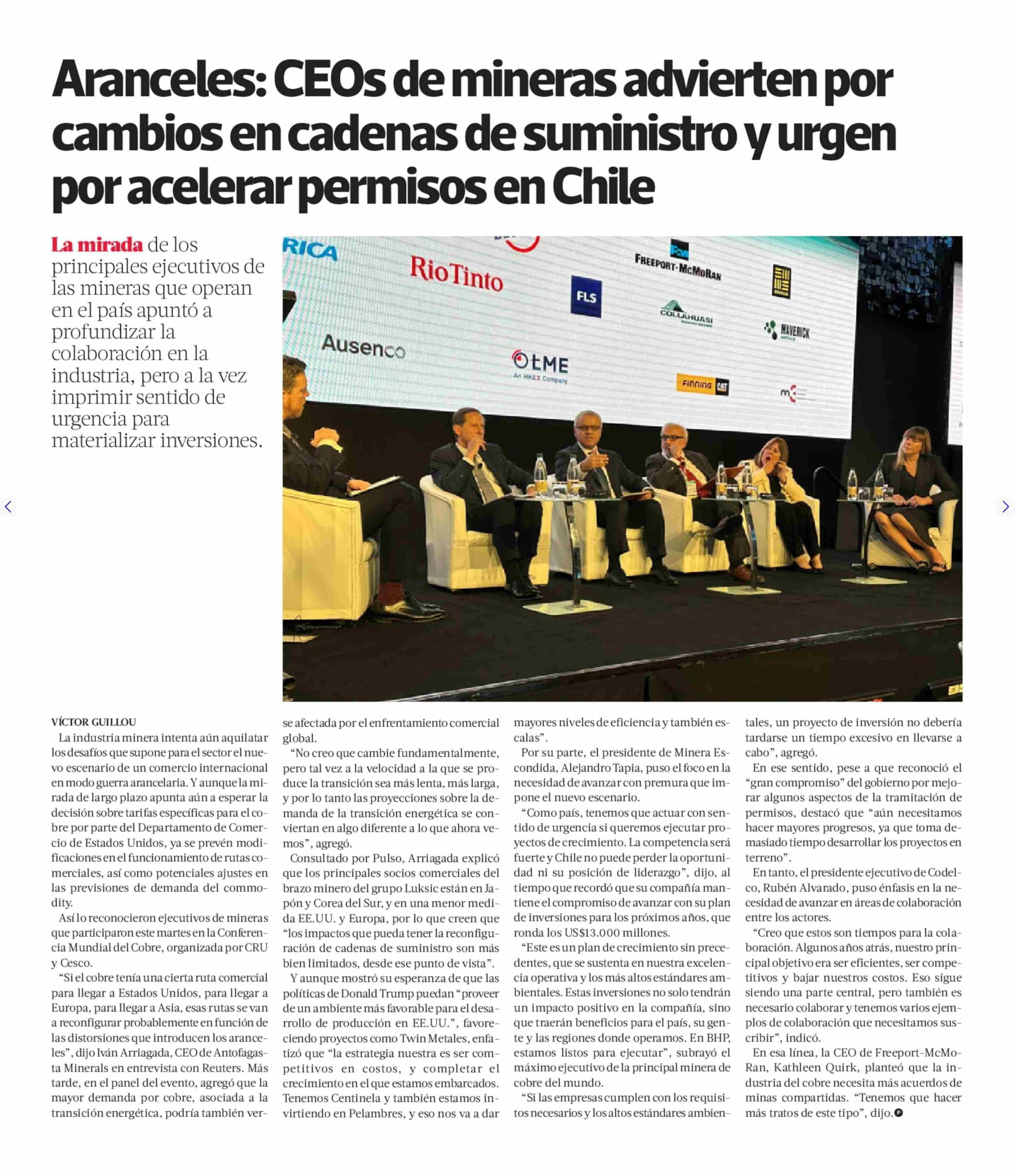 Título: Aranceles: CEOs de mineras advierten por cambios en cadenas de suministro y urgen por acelerar permisos en Chile