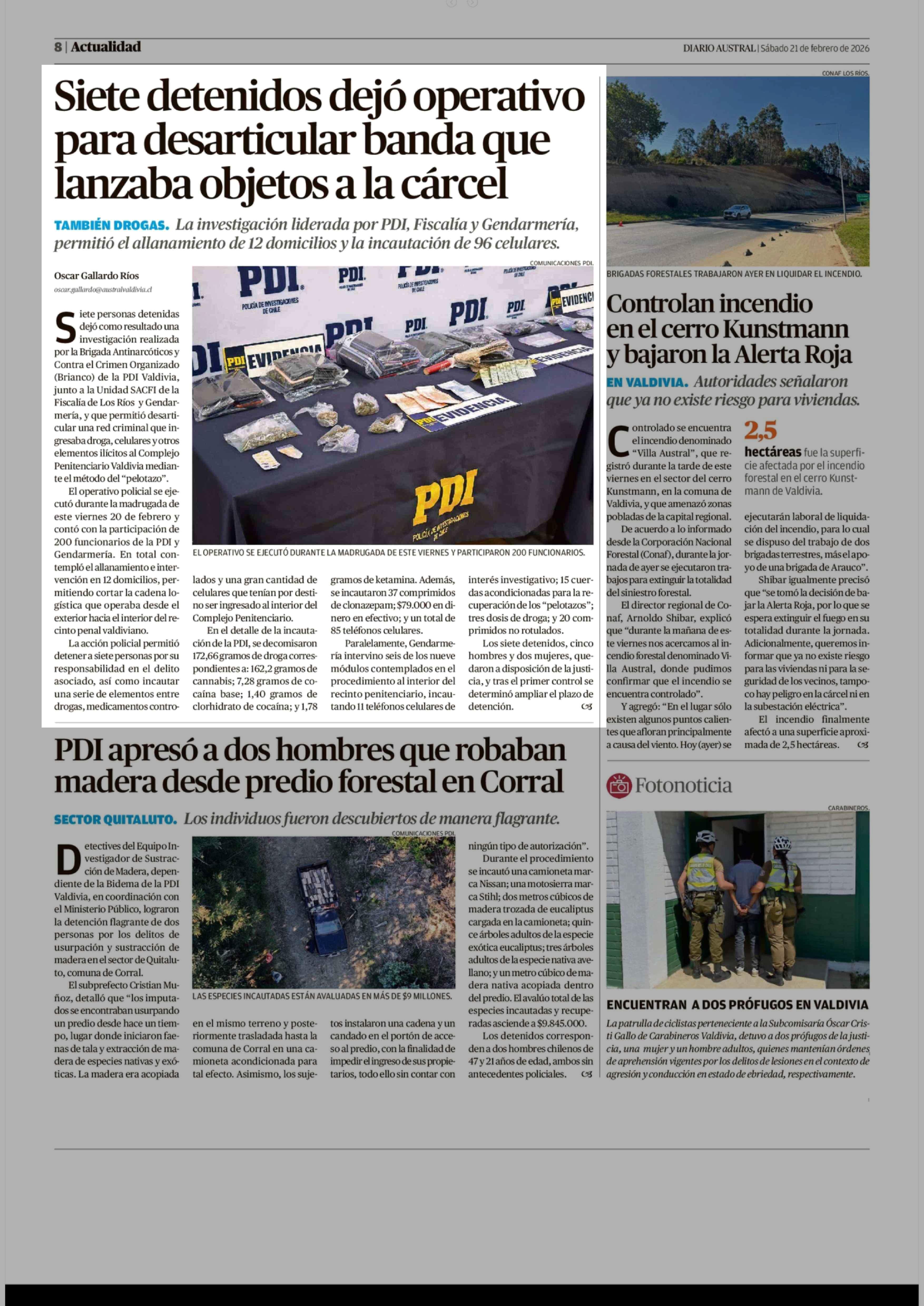 Siete detenidos dejó operativo para desarticular banda que lanzaba objetos a la cárcel 21-02-2026 Diario Austral Región de Los Ríos |