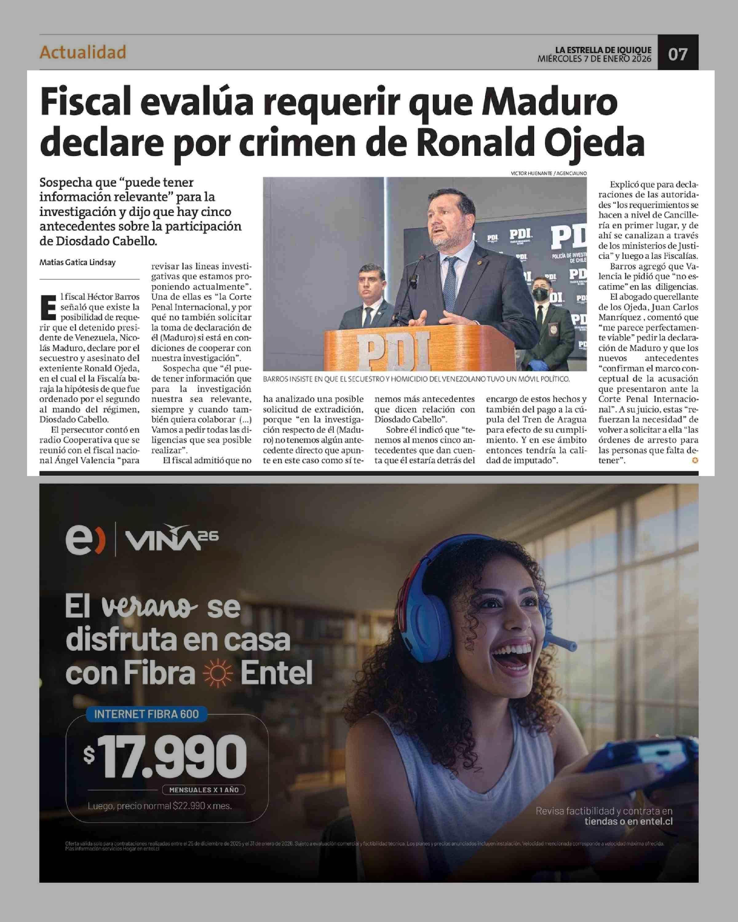 Fiscal evalúa requerir que Maduro declare por crimen de Ronald Ojeda 07-01-2026 La Estrella de Iquique |