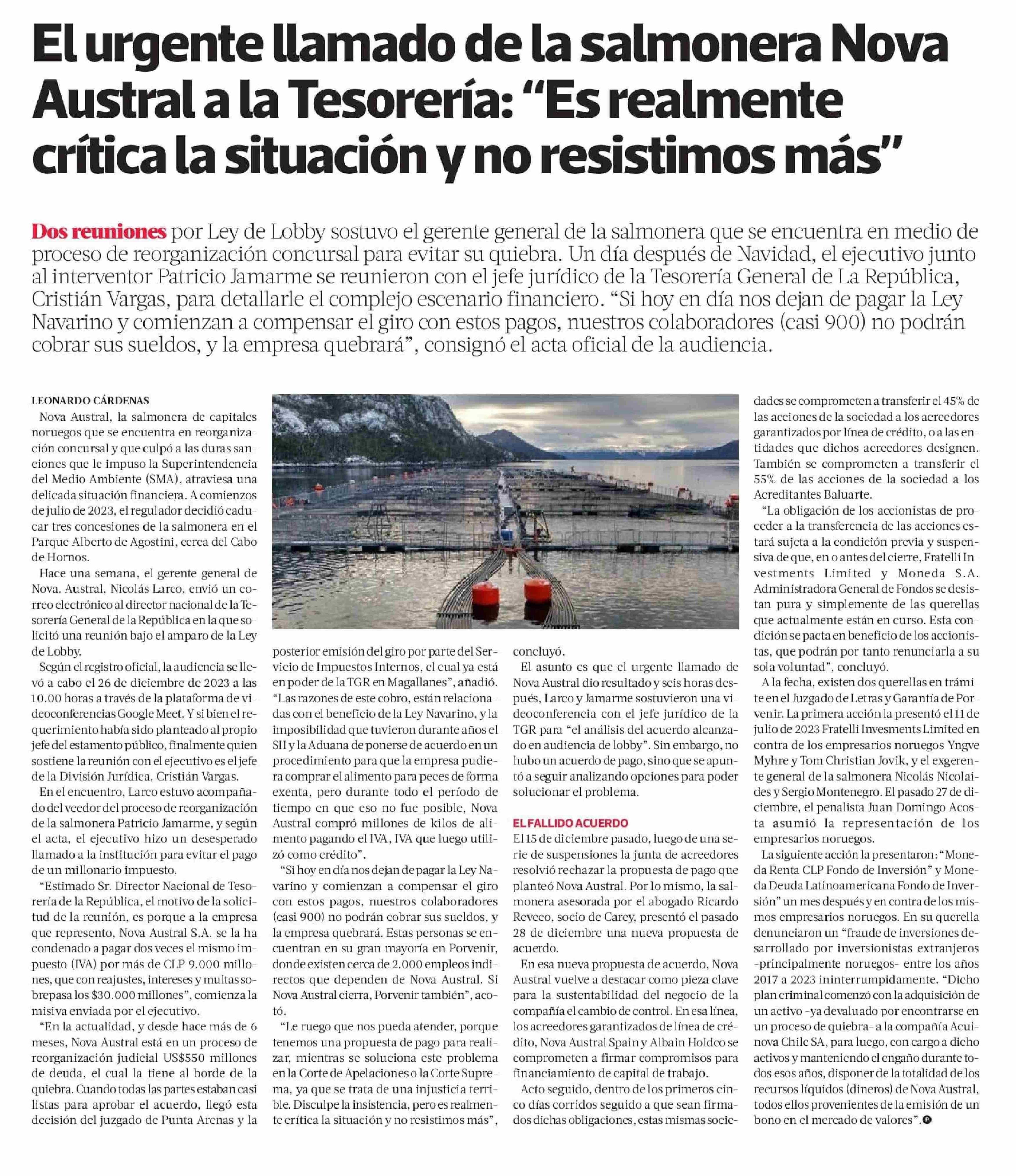 El urgente llamado de la salmonera Nova Austral a la Tesorería: “Es realmente crítica la situación y no resistimos más” 04-01-2024 La Tercera |