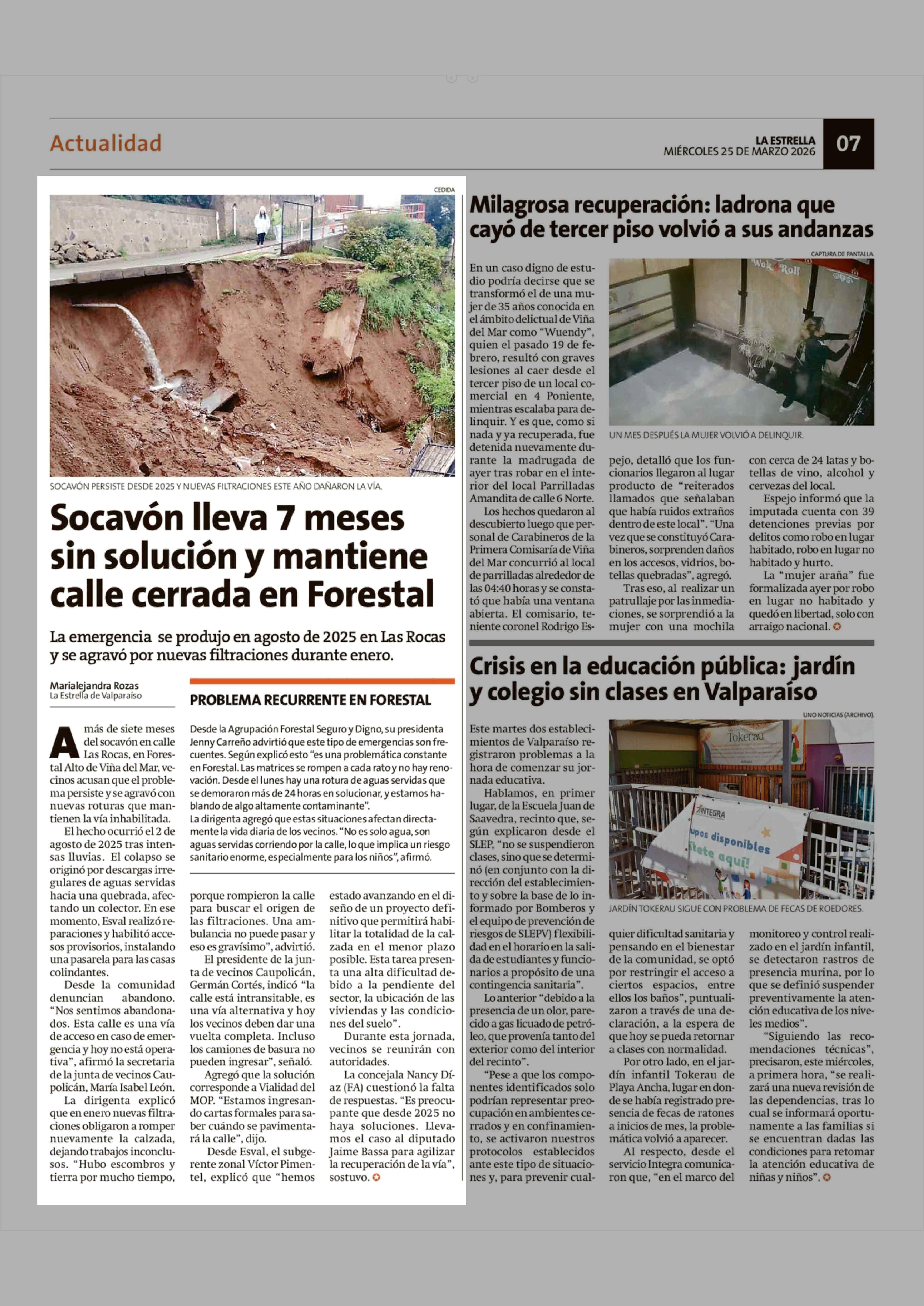 Socavón lleva 7 meses sin solución y mantiene calle cerrada en Forestal 25-03-2026 La Estrella de Valparaíso |