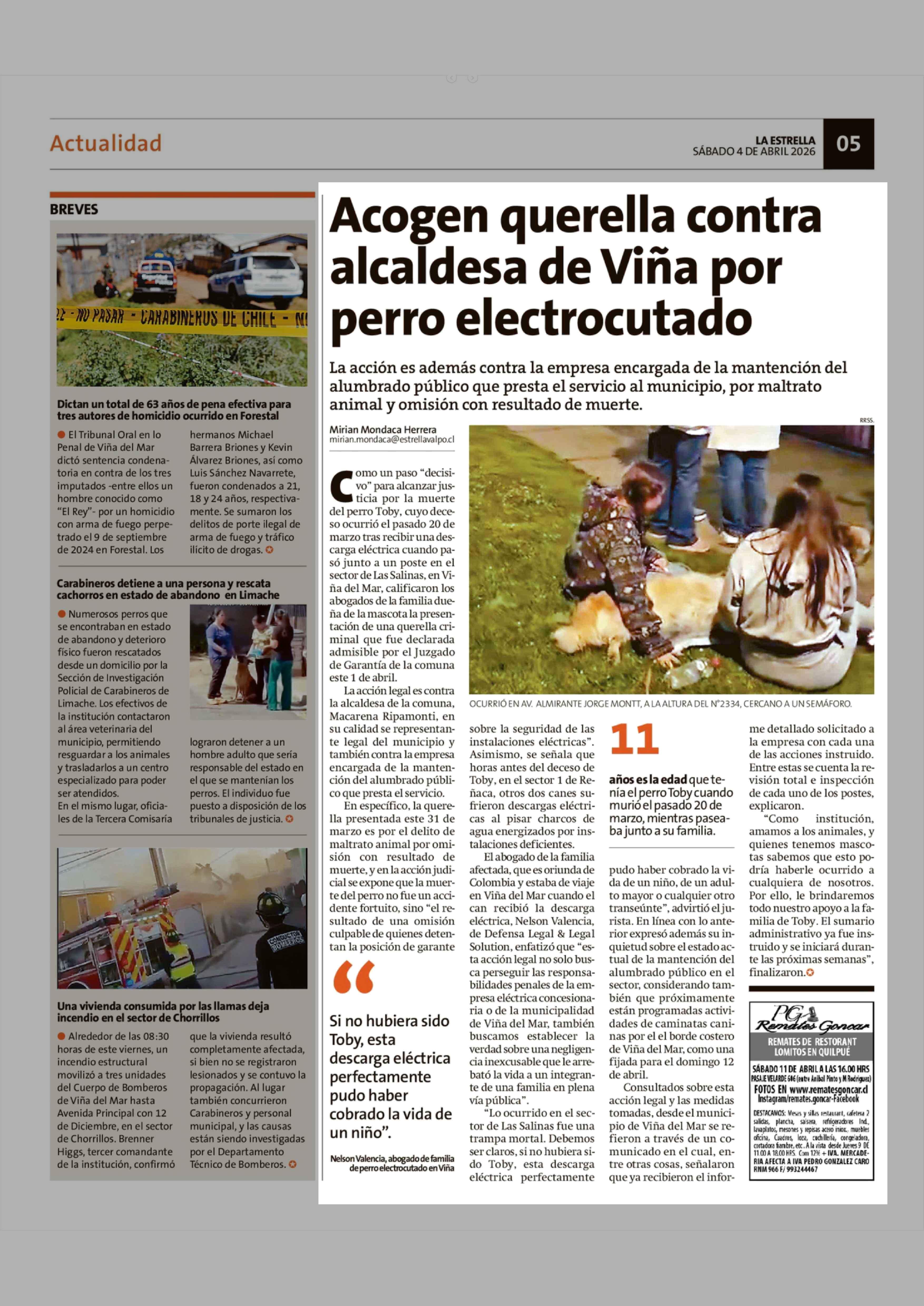 Acogen querella contra alcaldesa de Viña por perro electrocutado 04-04-2026 La Estrella de Valparaíso |