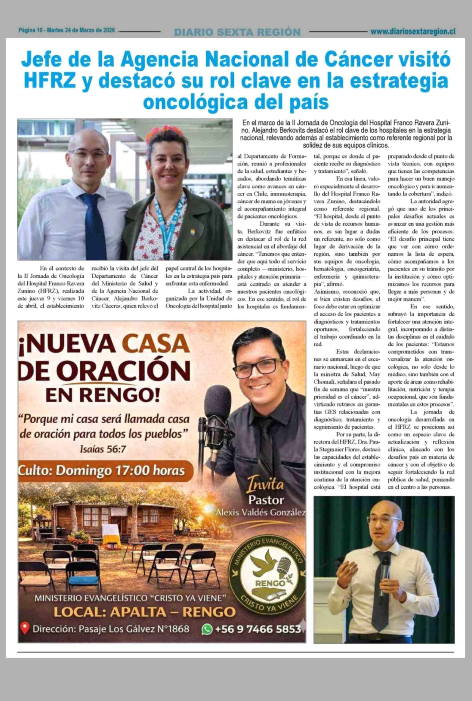 Jefe de la Agencia Nacional de Cáncer visitó HFRZ y destacó su rol clave en la estrategia oncológica del país 24-03-2026 Diario VI Región |