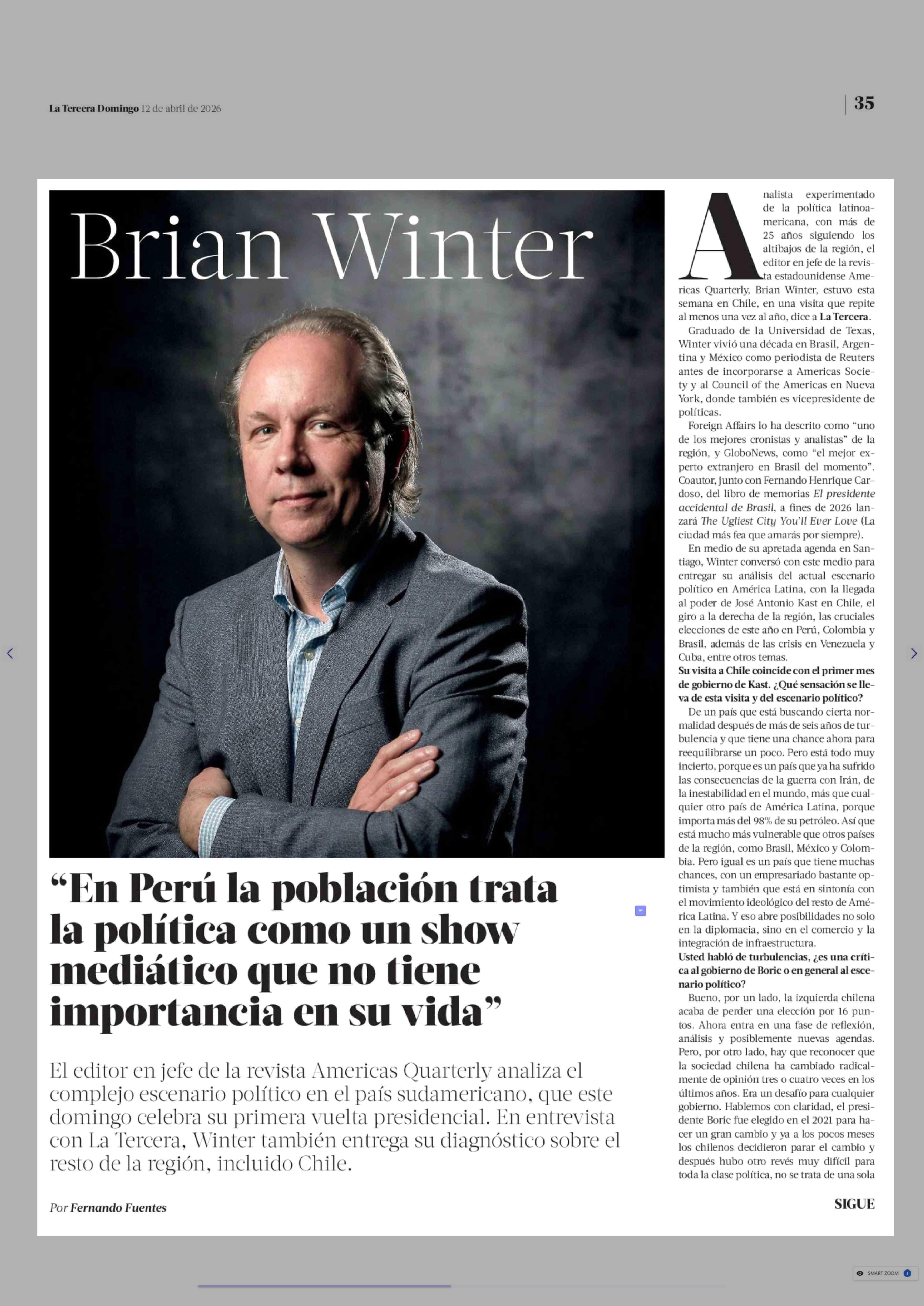 Brian Winter "En Perú la población trata la política como un show mediático que no tiene importancia en su vida" 12-04-2026 La Tercera |
