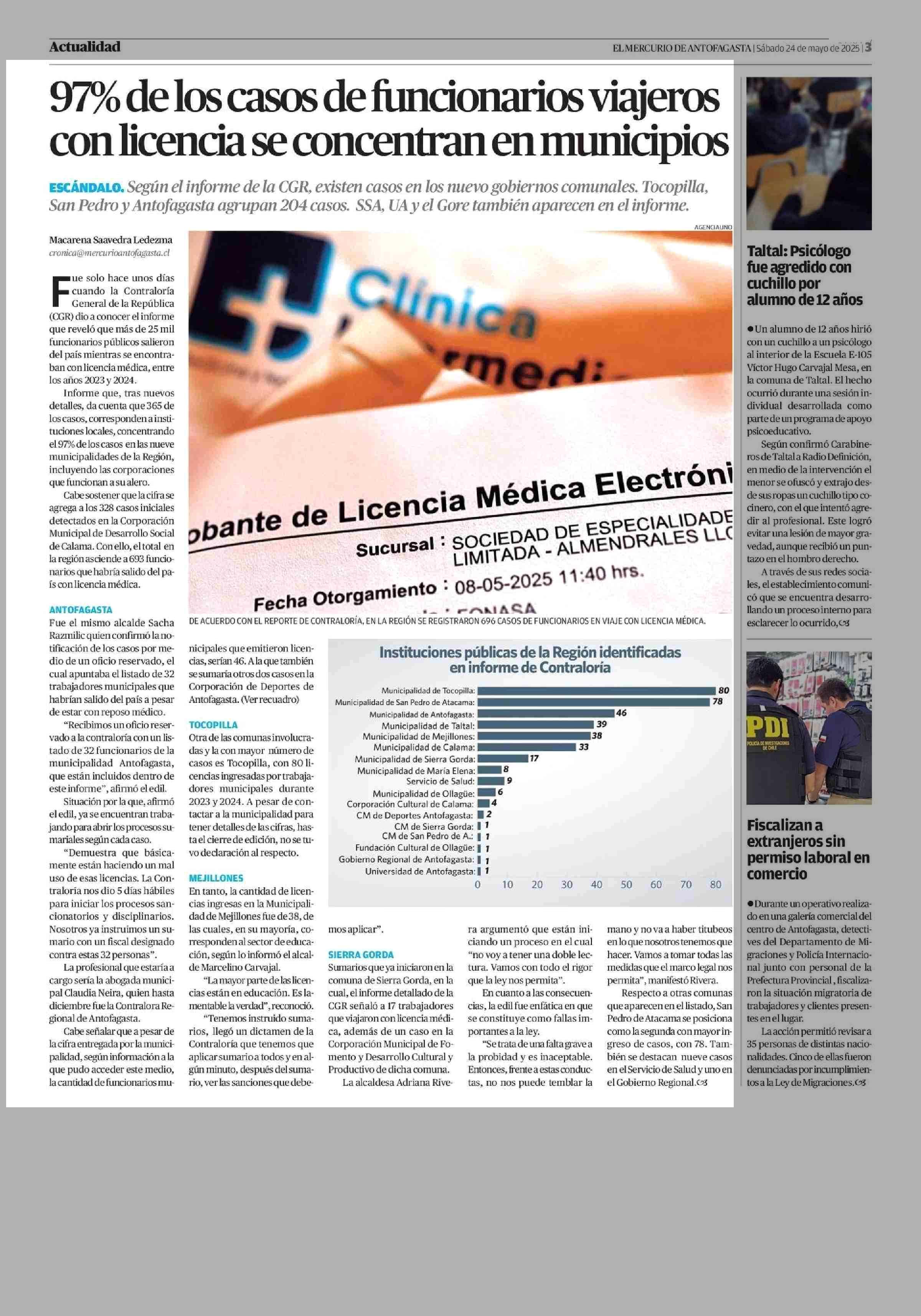 97% delos casos de funcionarios viajeros con licencia se concentran en municipios 24-05-2025 El Mercurio de Antofagasta |
