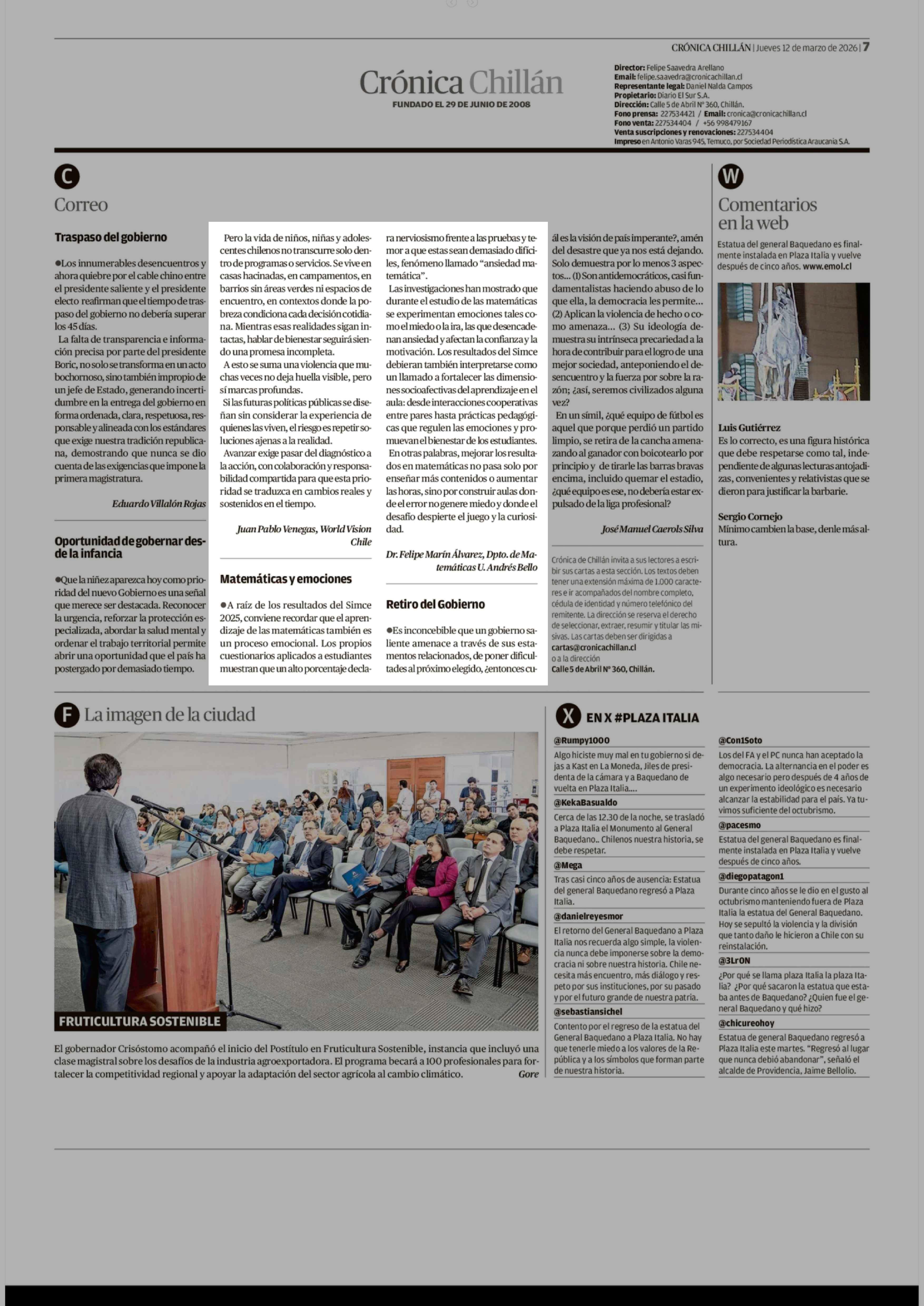 Cartas: Matemáticas y emociones 12-03-2026 Crónica de Chillán |
