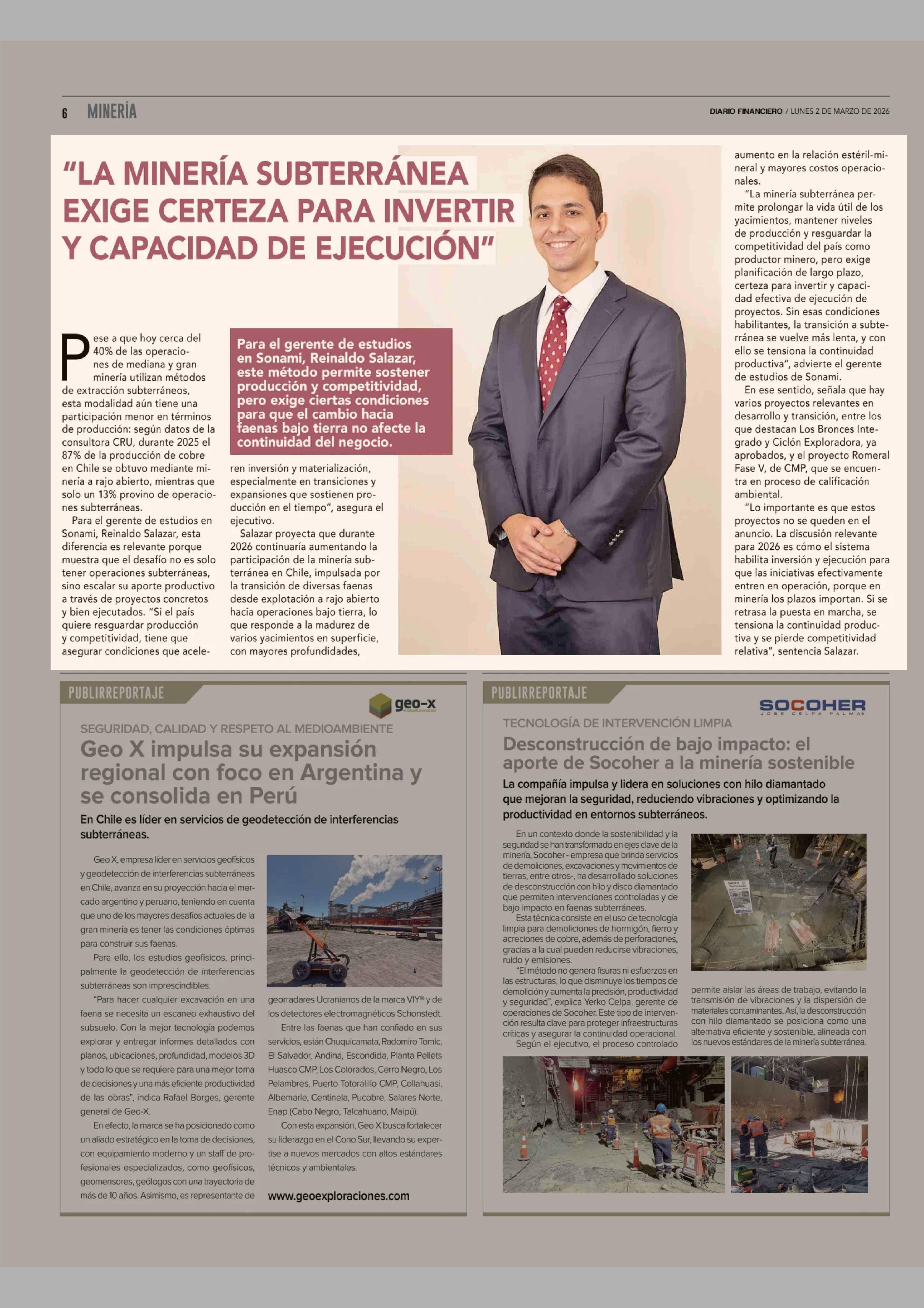 "LA MINERÍA SUBTERRÁNEA EXIGE CERTEZA PARA INVERTIR Y CAPACIDAD DE EJECUCIÓN" 02-03-2026 Diario Financiero |