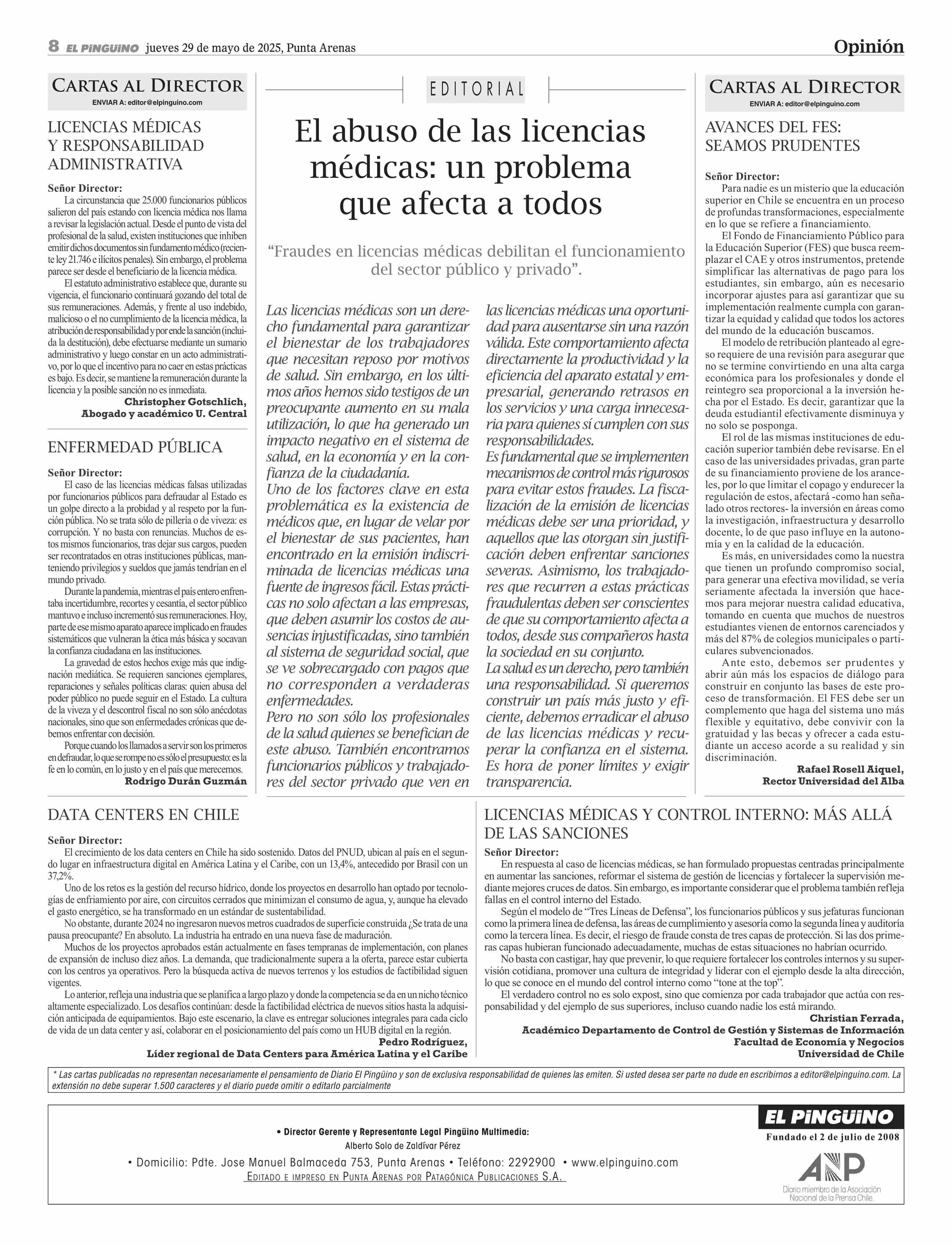 CARTAS: LICENCIAS MÉDICAS Y CONTROL INTERNO: MÁS ALLÁ DE LAS SANCIONES 29-05-2025 El Pingüino |
