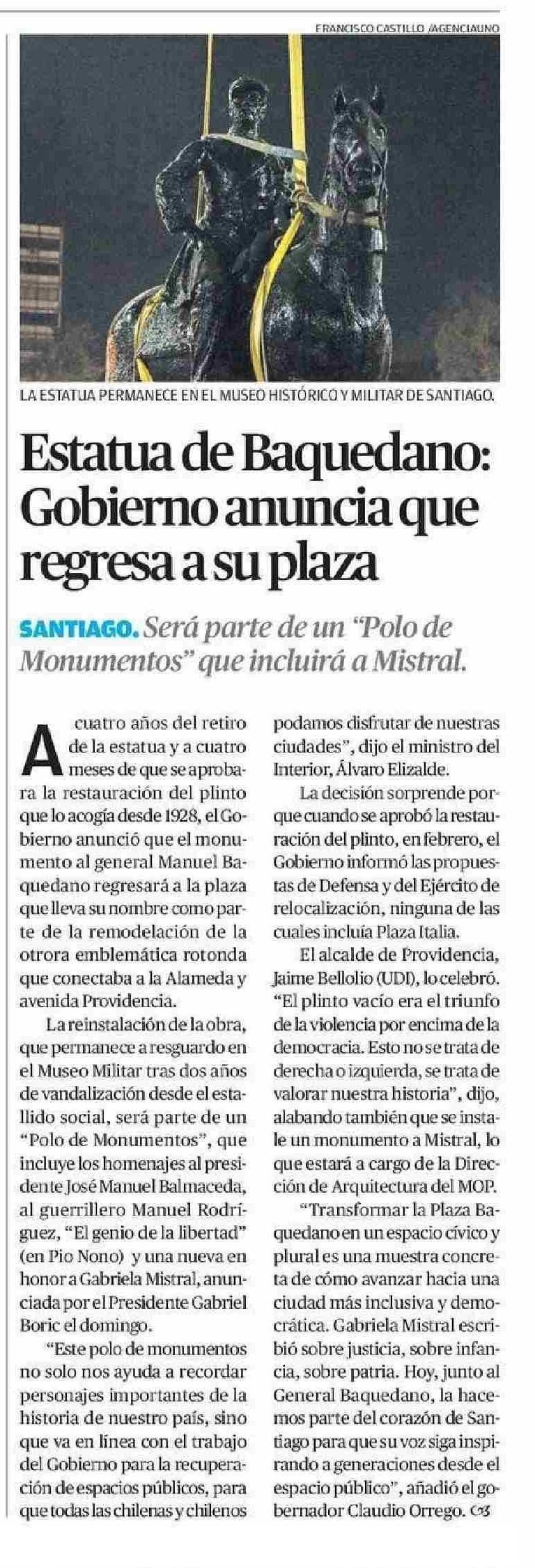| Título: | Estatua de Baquedano: Gobierno anuncia que regresa a su plaza |