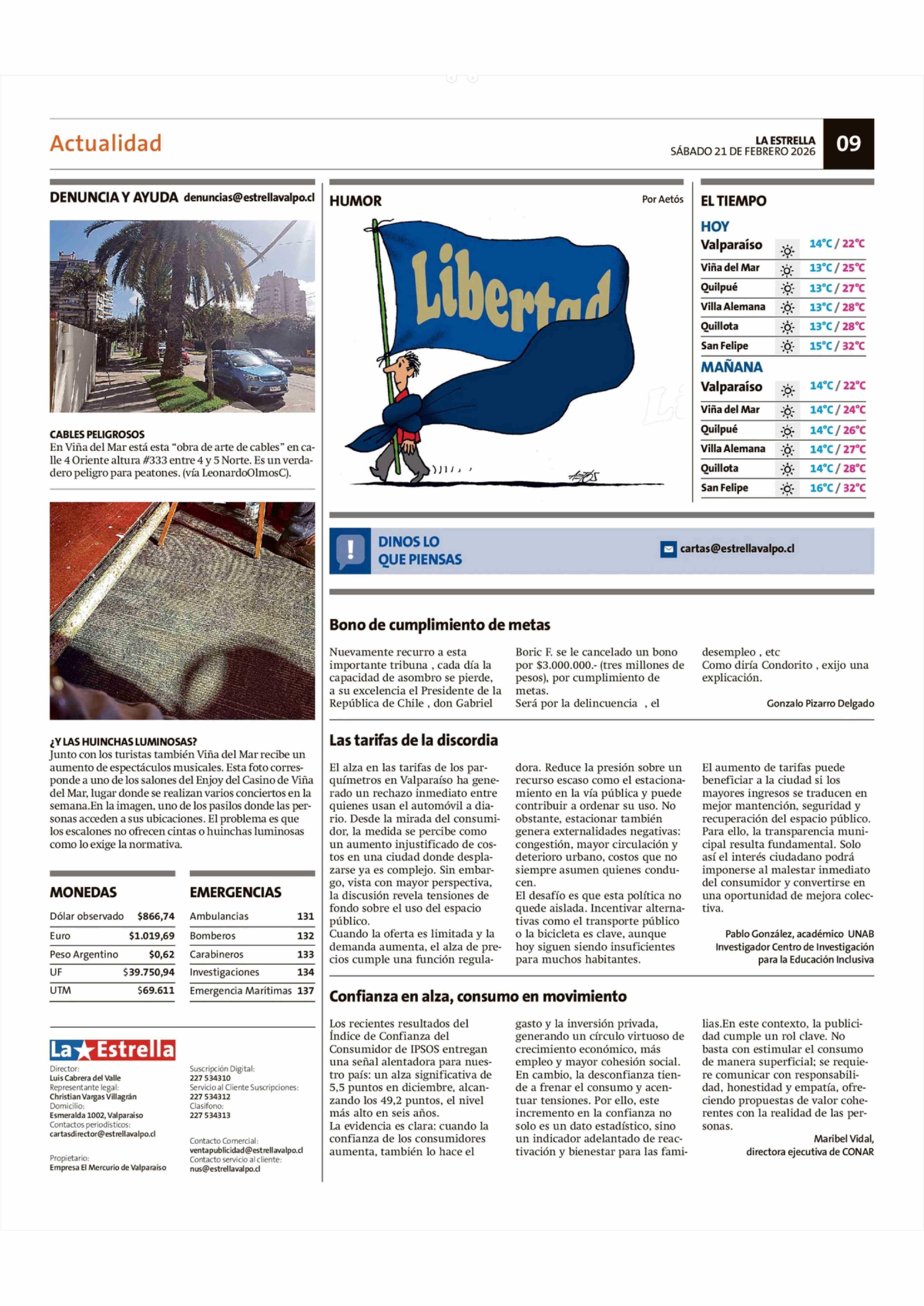 Columnas de Opinión: Las tarifas de la discordia 21-02-2026 La Estrella de Valparaíso |