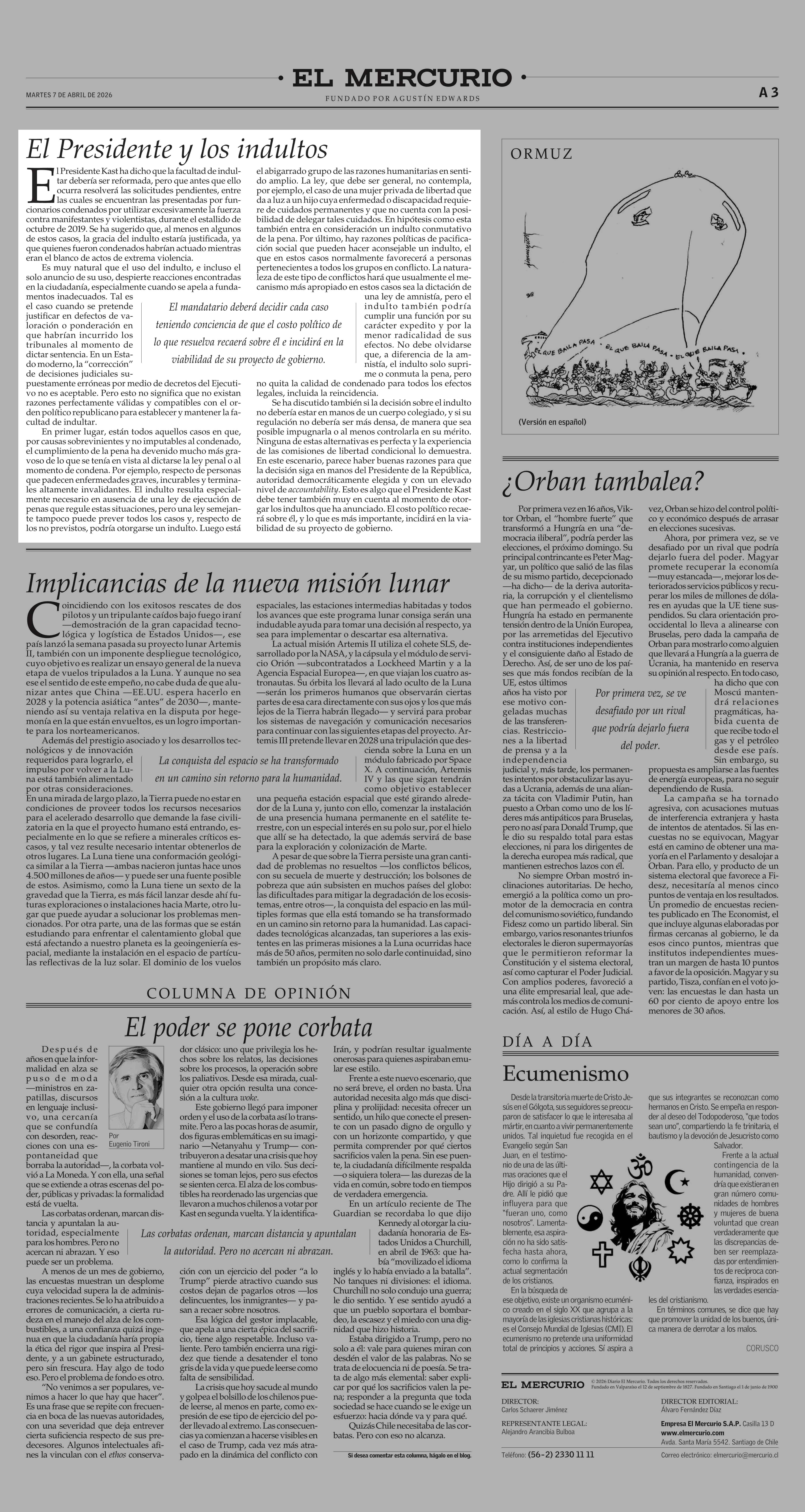 Editorial: El Presidente y los indultos 07-04-2026 El Mercurio |