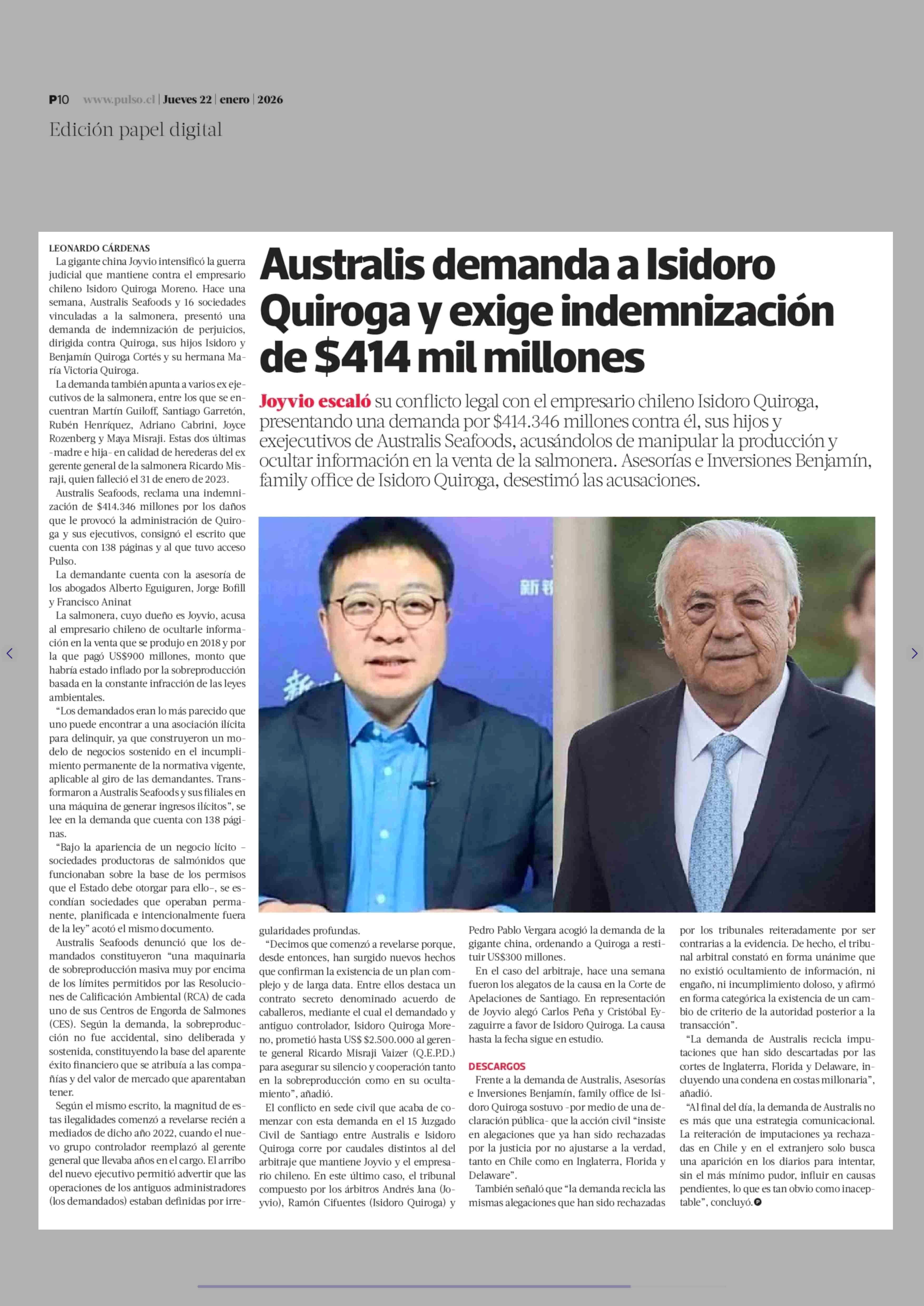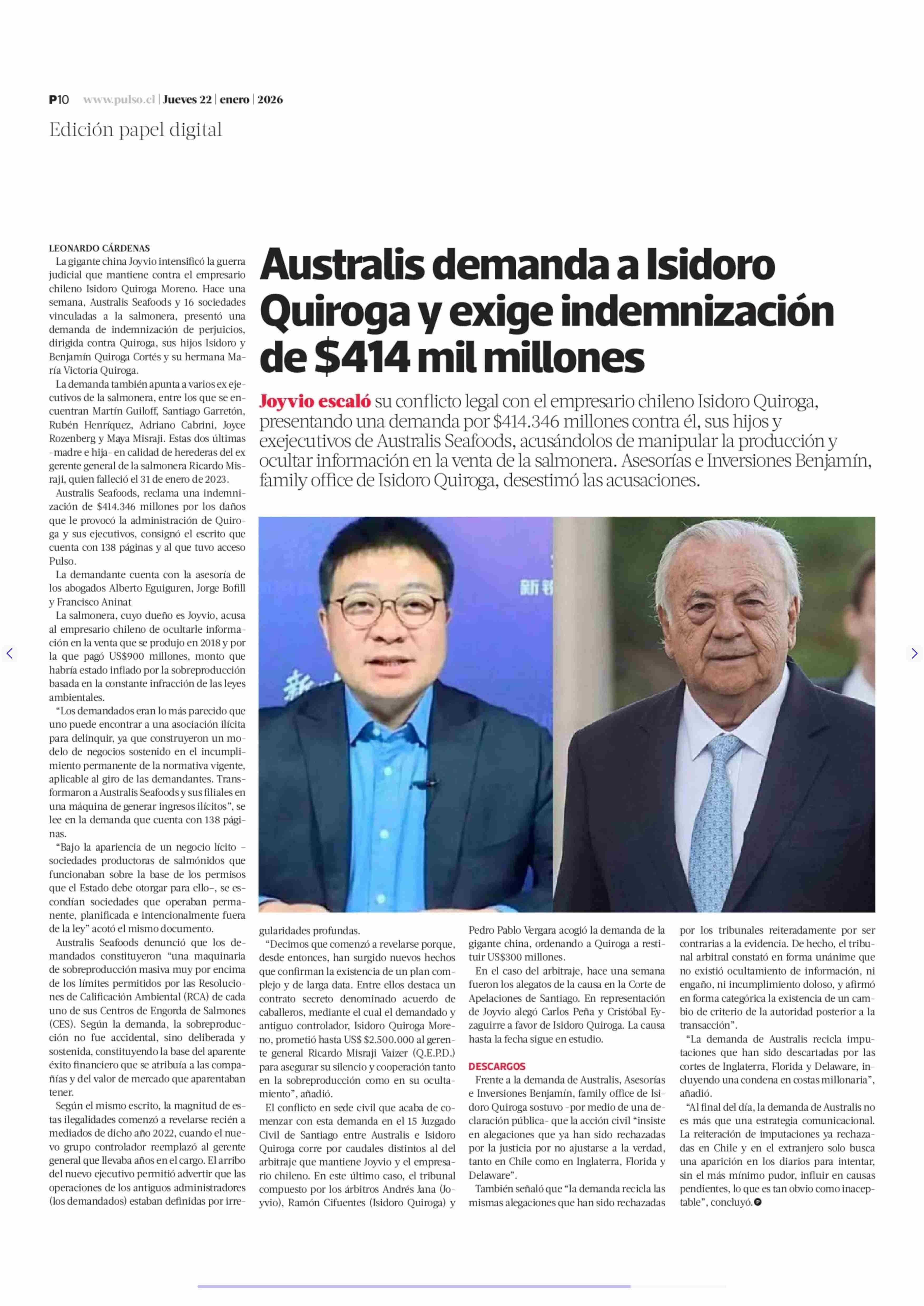 Australis demanda a Isidoro Quiroga y exige indemnización de $414 mil millones 22-01-2026 La Tercera |