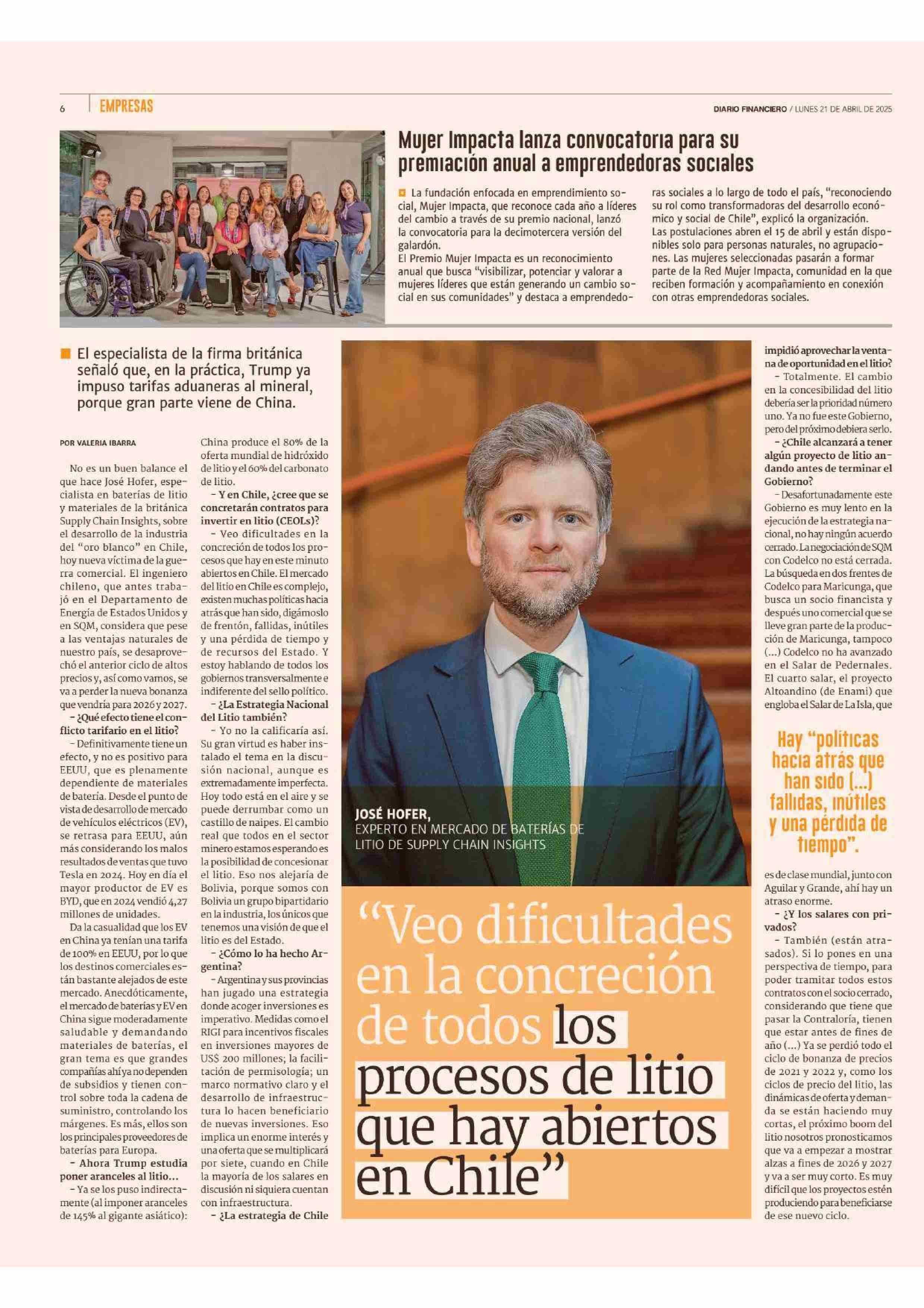 “Veo dificultades en la concreción de todos los procesos de litio que hay abiertos en Chile” 21-04-2025 Diario Financiero |
