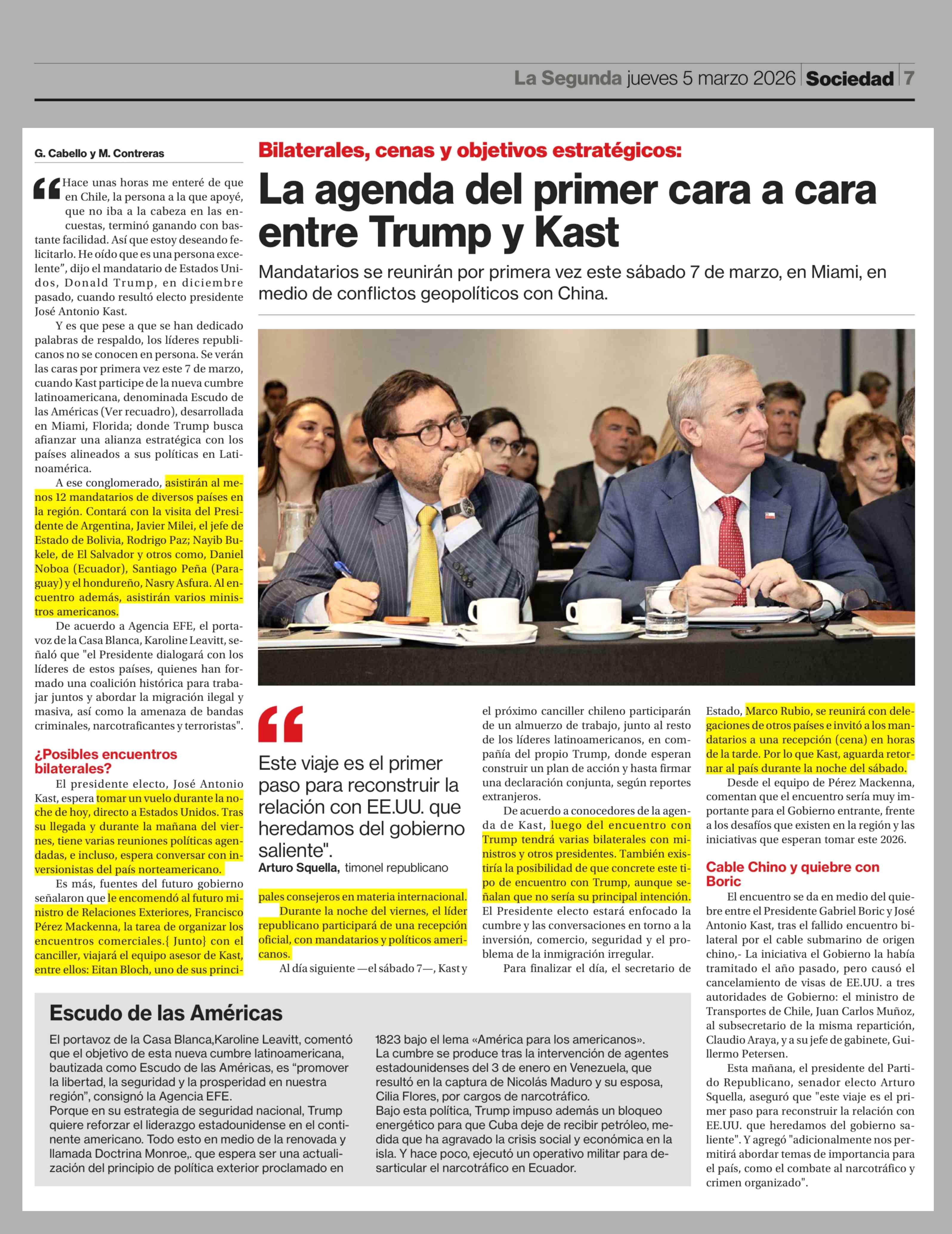 La agenda del primer cara a cara entre Trump y Kast 05-03-2026 La Segunda |