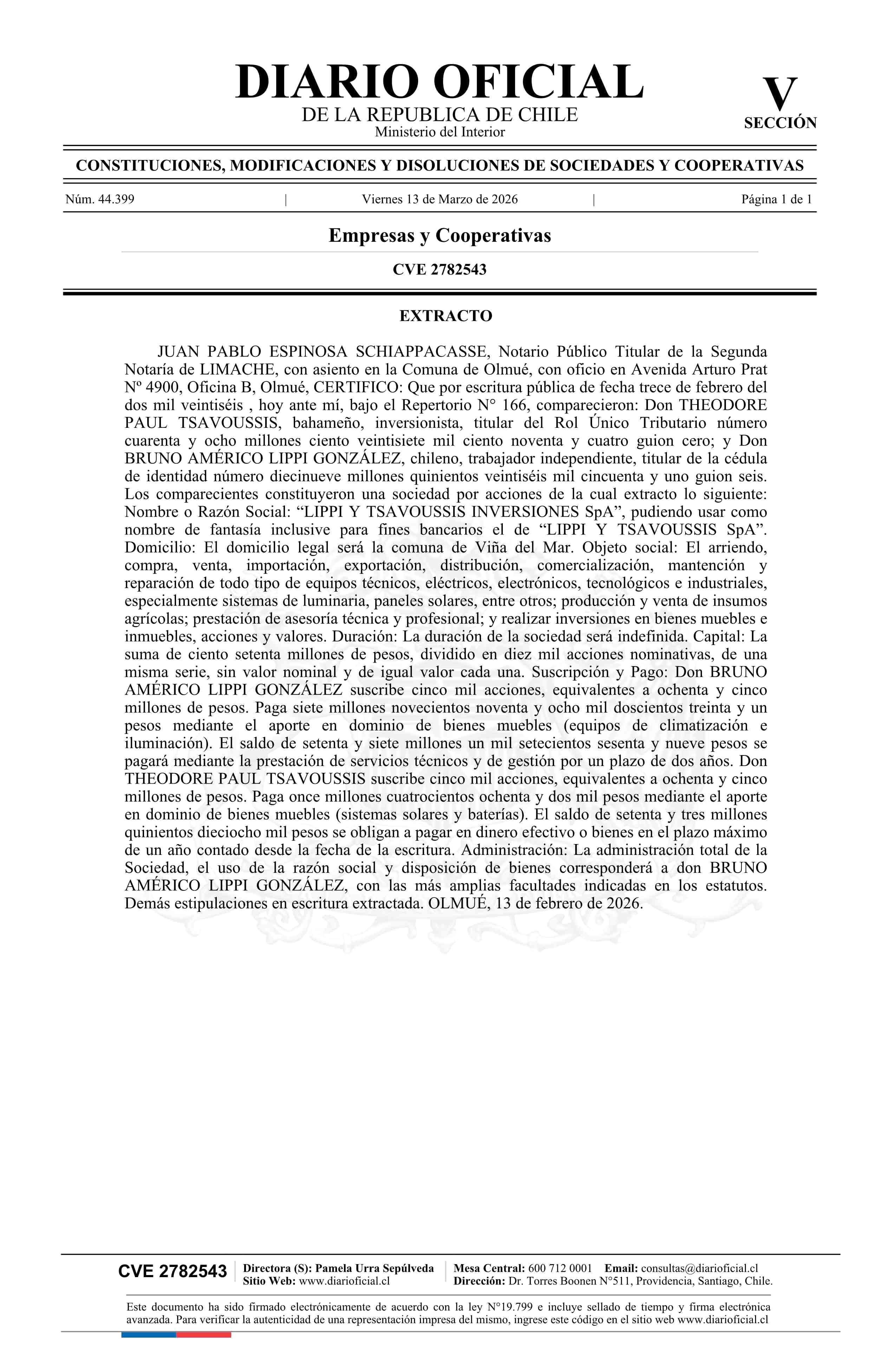 Título: LIPPI Y TSAVOUSSIS INVERSIONES SpA