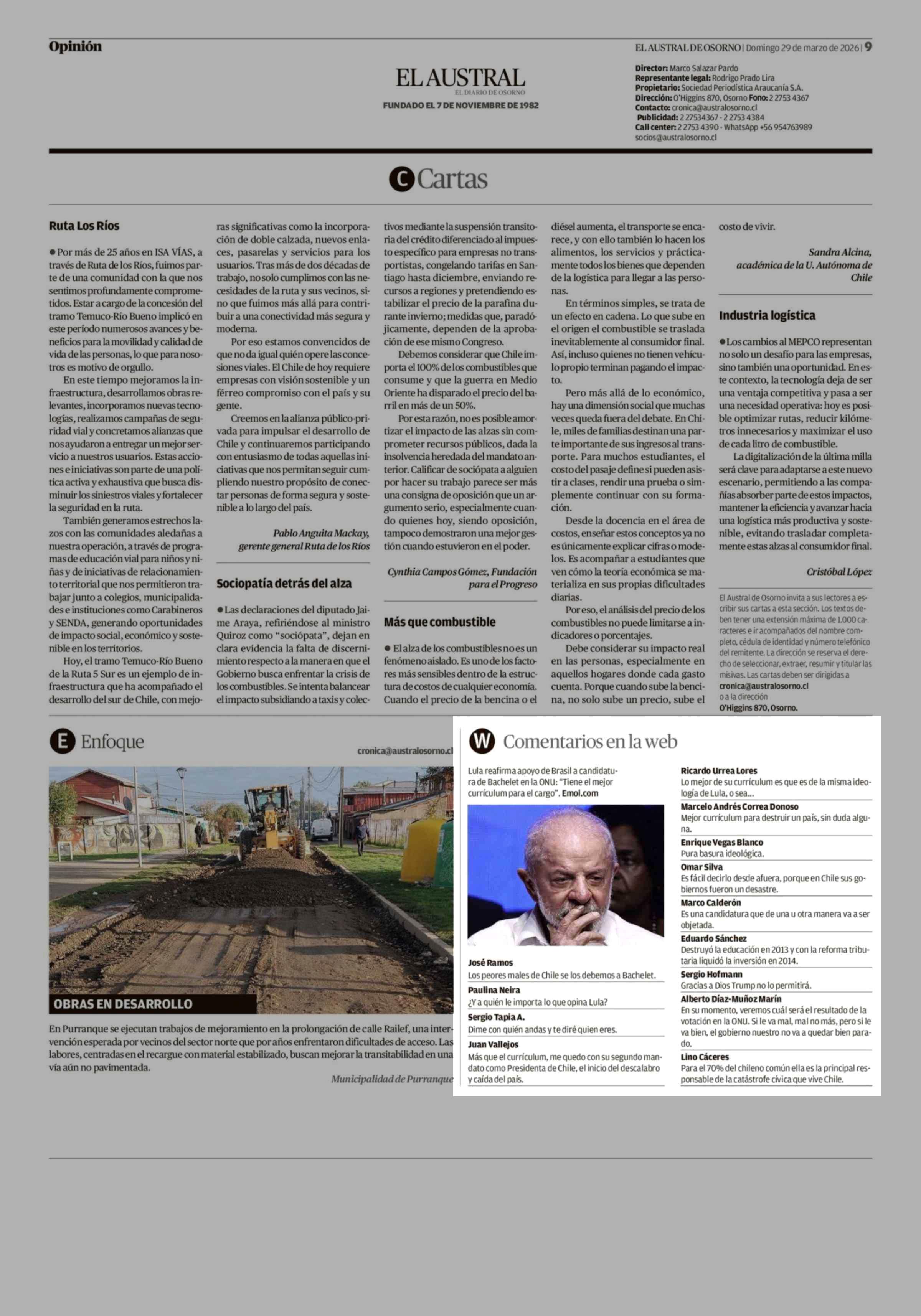 Comentarios en la web 29-03-2026 El Austral de Osorno |