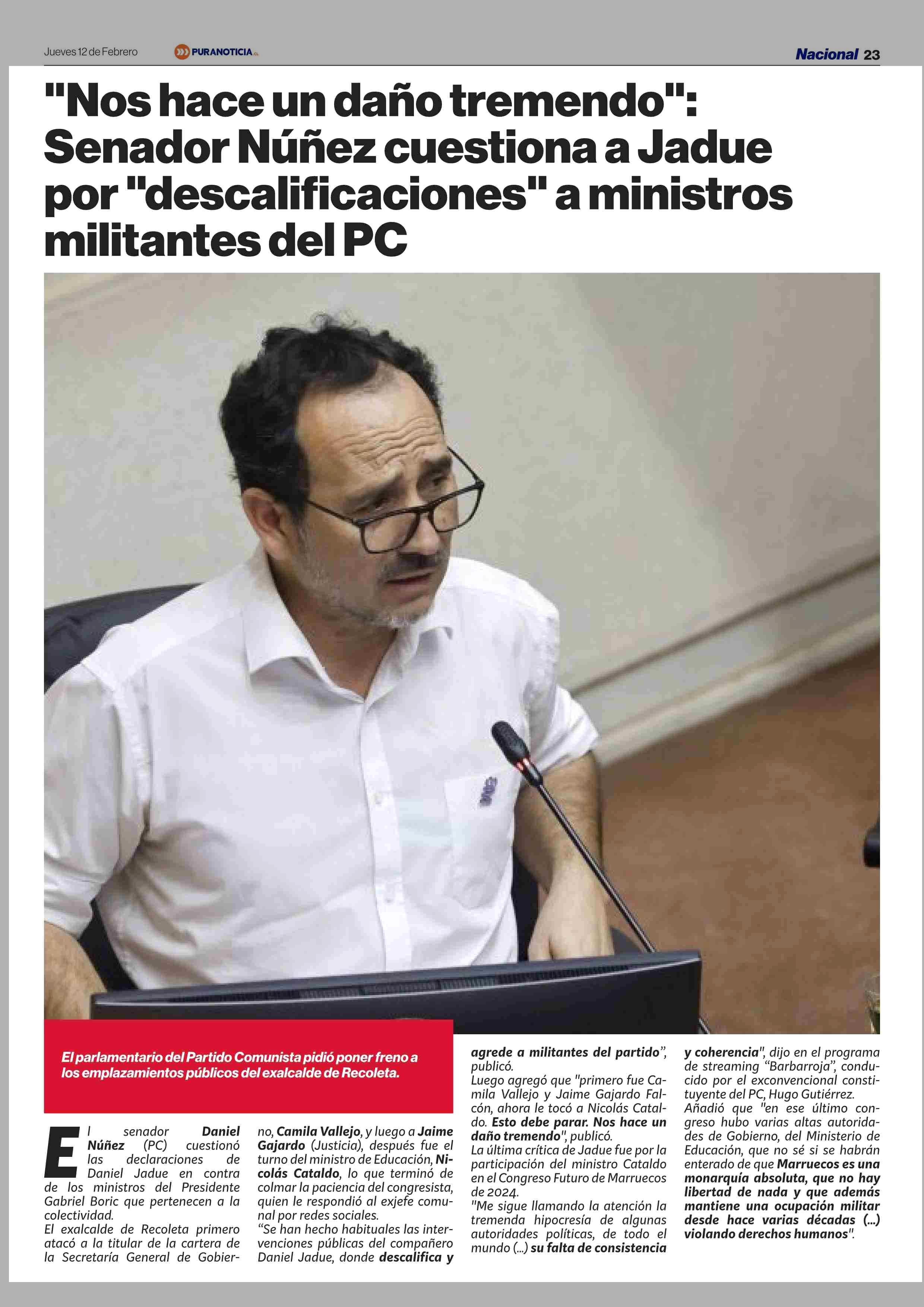 Título: “Nos hace un daño tremendo”: Senador Nunez cuestiona a Jadue “descalificaciones” a ministros militantes del PC