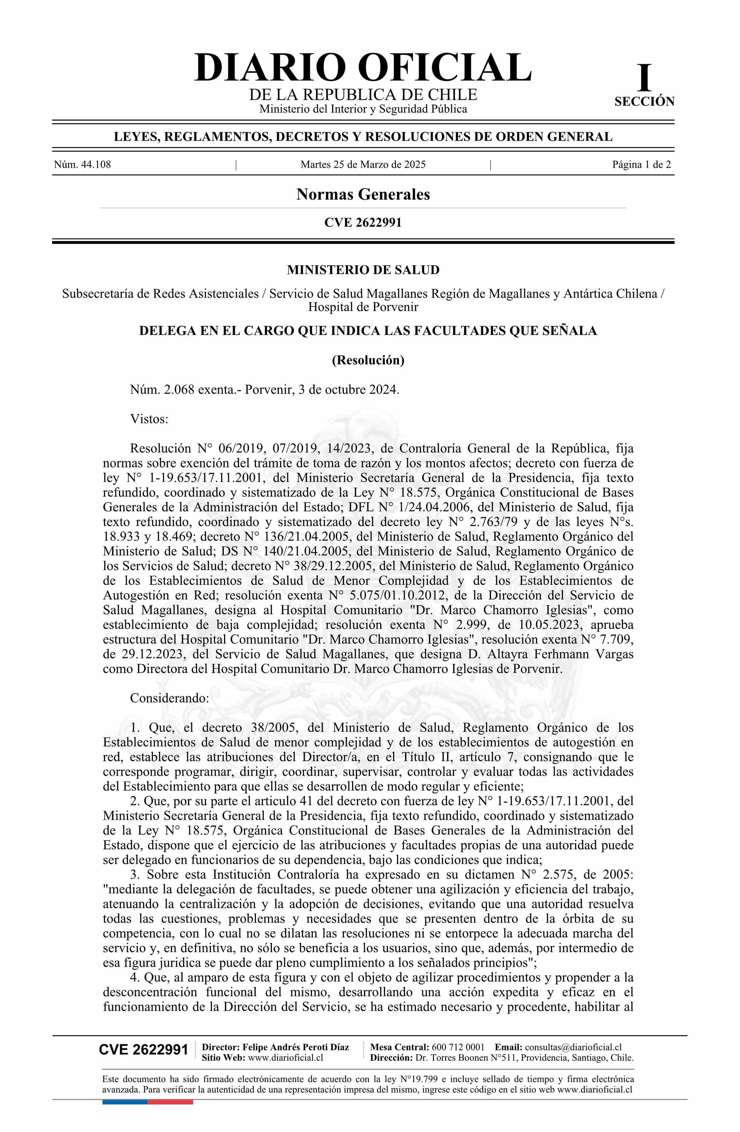 | Título: | Resolución exenta número 2.068, de 2024.- Delega en el cargo que indica las facultades que señala |
