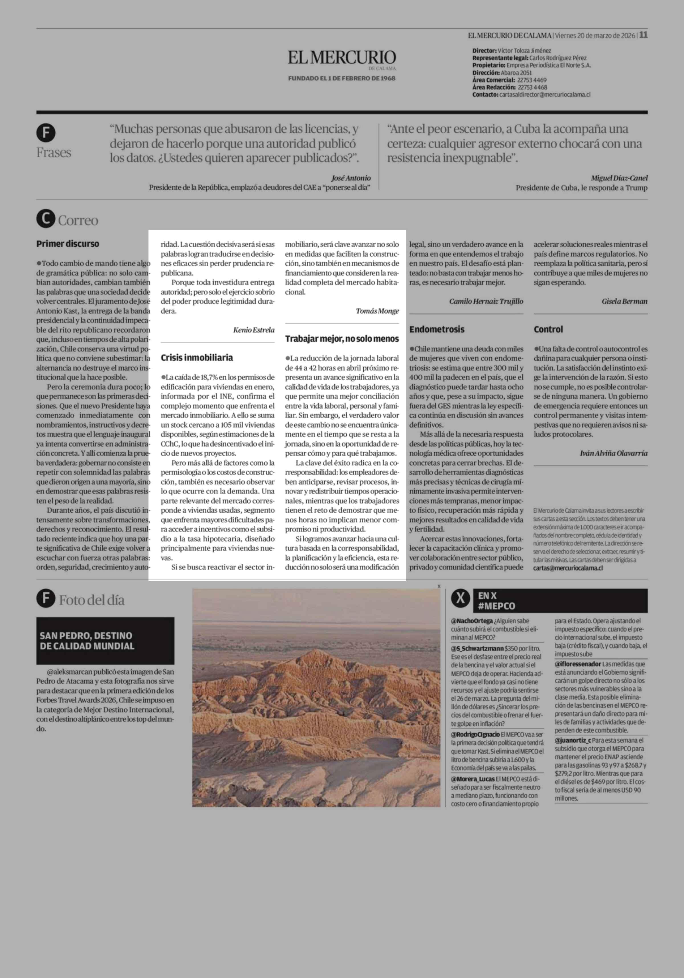 Cartas: Crisis inmobiliaria 20-03-2026 El Mercurio de Calama |