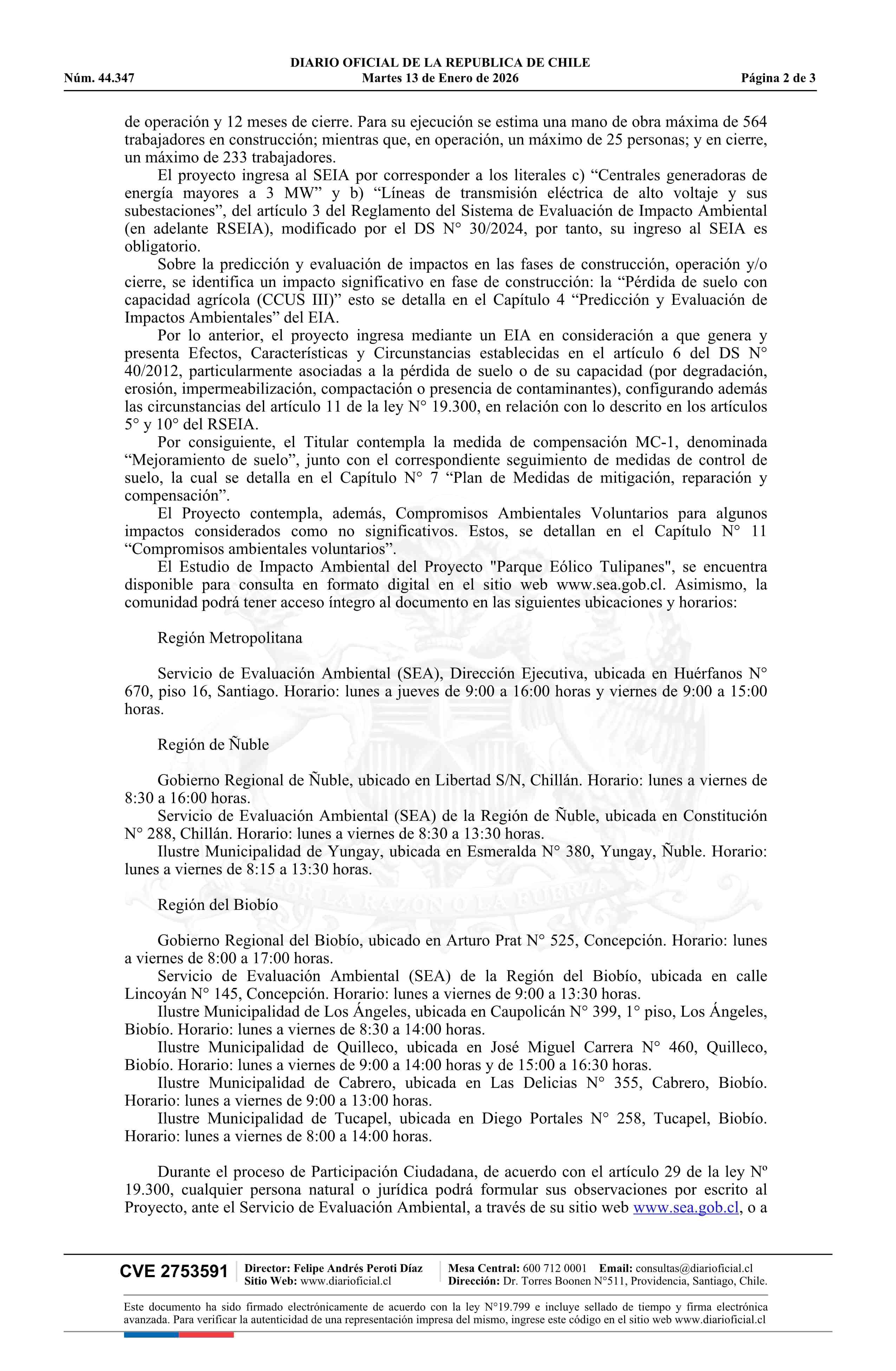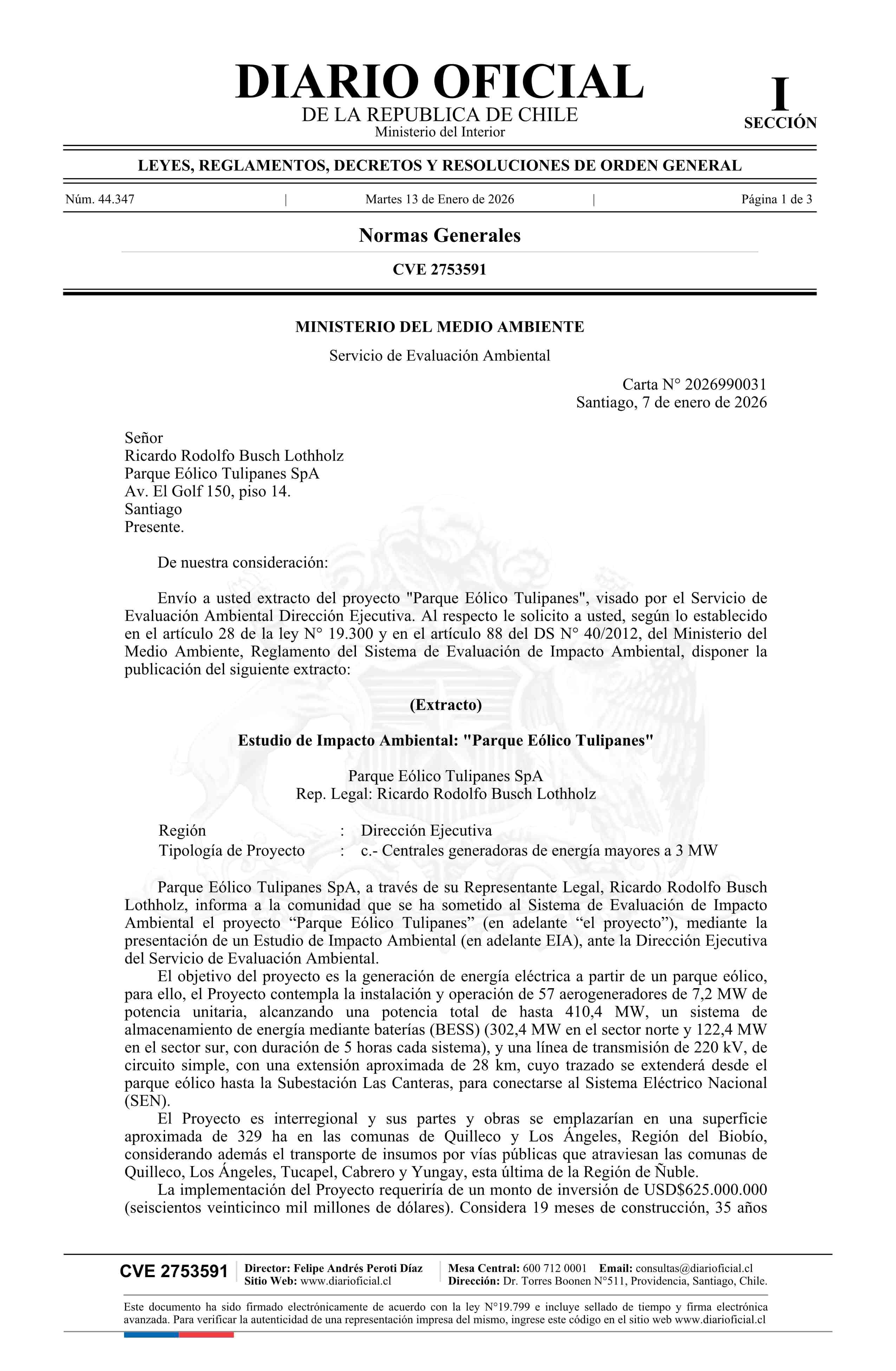 Extracto de Estudio de Impacto Ambiental proyecto Parque Eólico Tulipanes 13-01-2026 DIARIO OFICIAL CHILE - BOLETÍN OFICIAL DE MINERÍA |