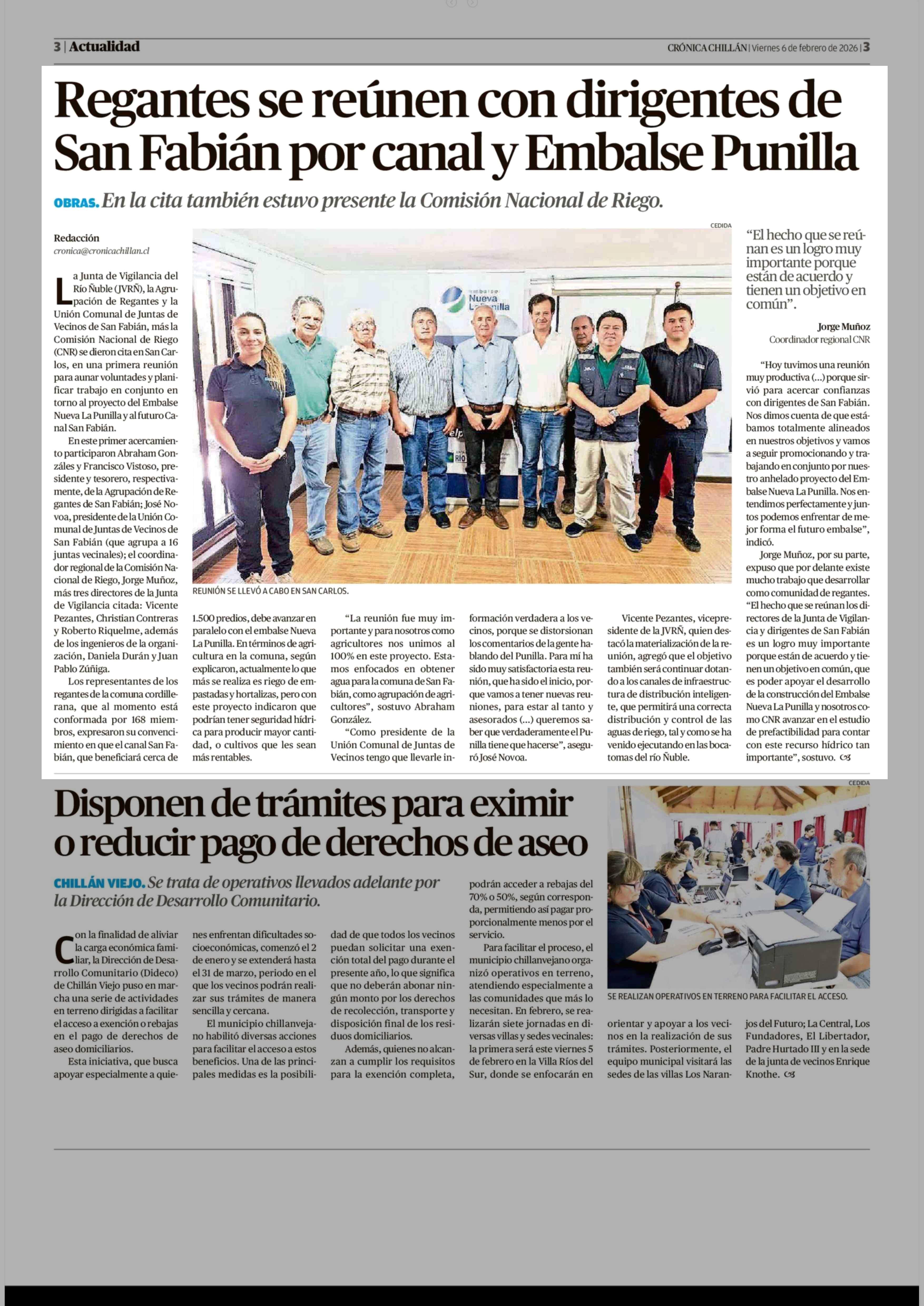 Título: Regantes se reúnen con dirigentes de San Fabián por canal y Embalse Punilla