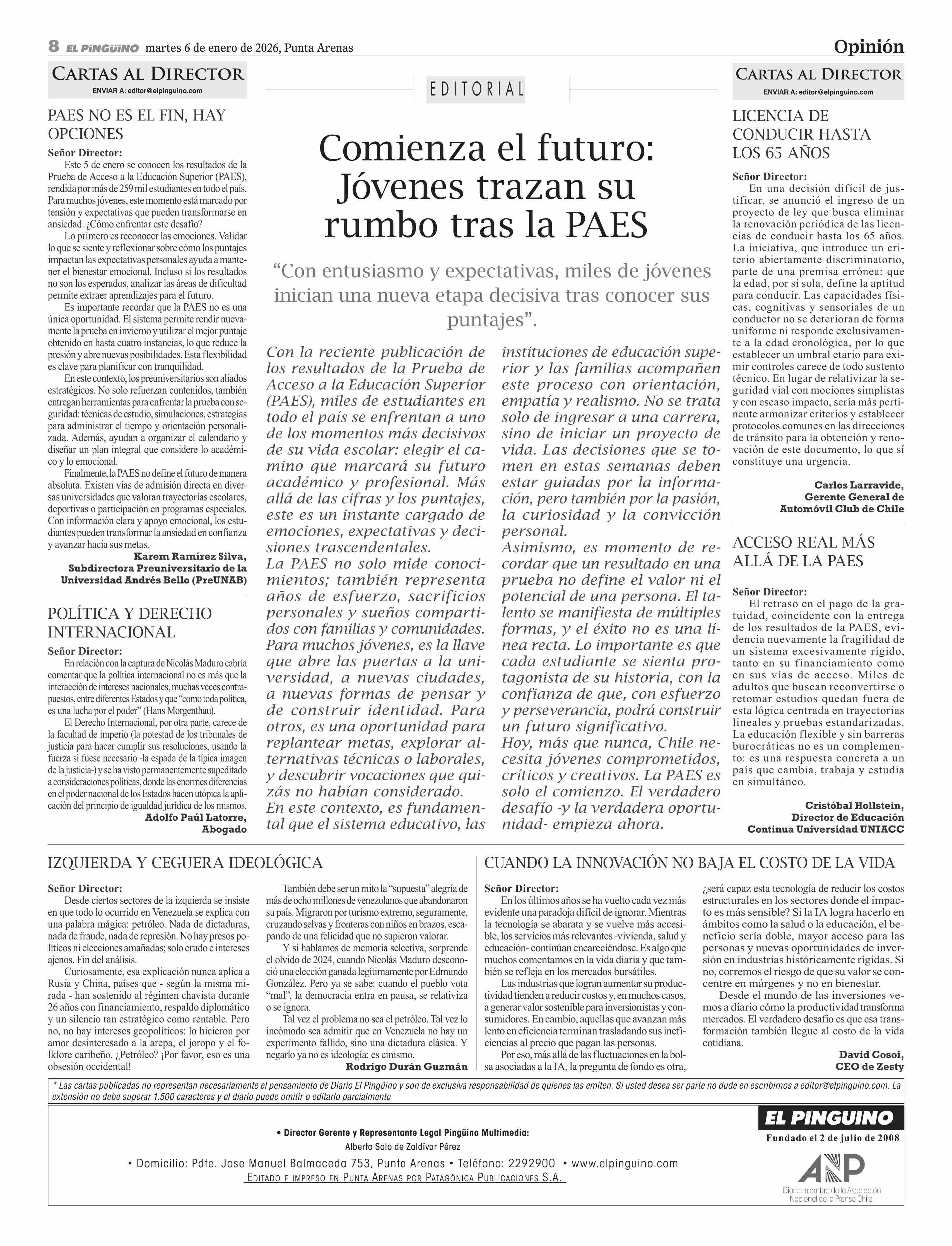 Cartas: PAES NOES EL FIN, HAY OPCIONES 06-01-2026 El Pingüino |