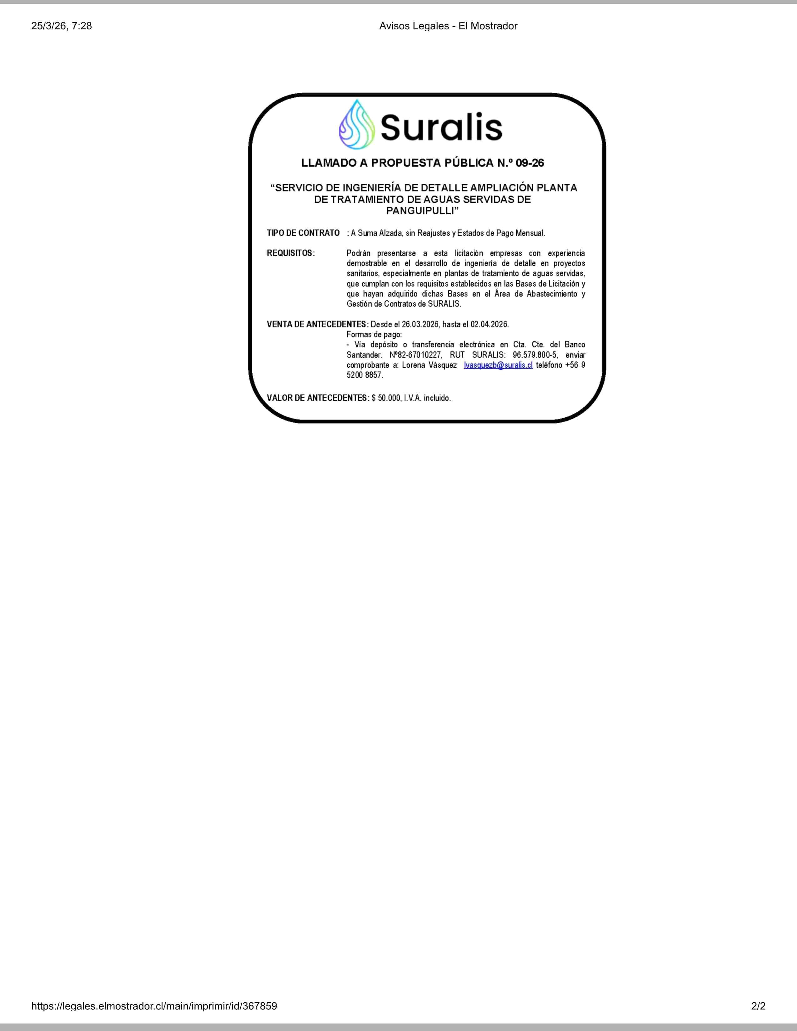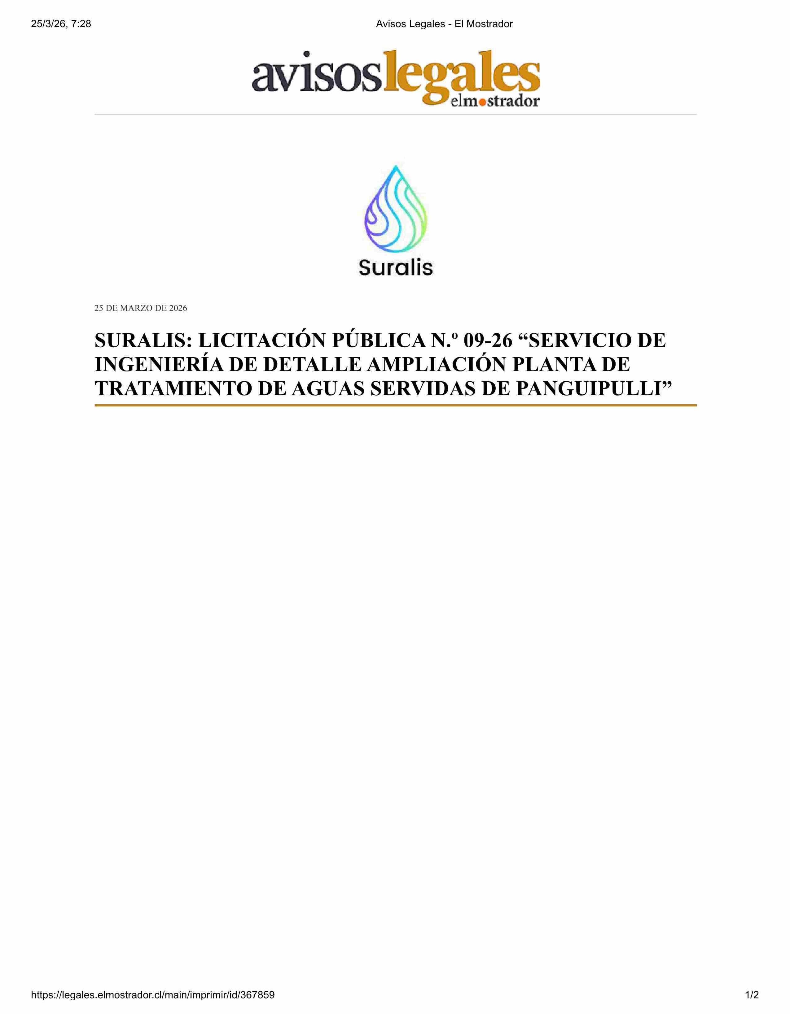 SURALIS LICITACIÓN PÚBLICA N.° 09-26 “SERVICIO DE INGENIERIA DE DETALLE AMPLIACION PLANTA DE TRATAMIENTO DE AGUAS SERVIDAS DE PANGUIPULLI” 25-03-2026 El Mostrador - Avisos Legales |