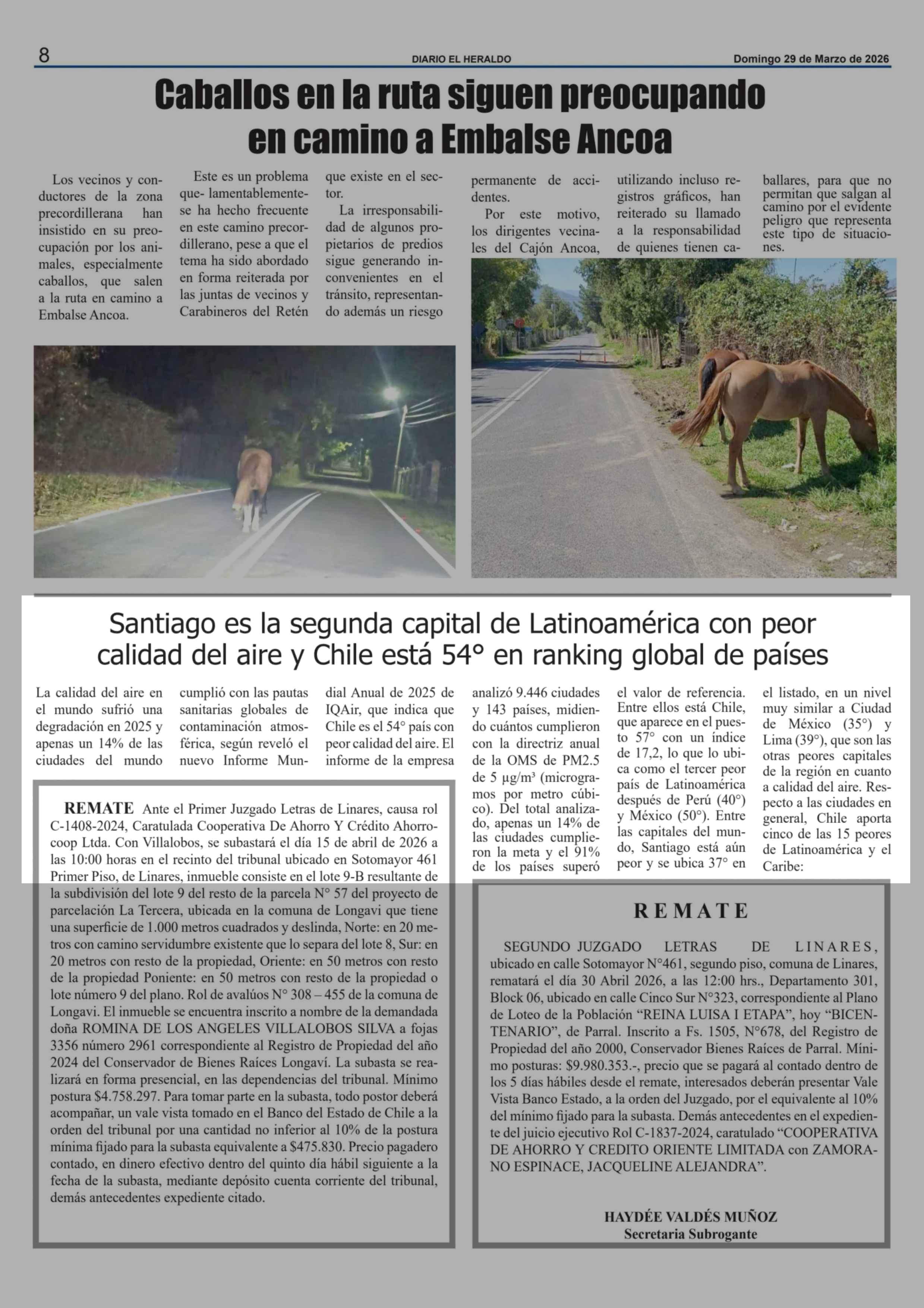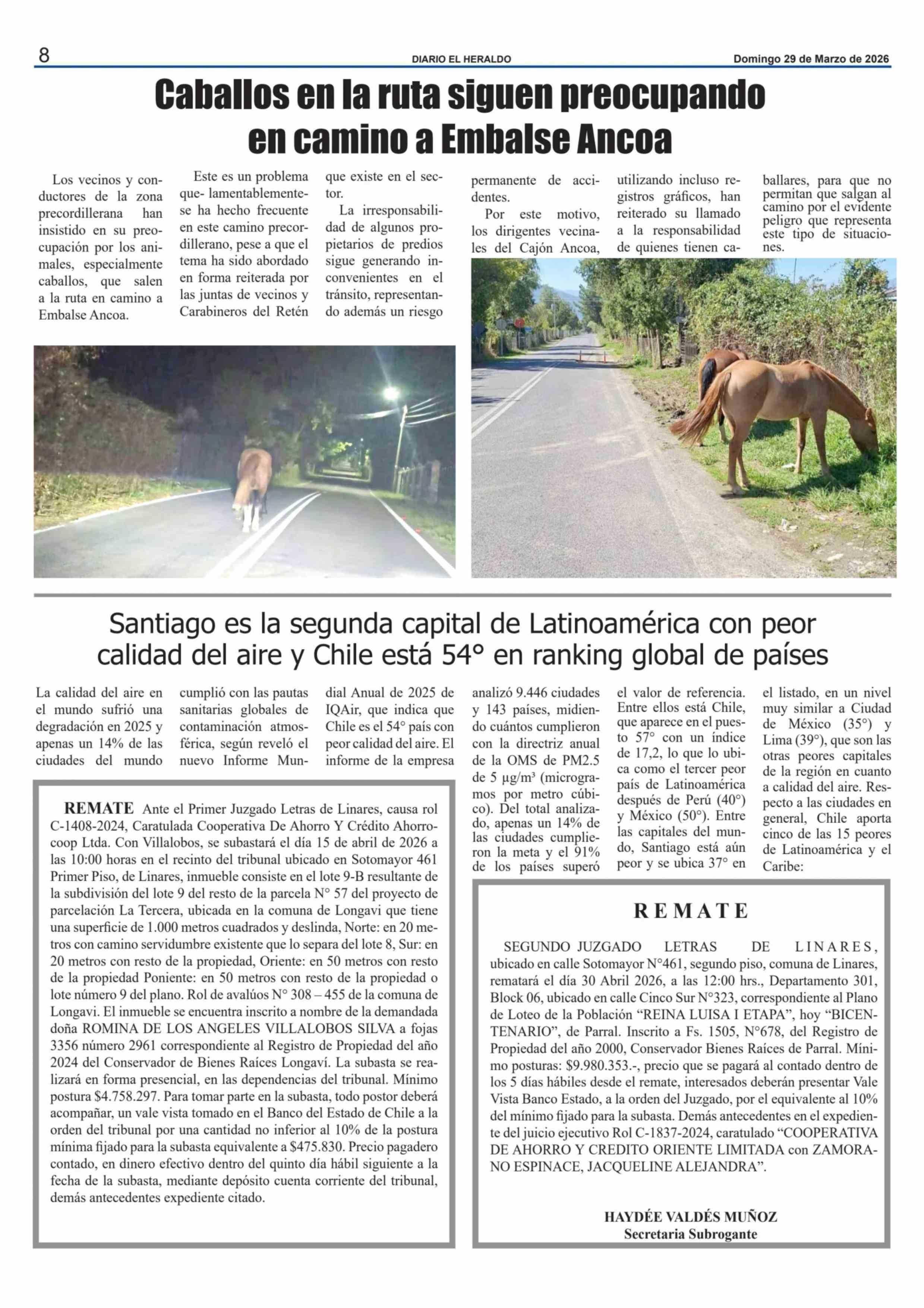 Santiago es la segunda capital de Latinoamérica con peor calidad del aire y Chile está 54º en ranking global de países 29-03-2026 El Heraldo |