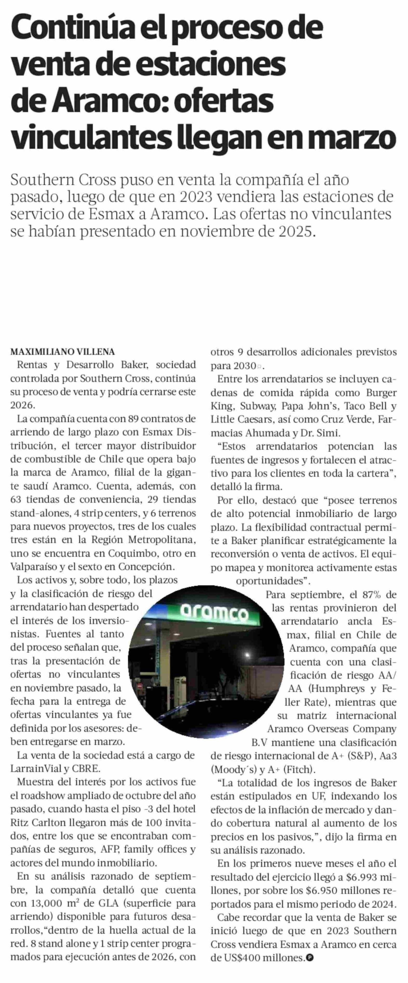 Continúa el proceso de venta de estaciones de Aramco: ofertas vinculantes llegan en marzo 16-01-2026 La Tercera |